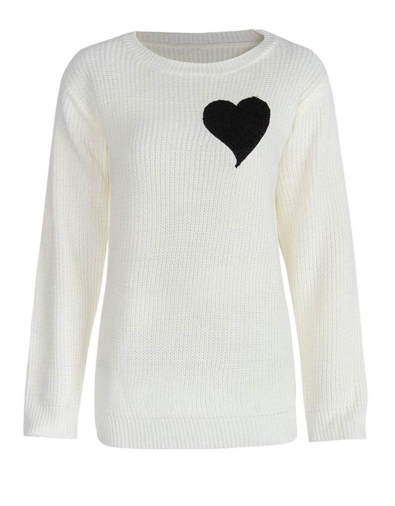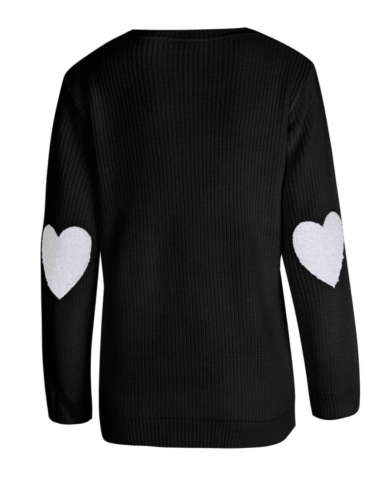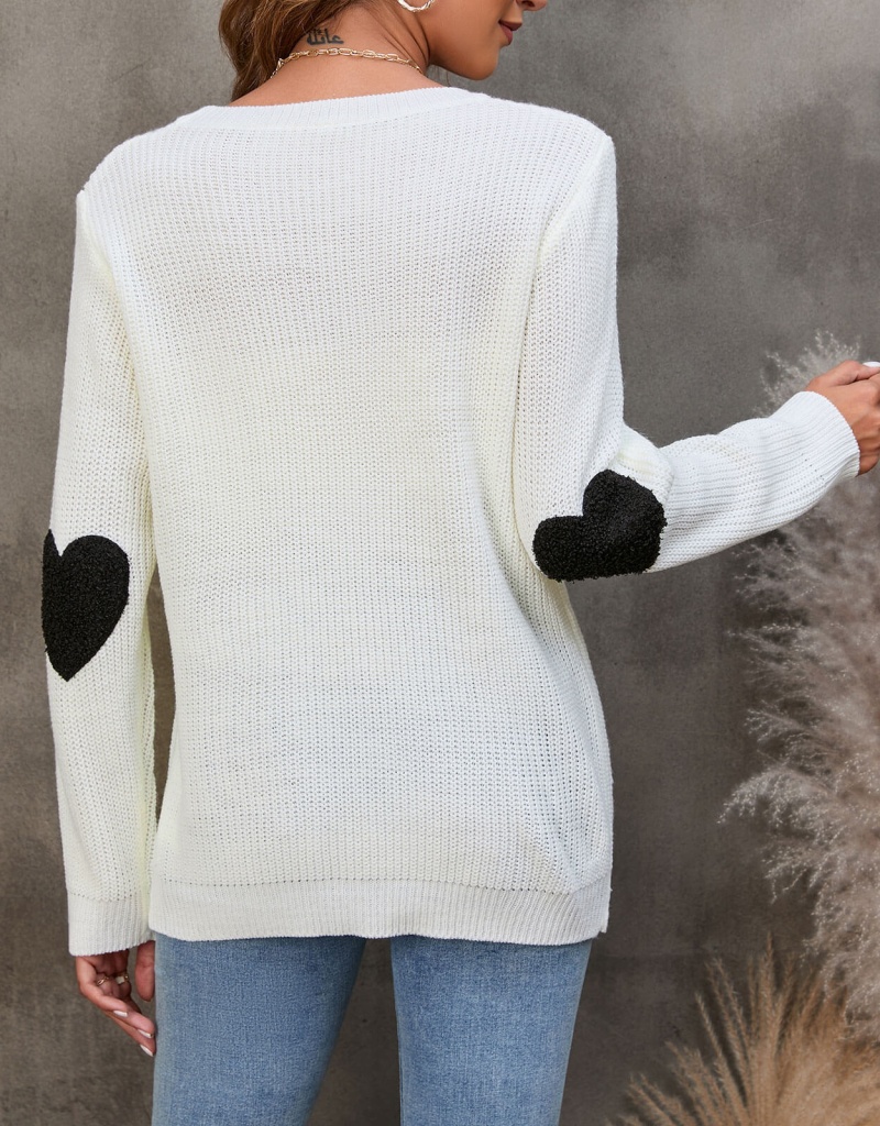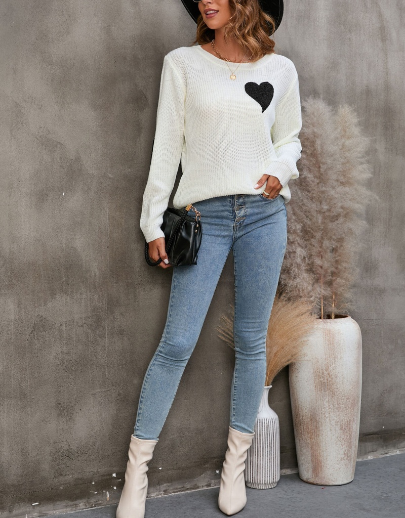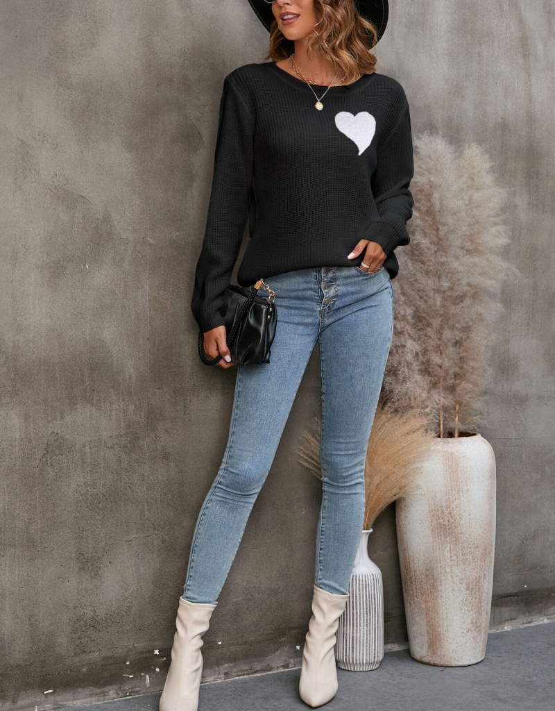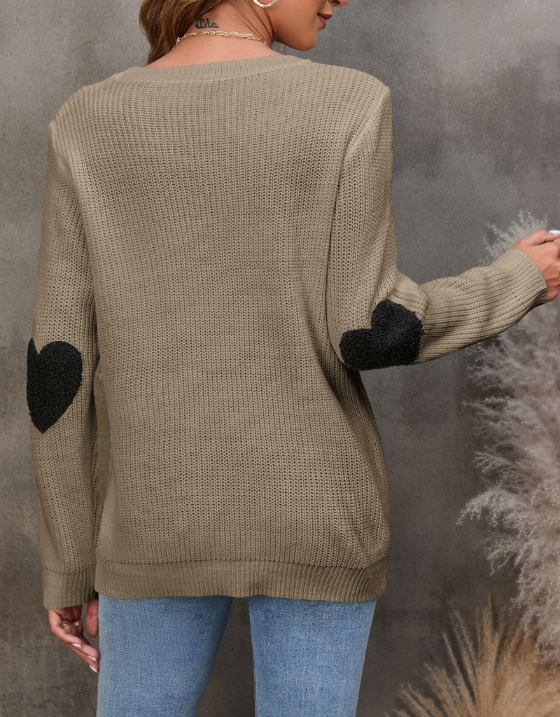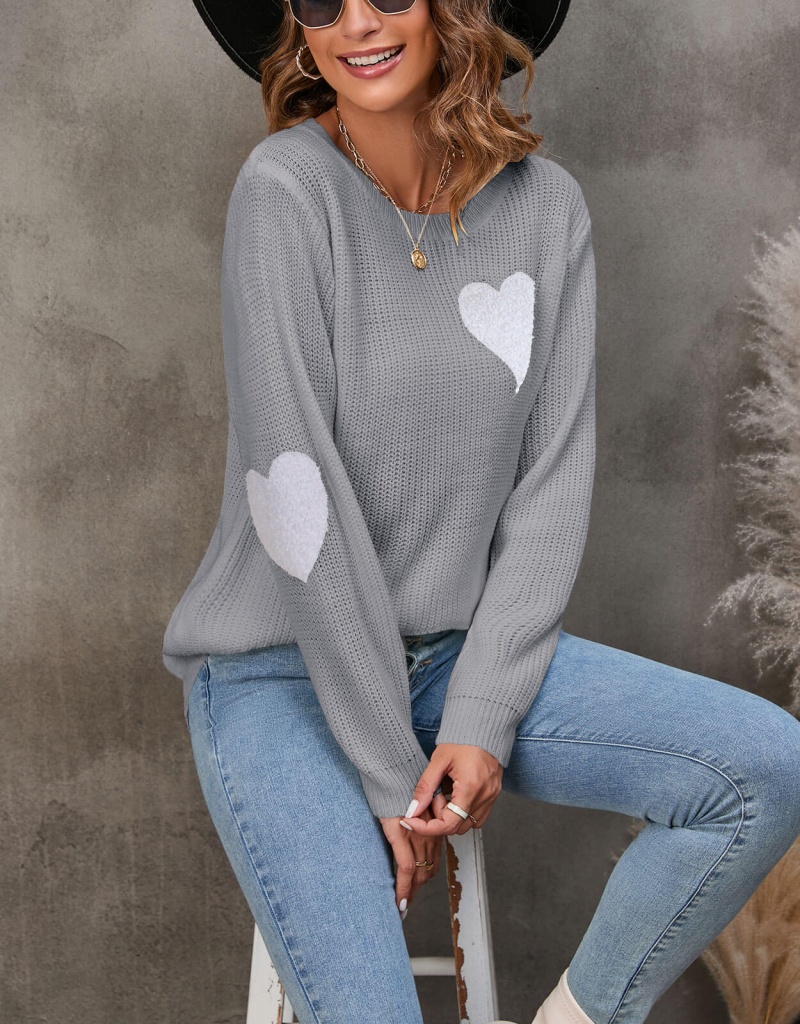 秋冬季新款 跨境圆领纯色小爱心套头宽松毛衣欧美针织衫女