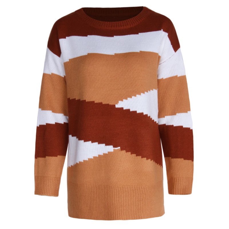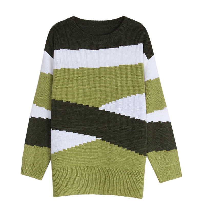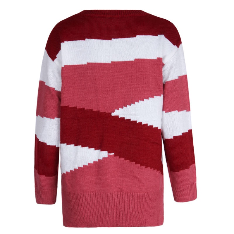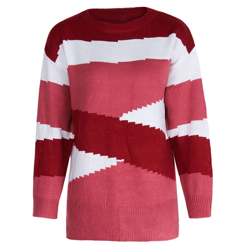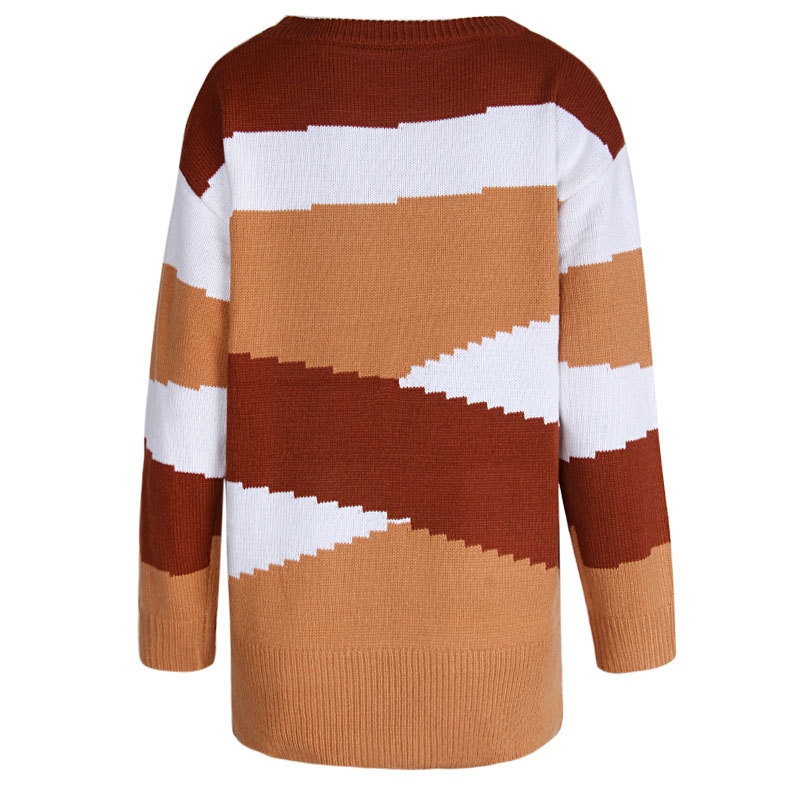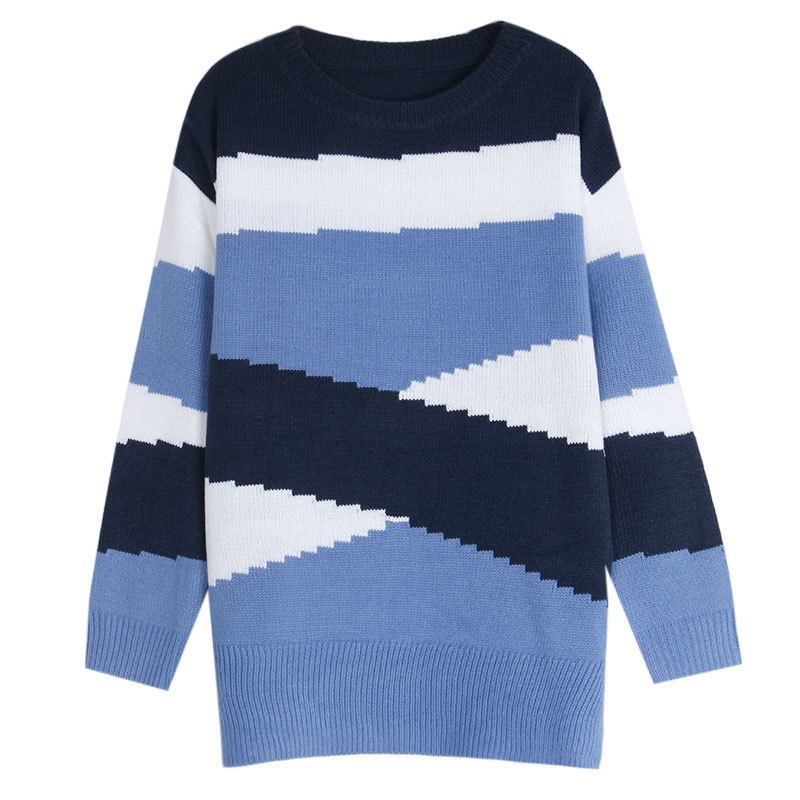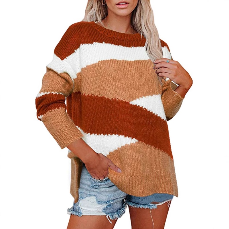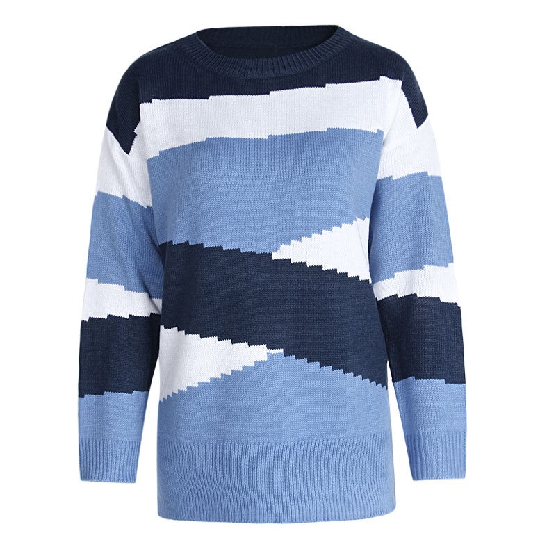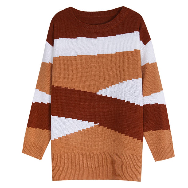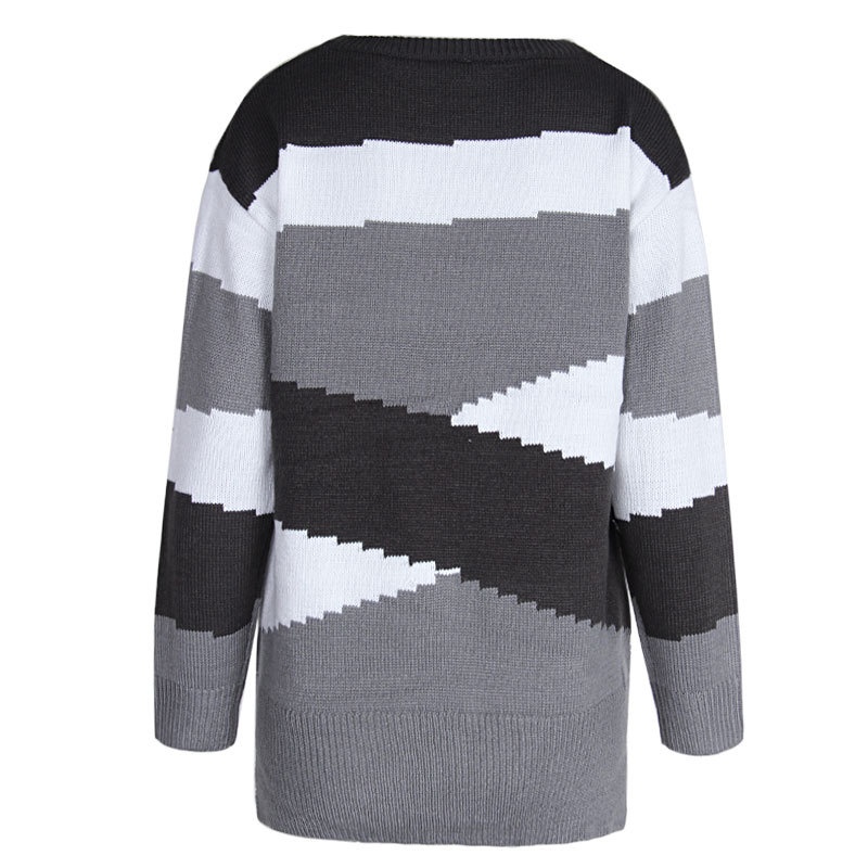 秋冬时尚新款女装套头针织衫欧美宽松不规则条纹拼色毛衣女