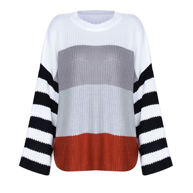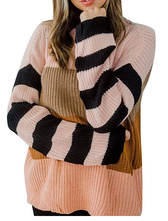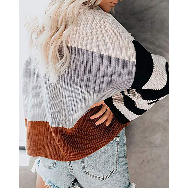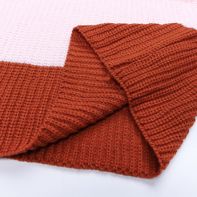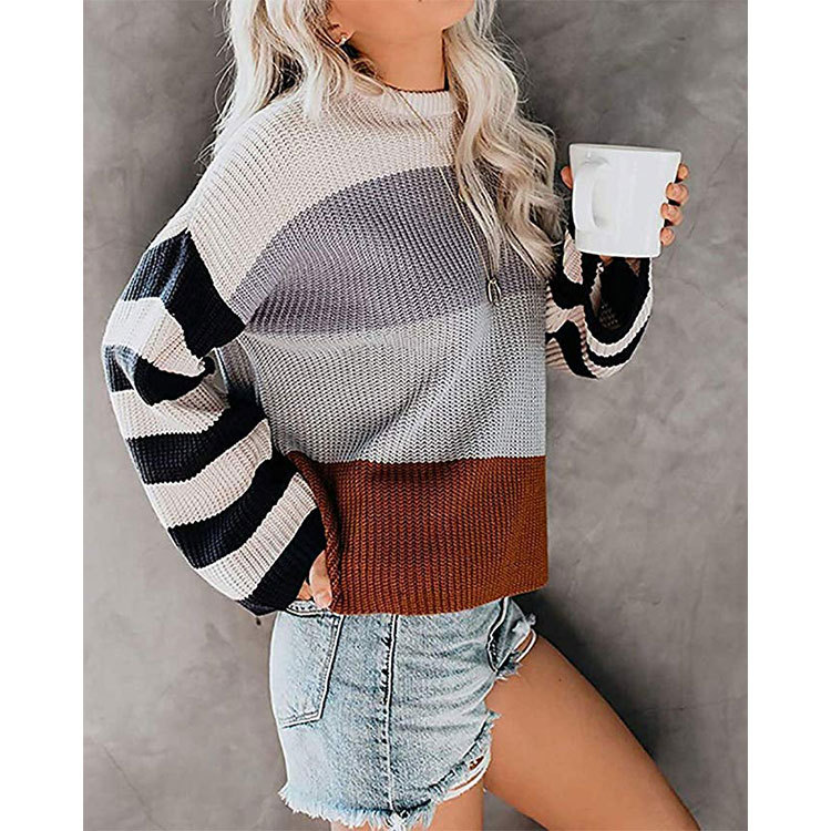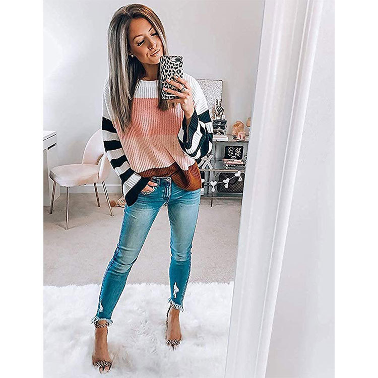 秋冬新款女装针织圆领上衣间色拼接针织衫套头欧美跨境毛衣