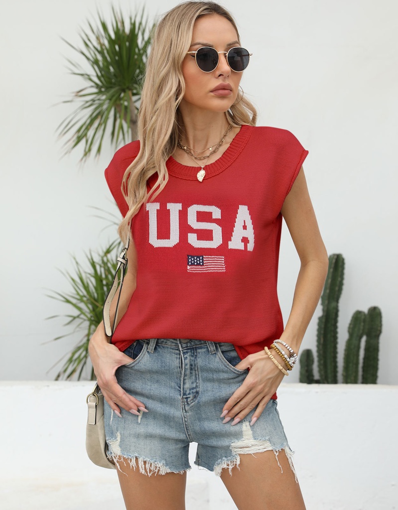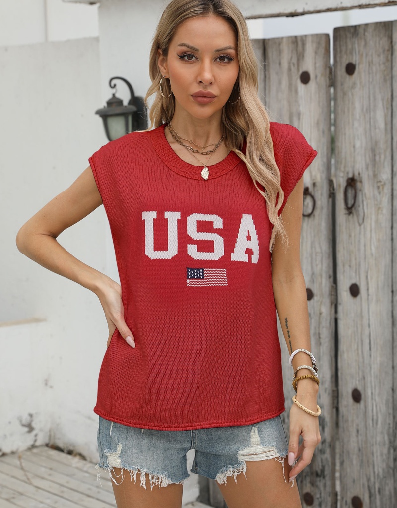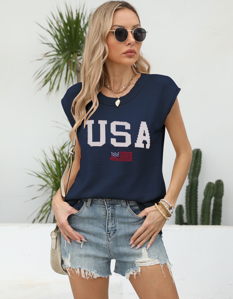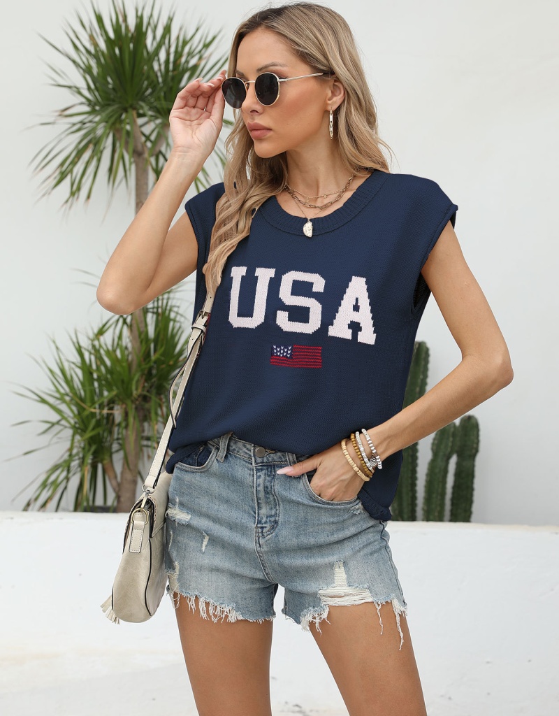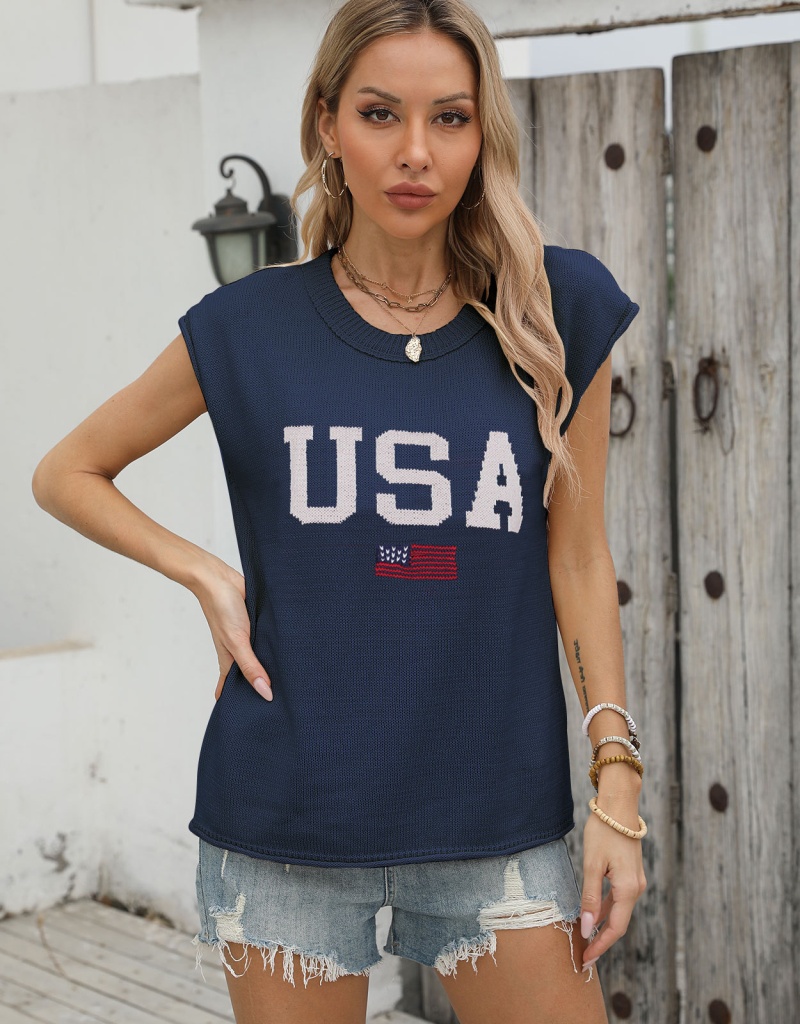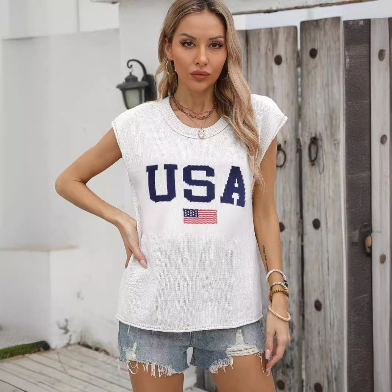 新款跨境美国国旗毛衣欧美时尚圆领无袖提花加刺绣上衣女厂