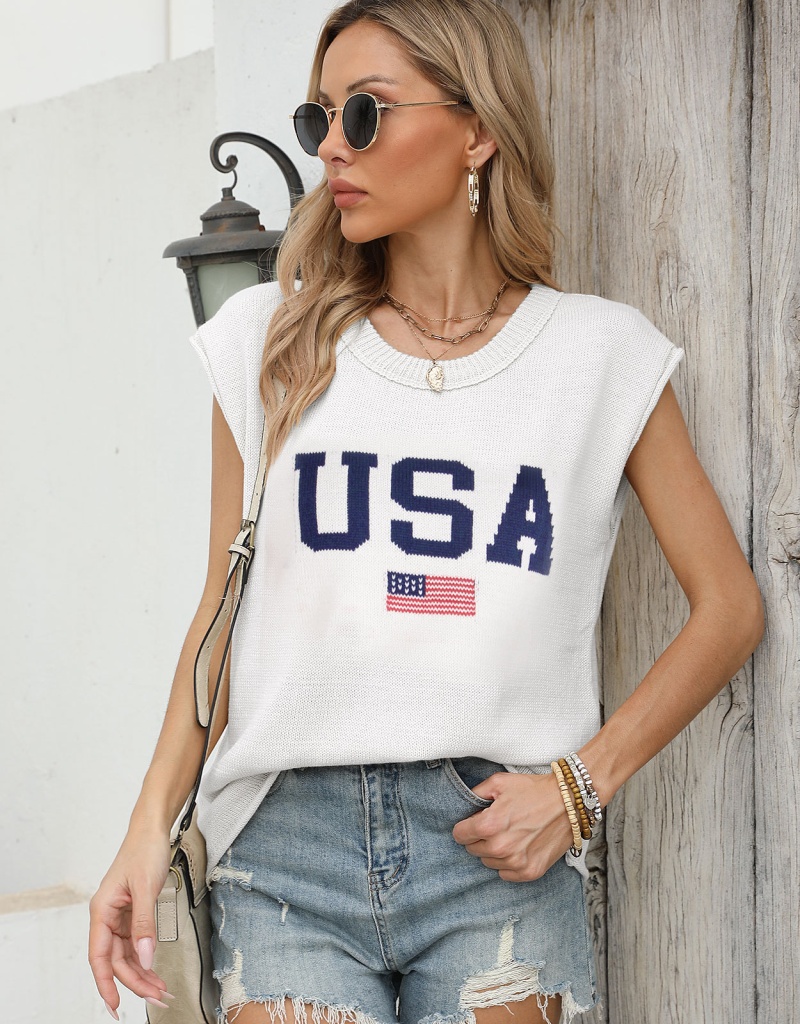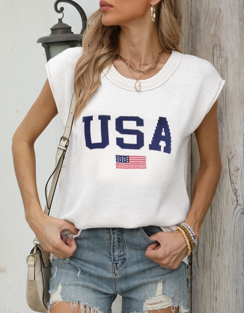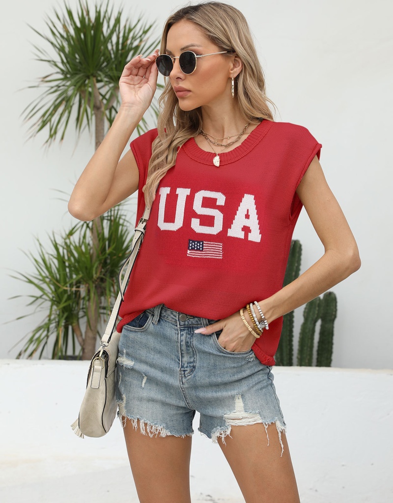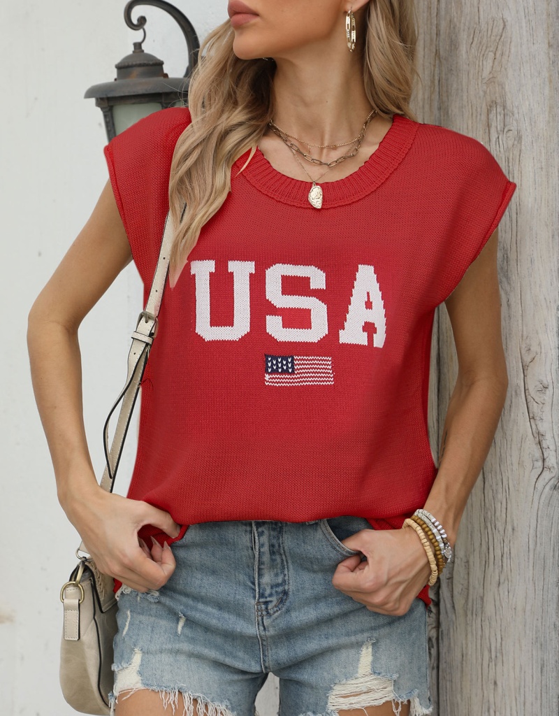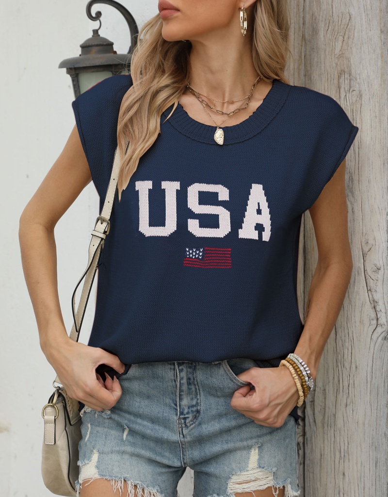 新款跨境美国国旗毛衣欧美时尚圆领无袖提花加刺绣上衣女厂