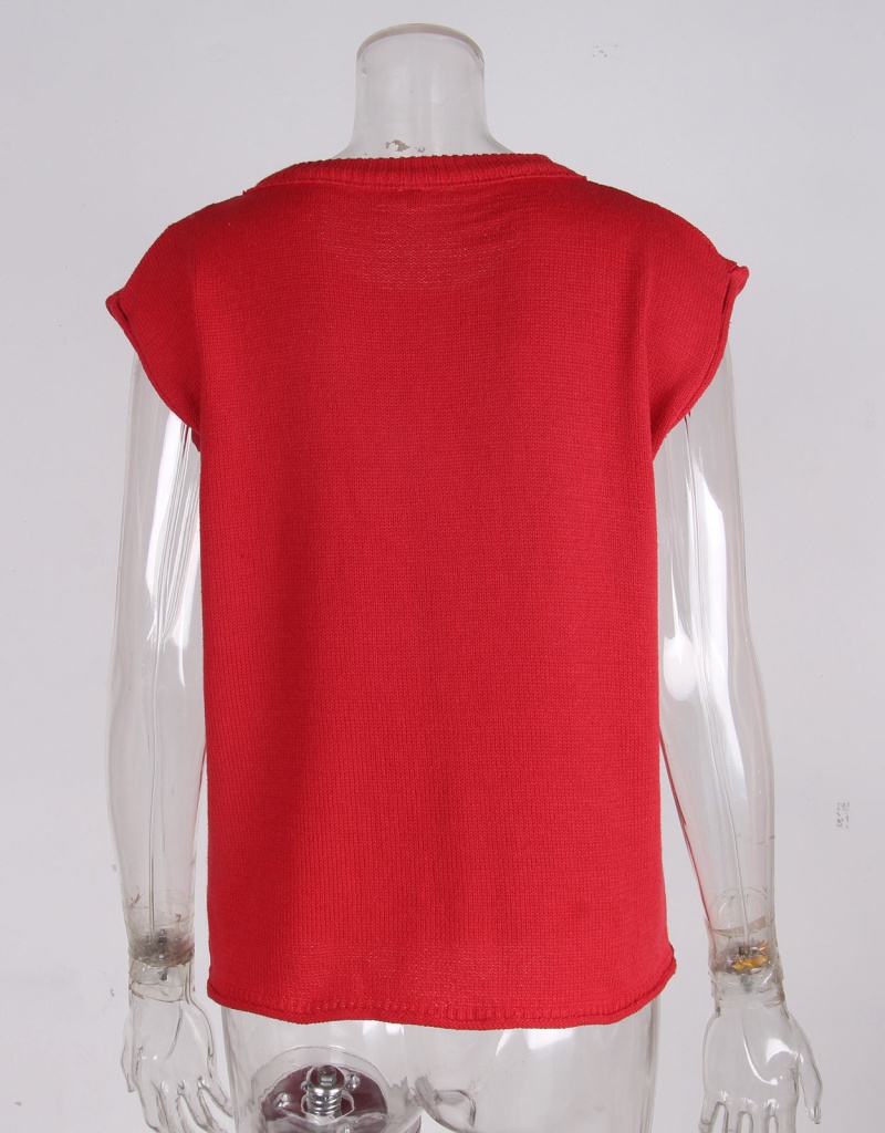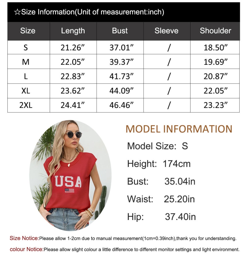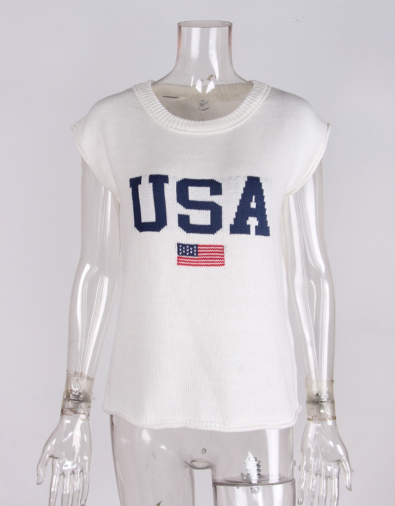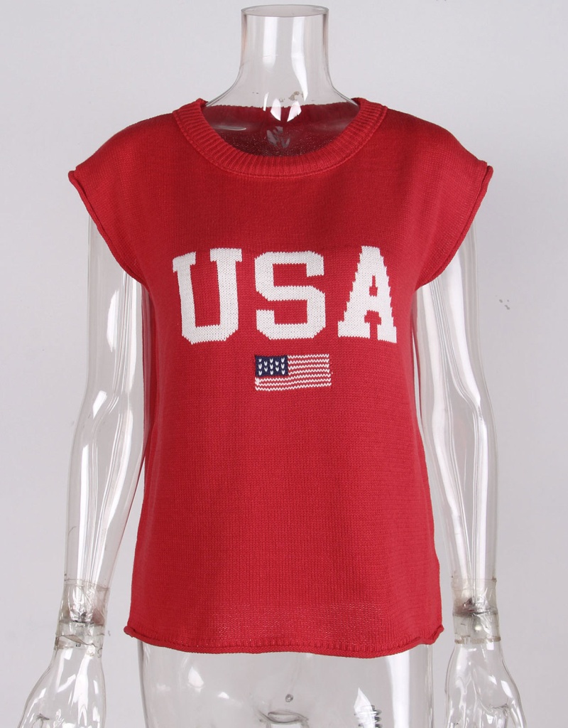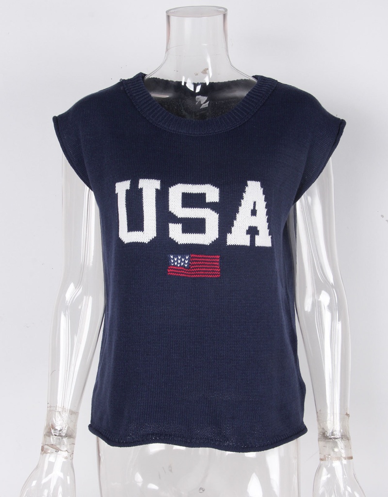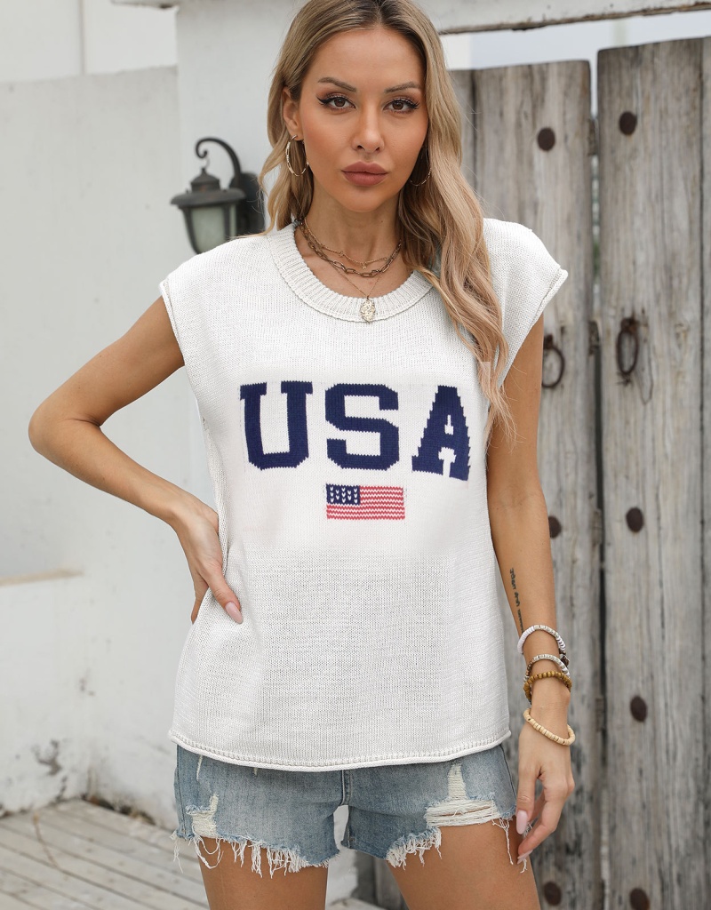 新款跨境美国国旗毛衣欧美时尚圆领无袖提花加刺绣上衣女厂