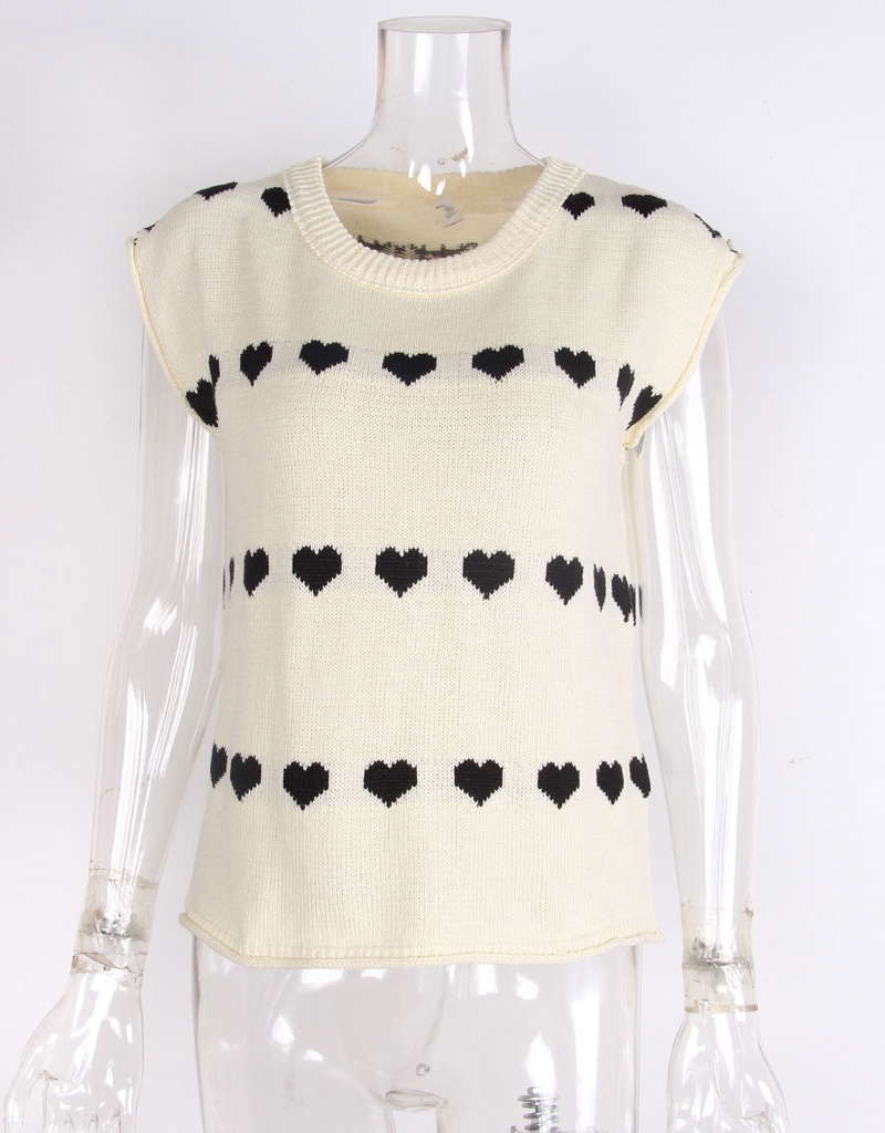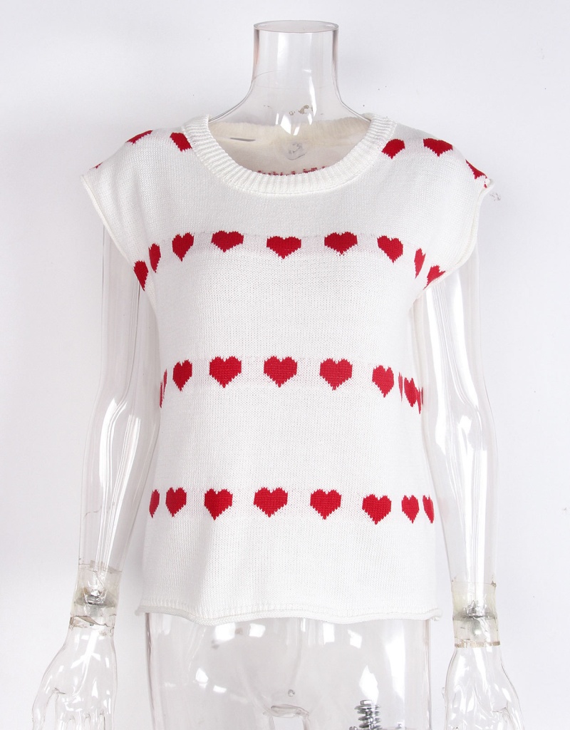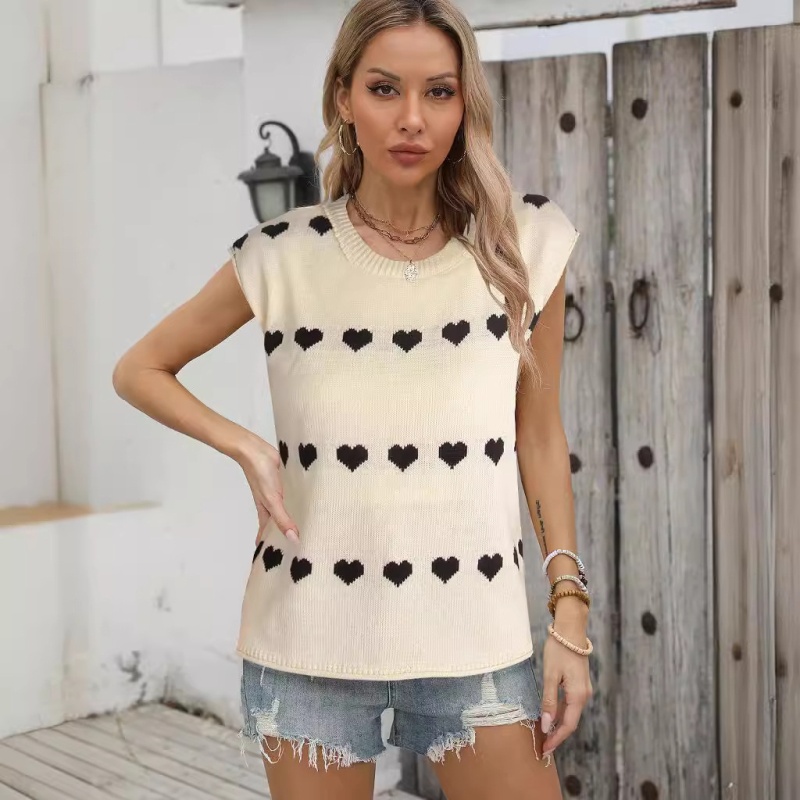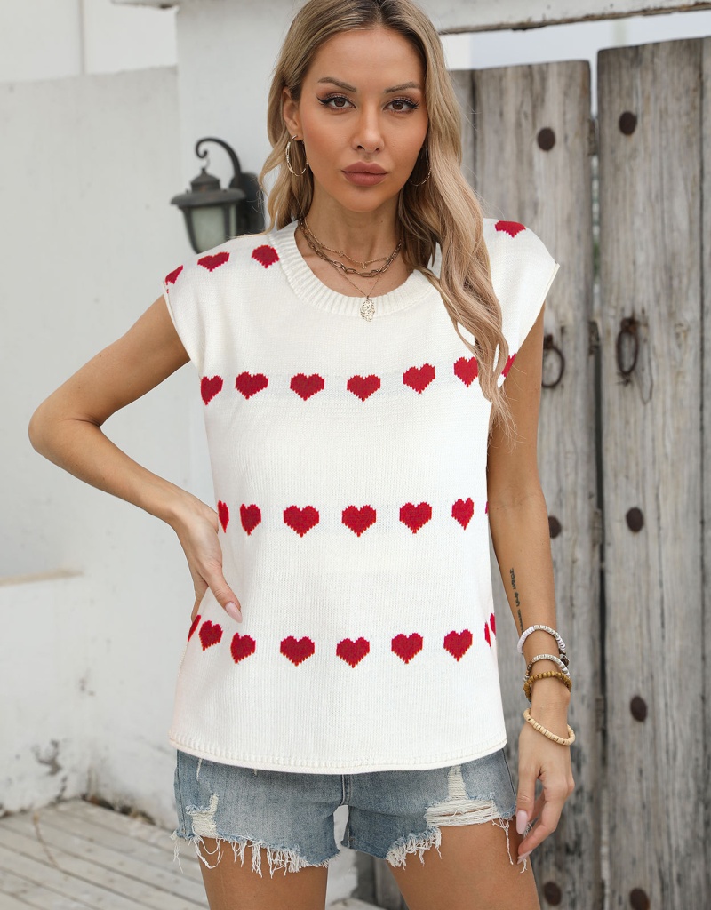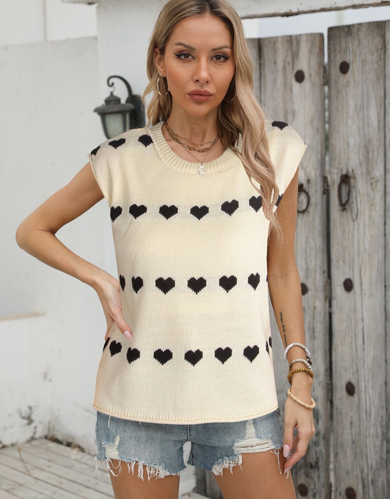 跨境新款 欧美纯色针织衫宽松桃爱心纹理圆领短袖毛衣女装
