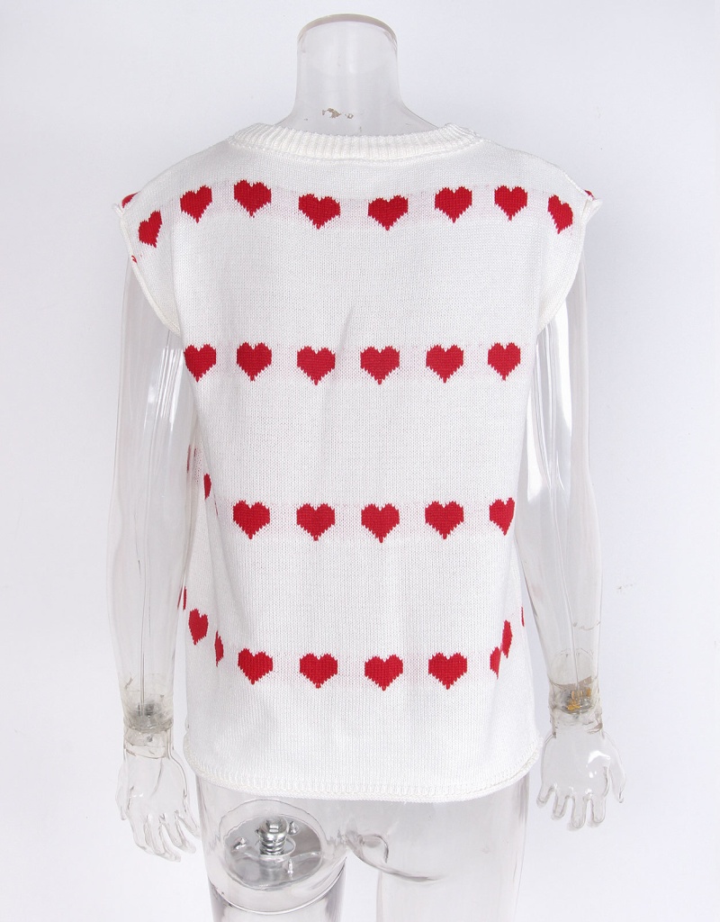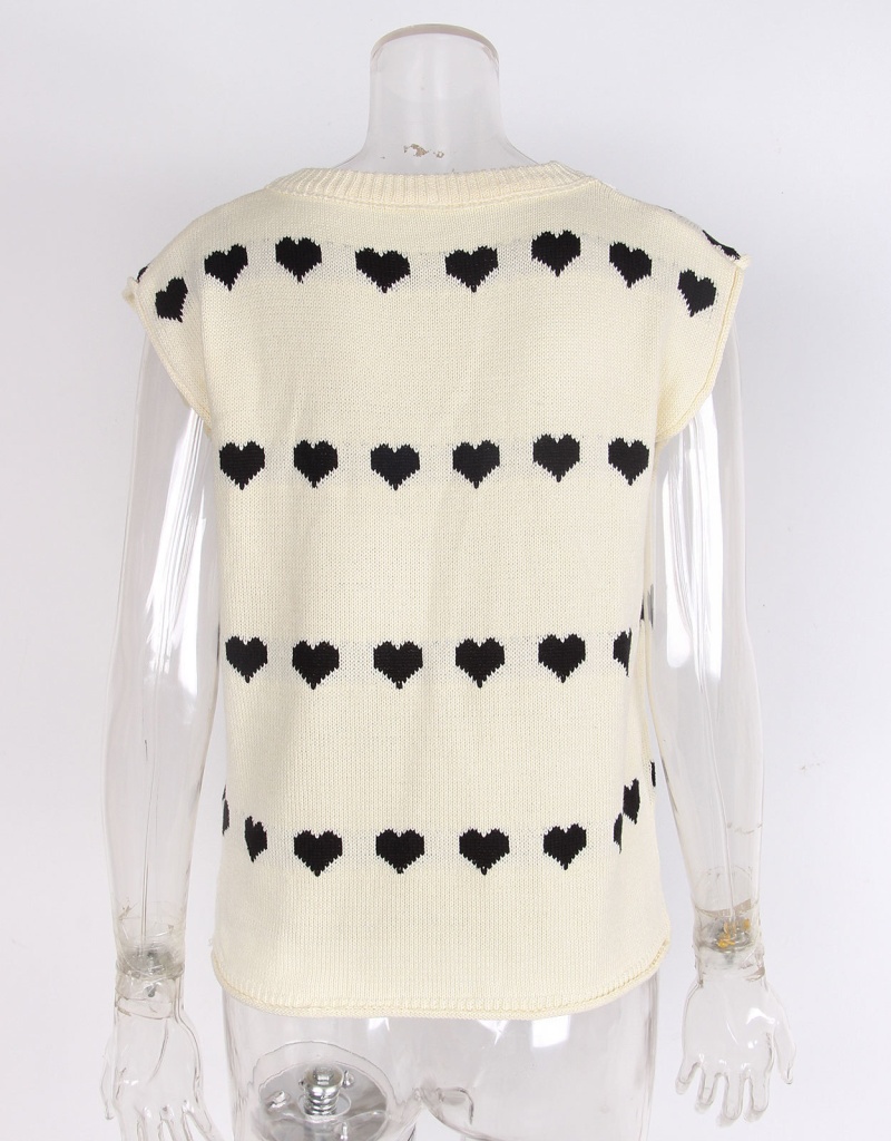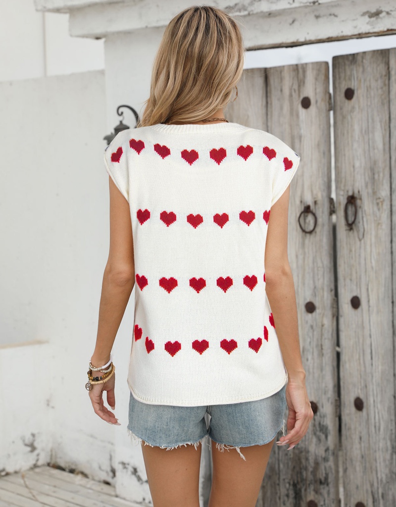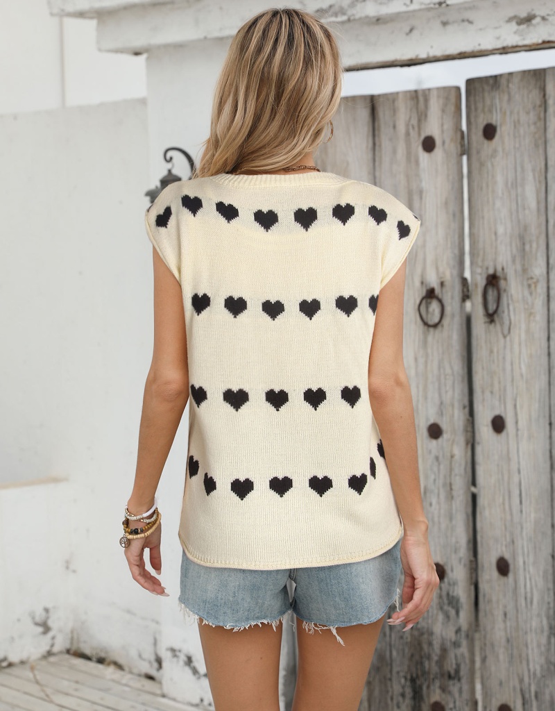 跨境新款 欧美纯色针织衫宽松桃爱心纹理圆领短袖毛衣女装