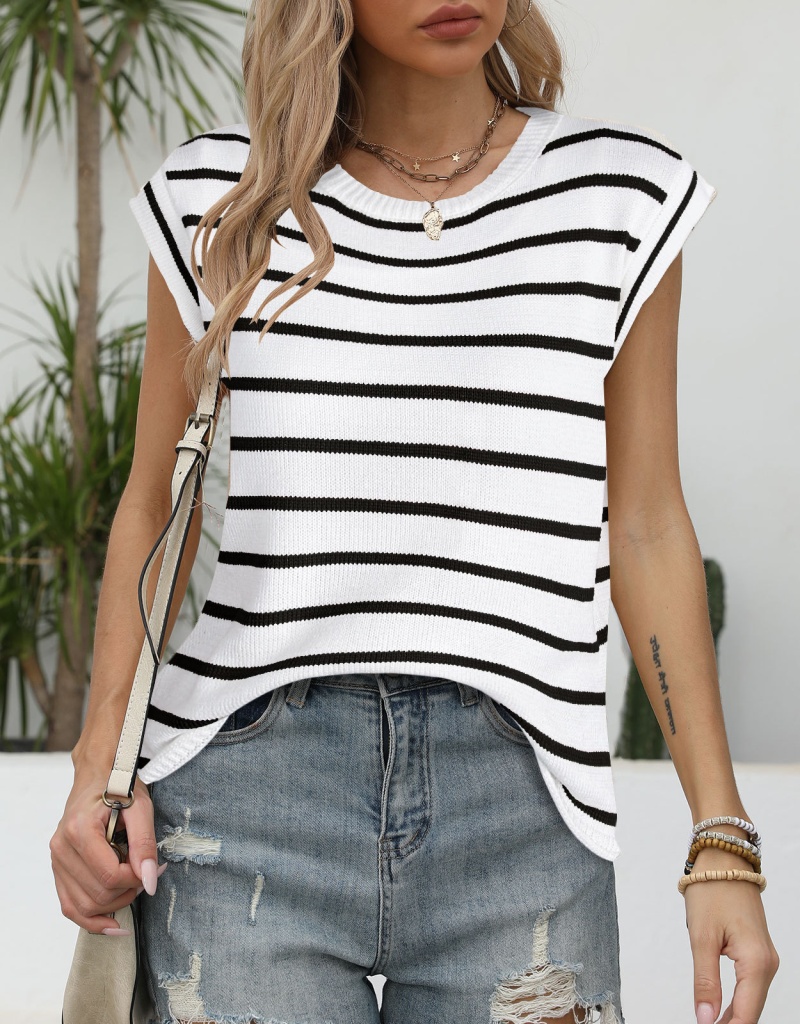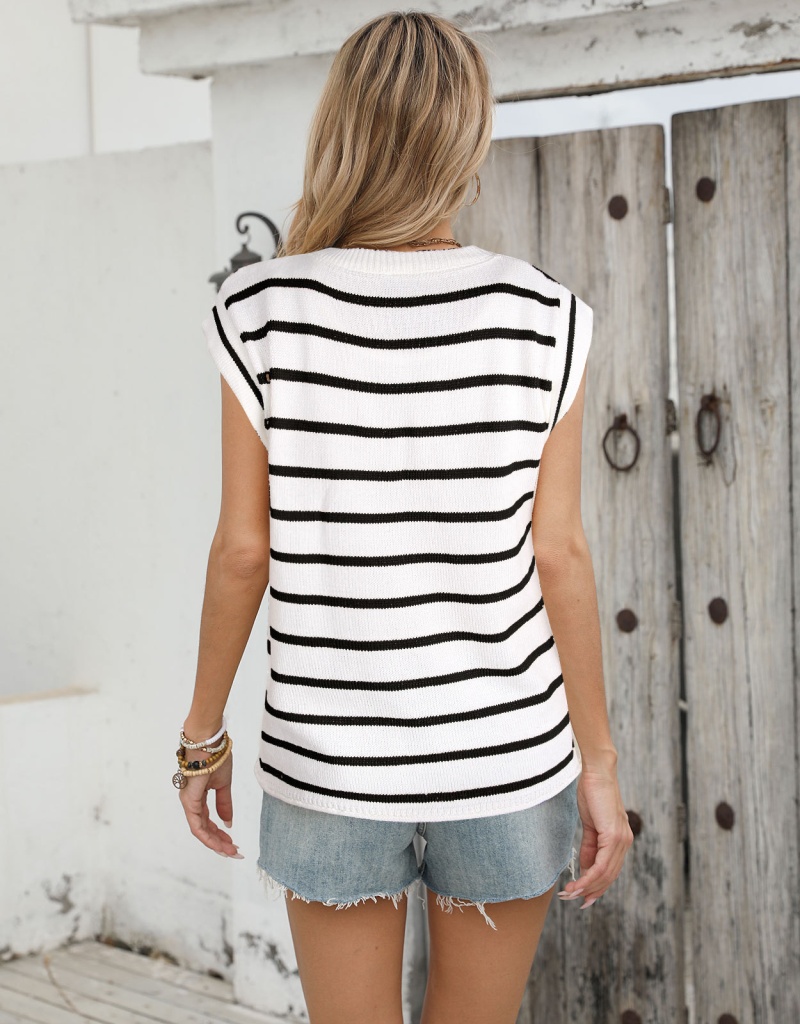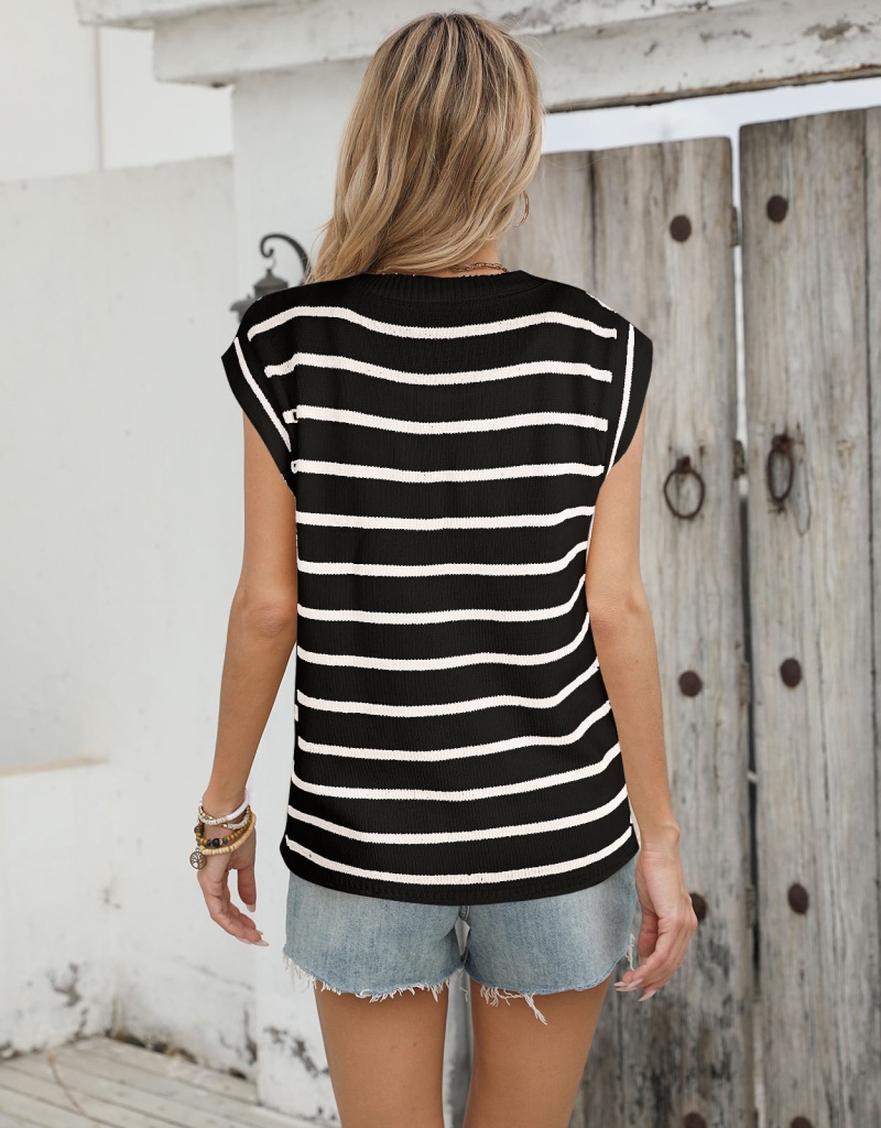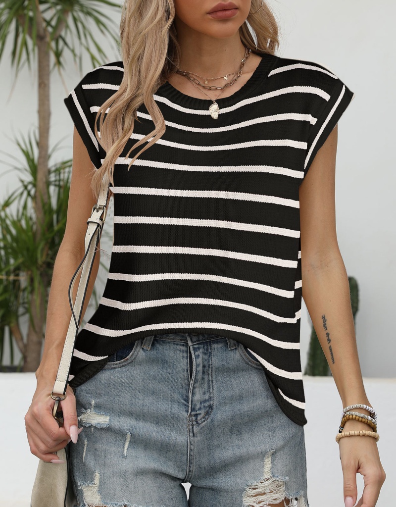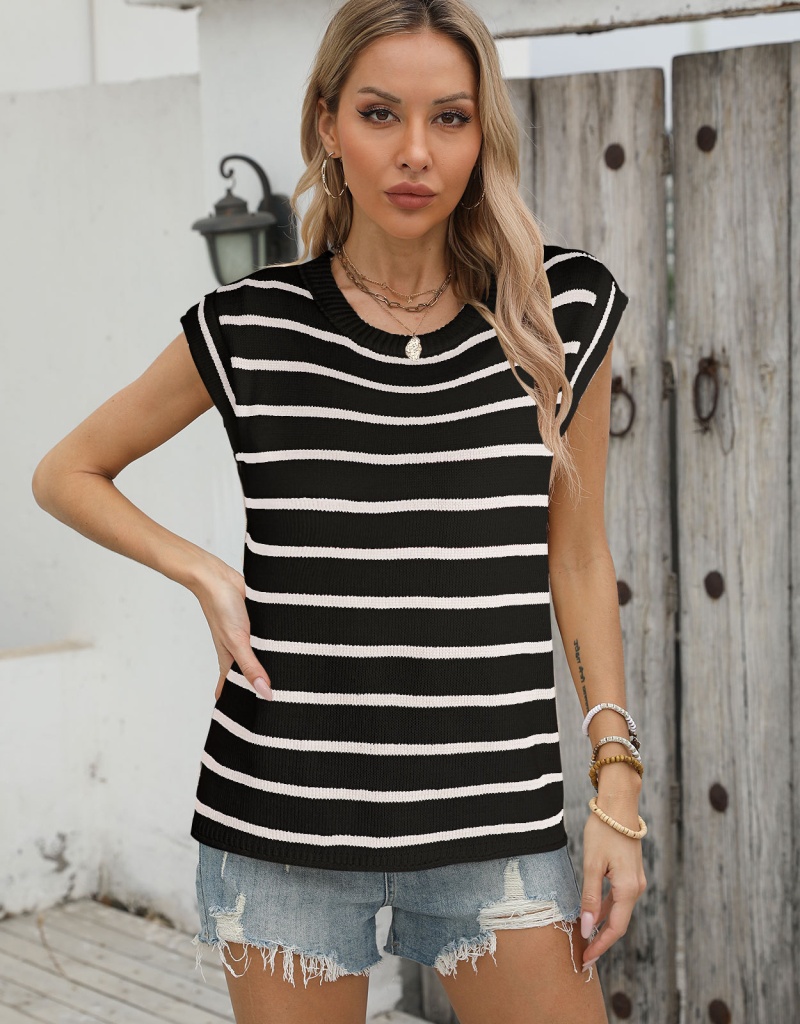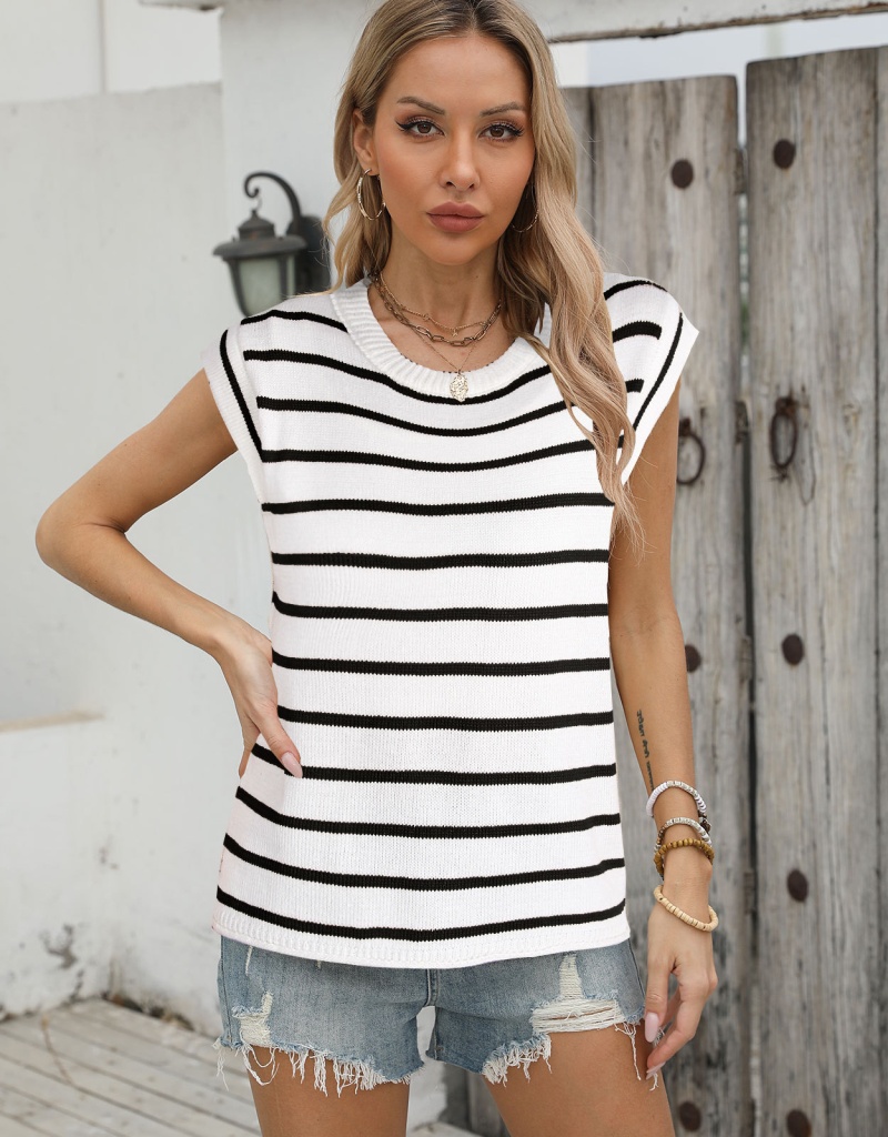跨境新款欧美爆款女装圆领套头针织衫宽松条纹短袖毛衣厂家