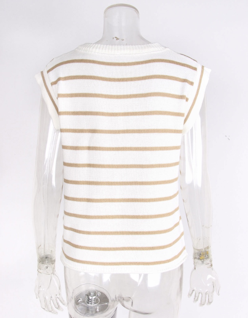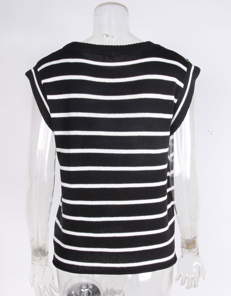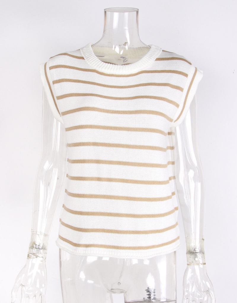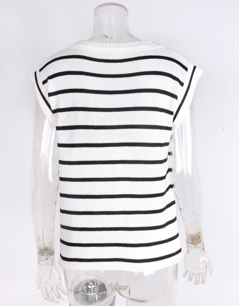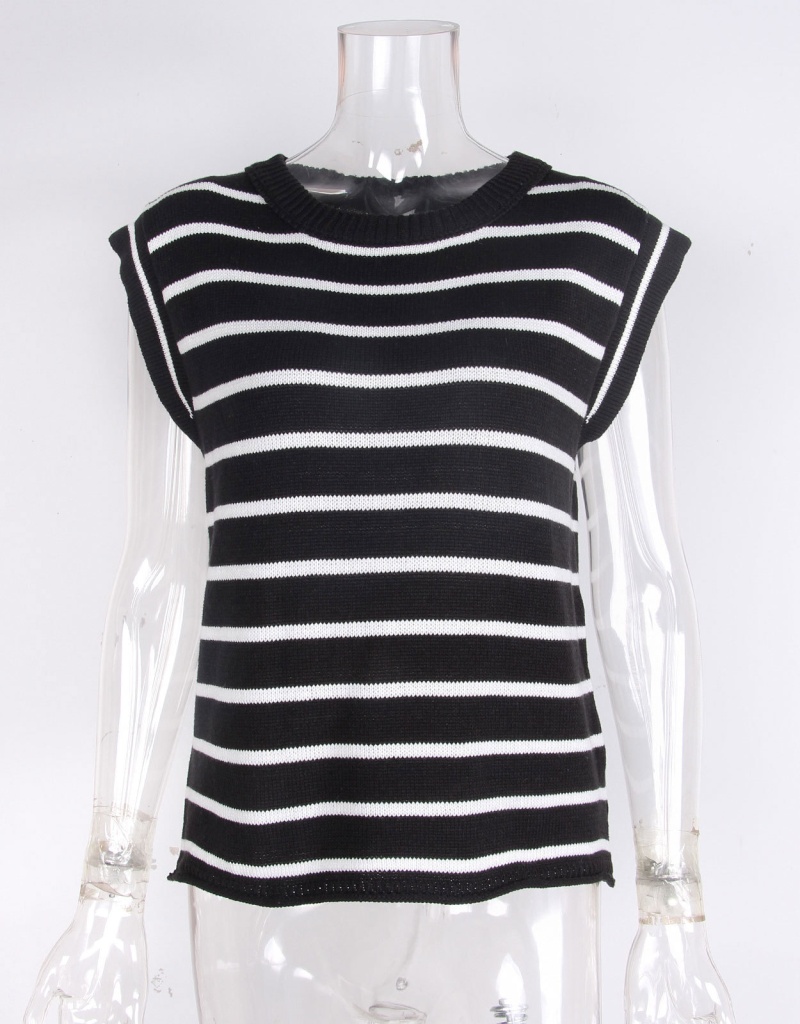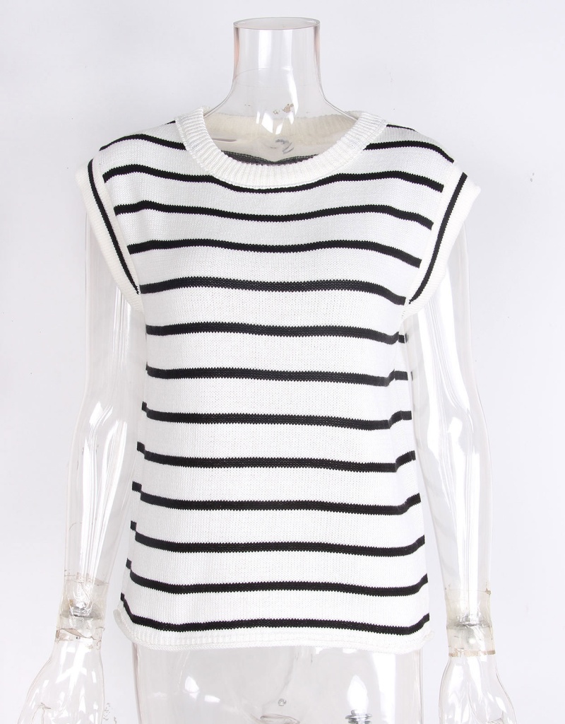 跨境新款欧美爆款女装圆领套头针织衫宽松条纹短袖毛衣厂家