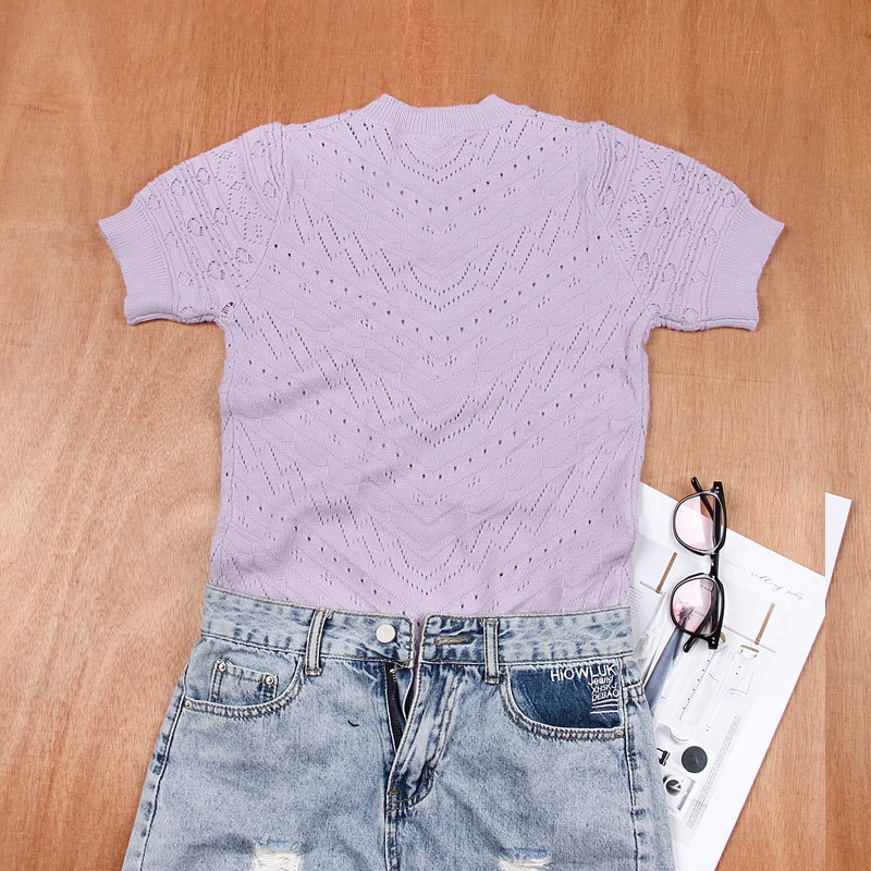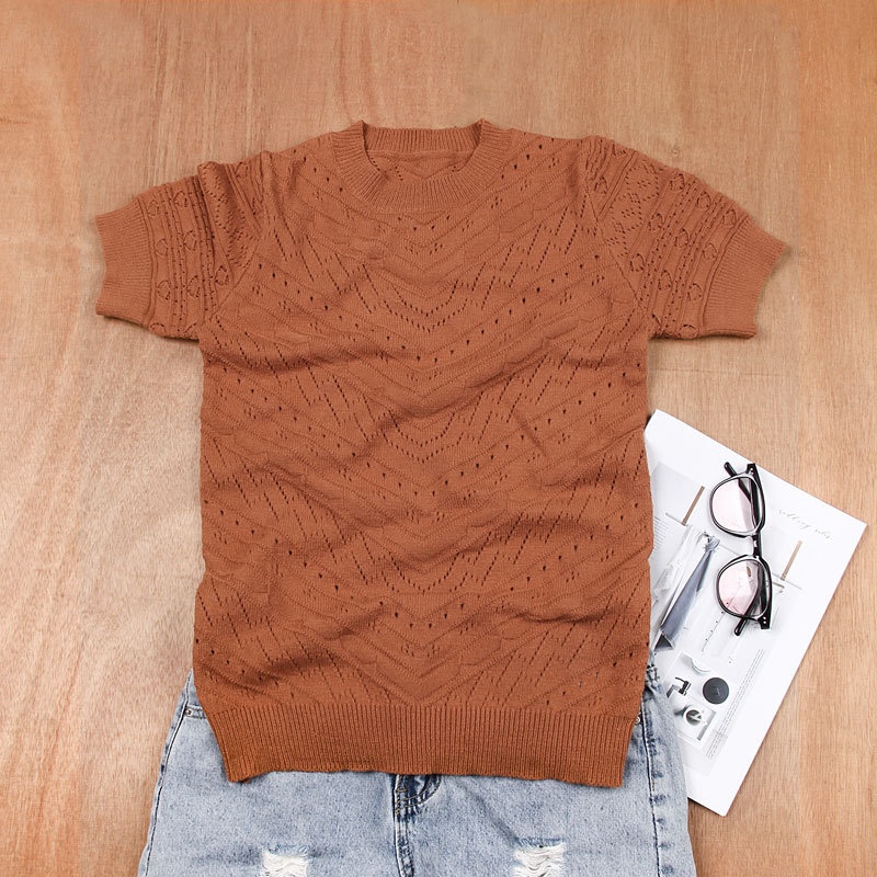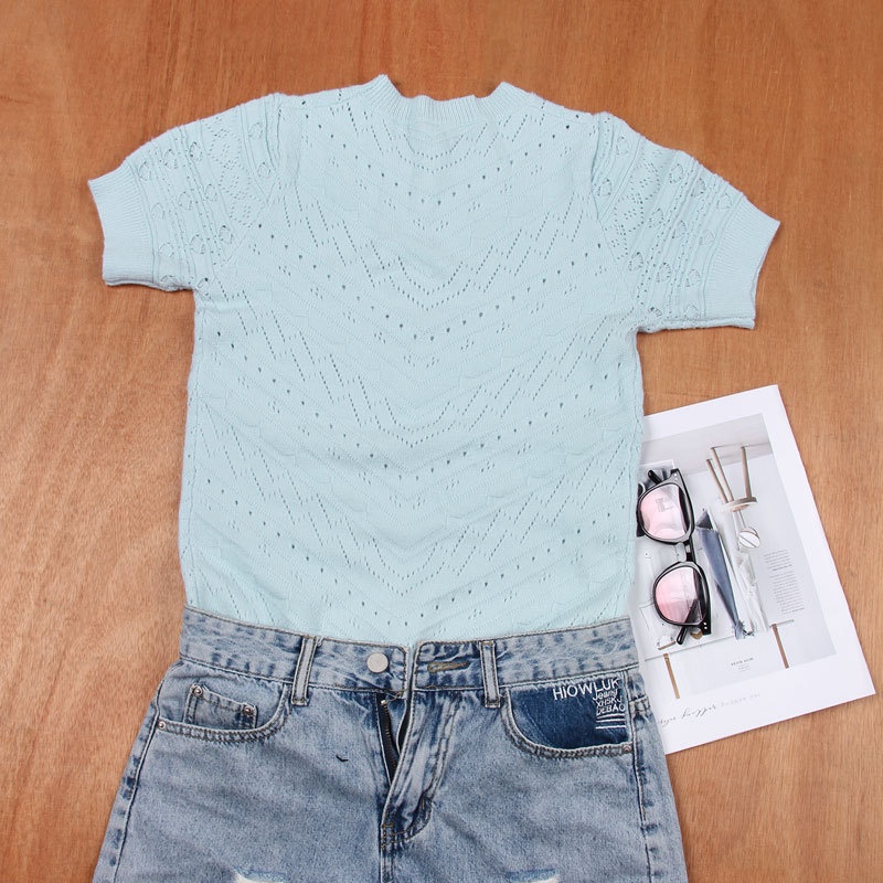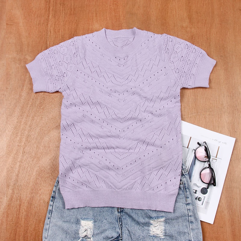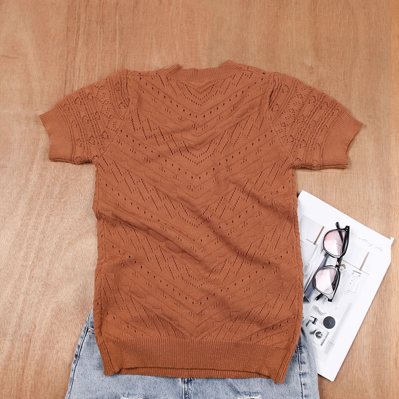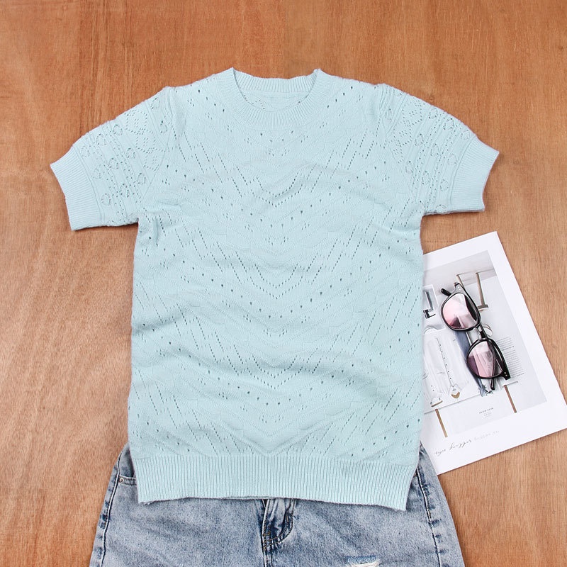 跨境外贸欧美纯色针织衫宽松挑孔花纹圆领短袖毛衣女装厂家