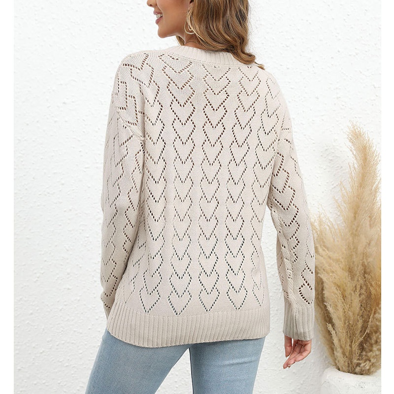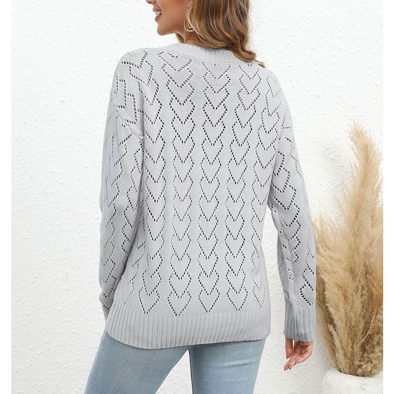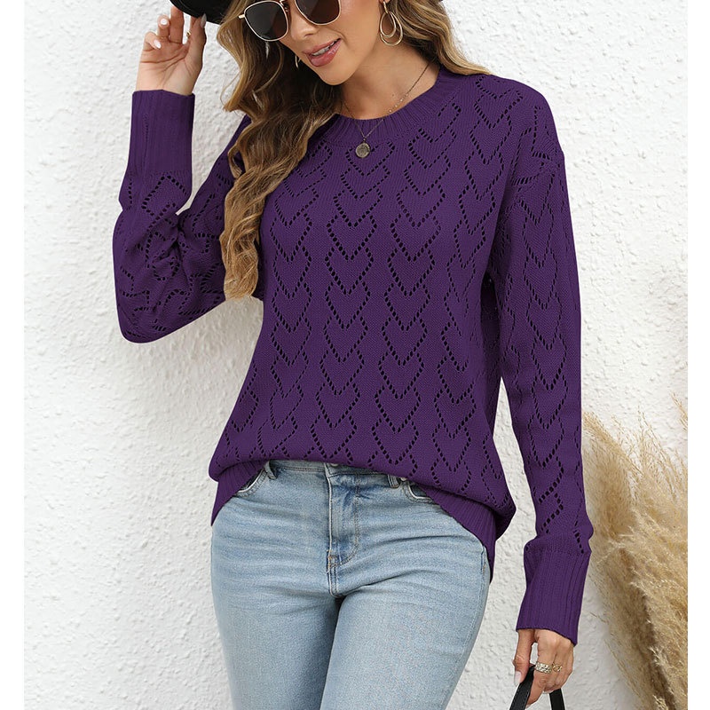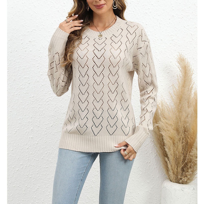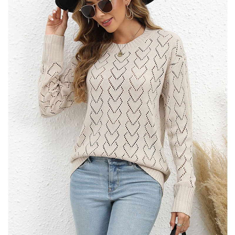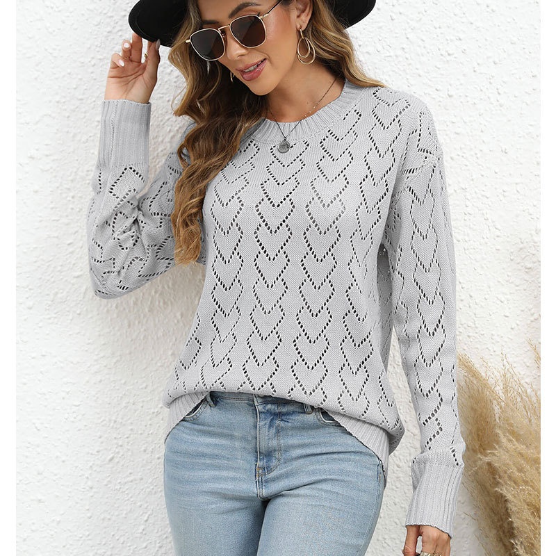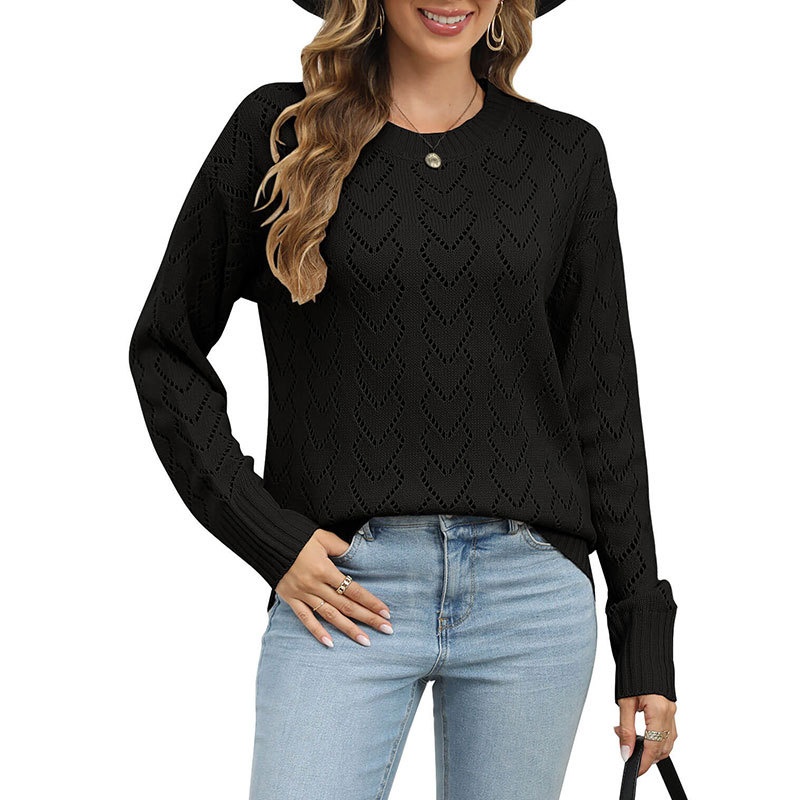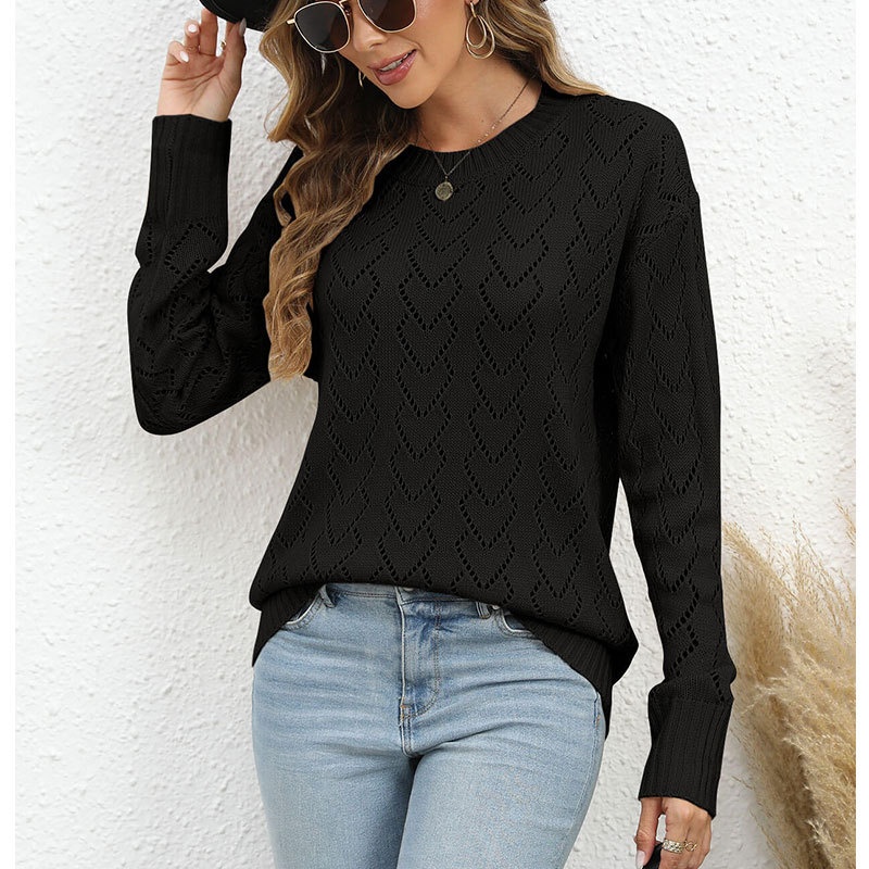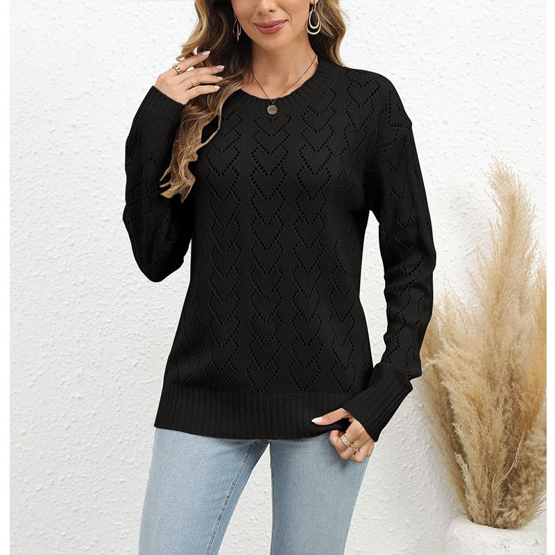 秋冬新款圆领爱心针织衫欧美跨境镂空套头长袖毛衣女装上衣