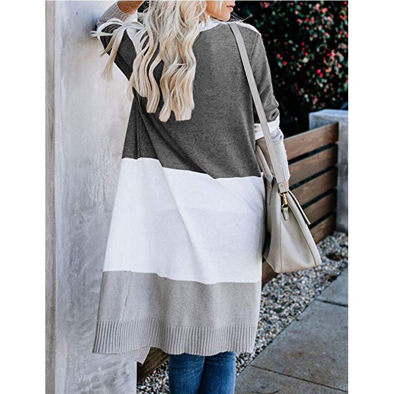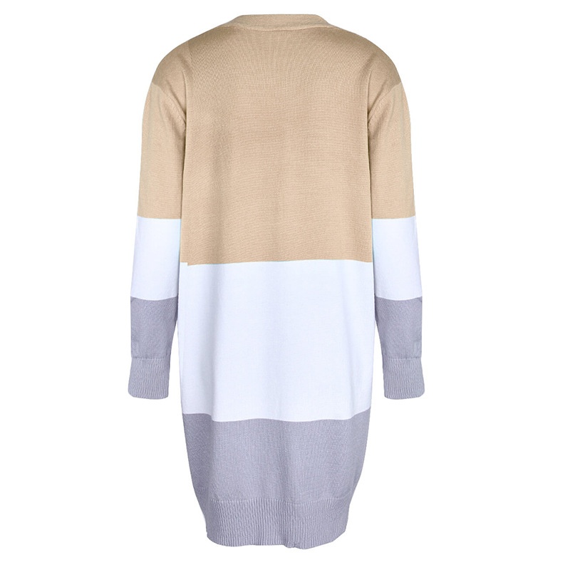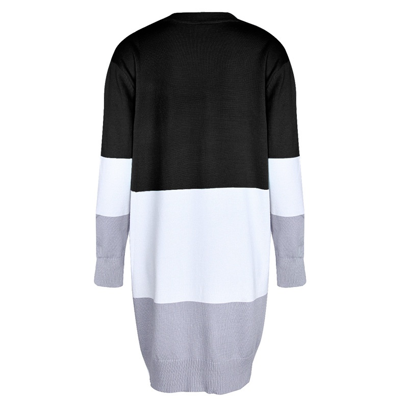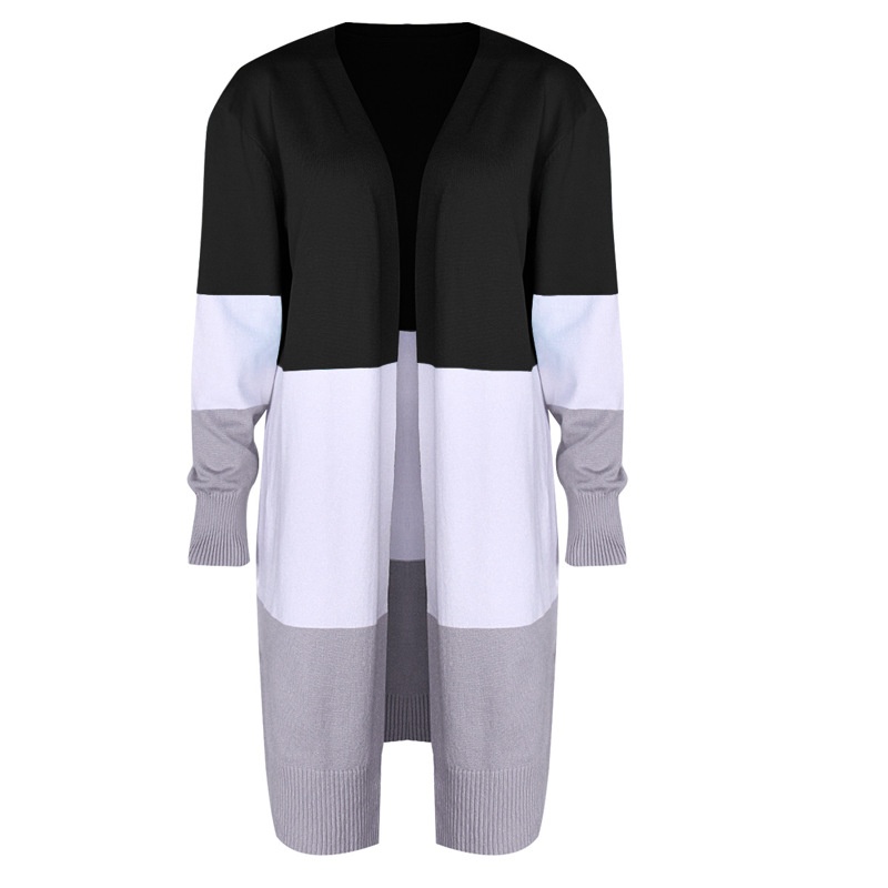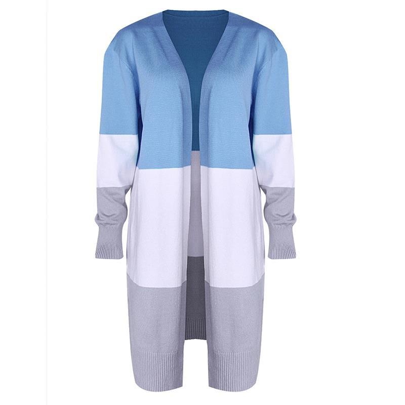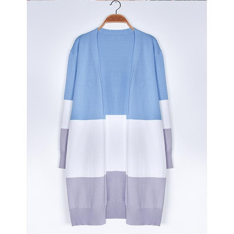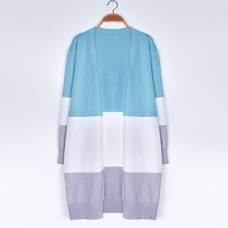 跨境新款撞色长款针织毛衣彩虹拼接条纹开衫毛衣外套女秋冬