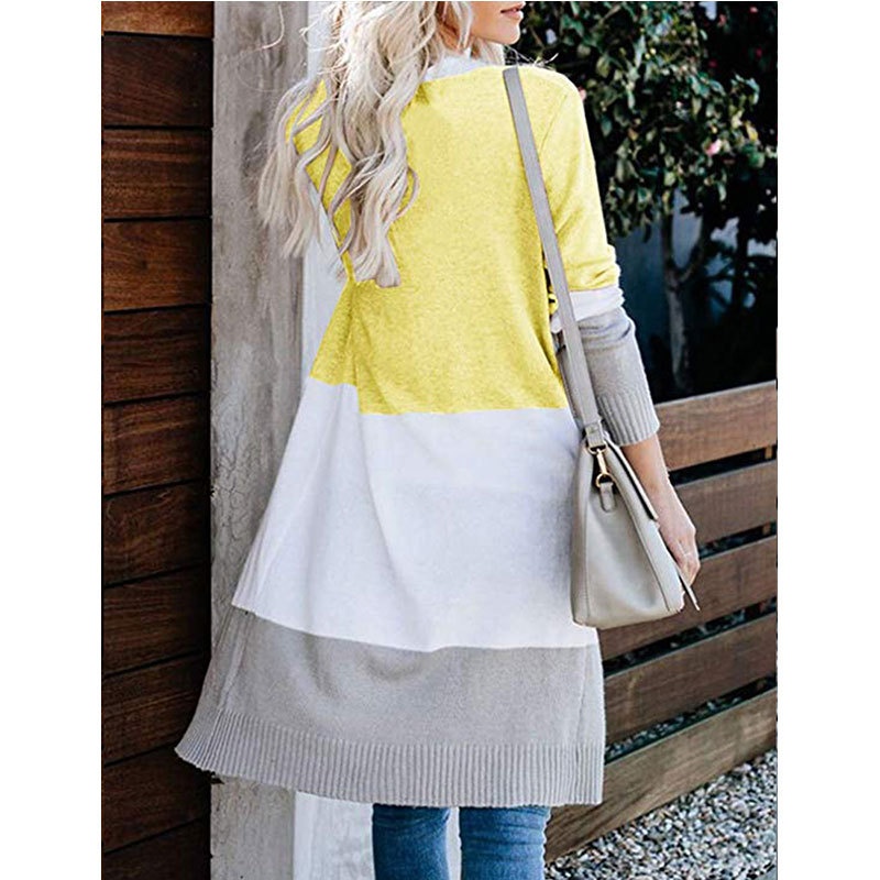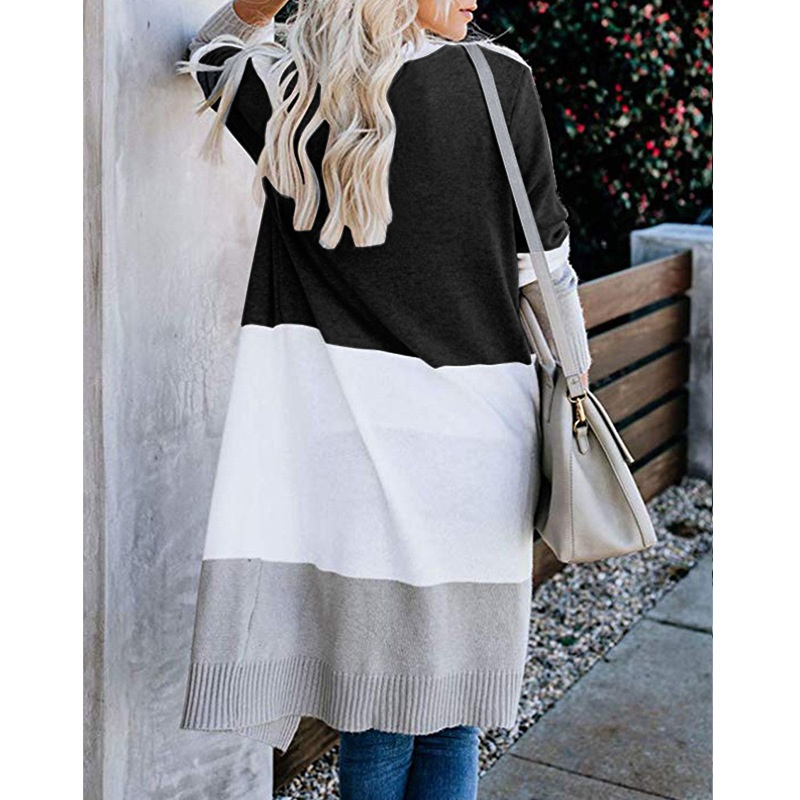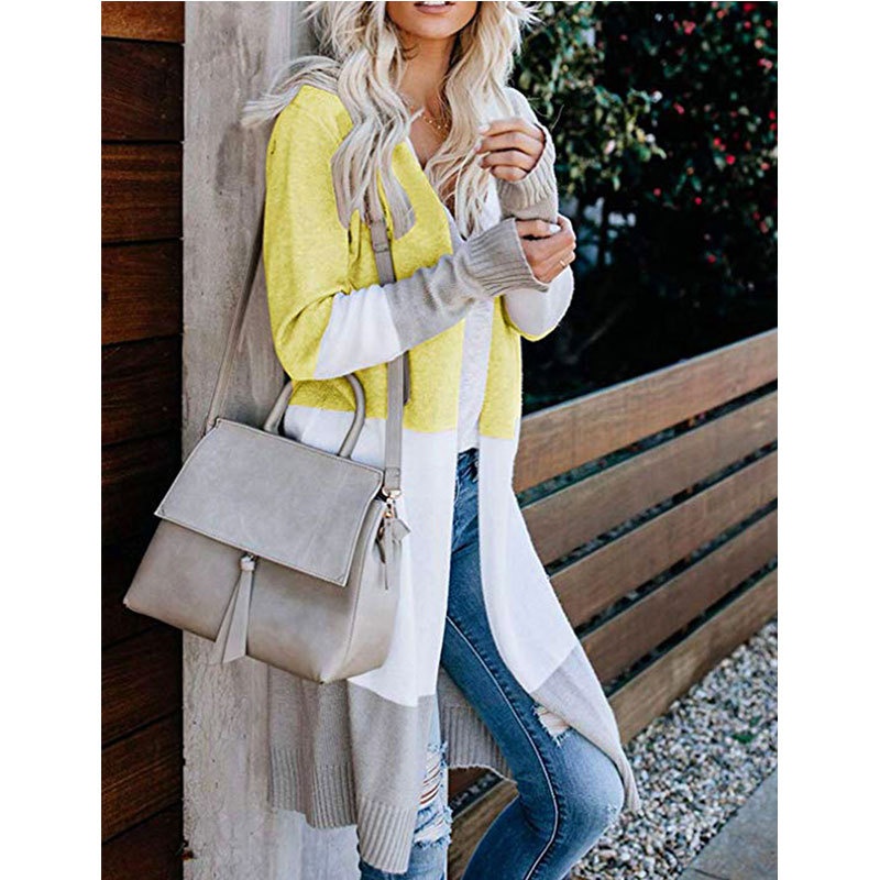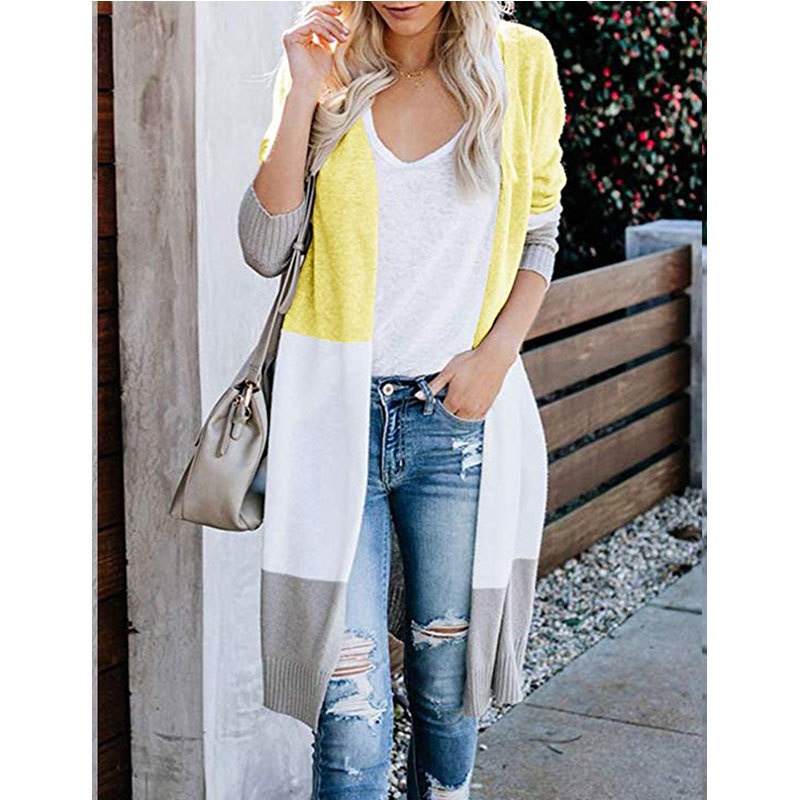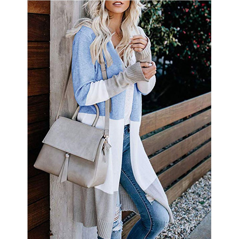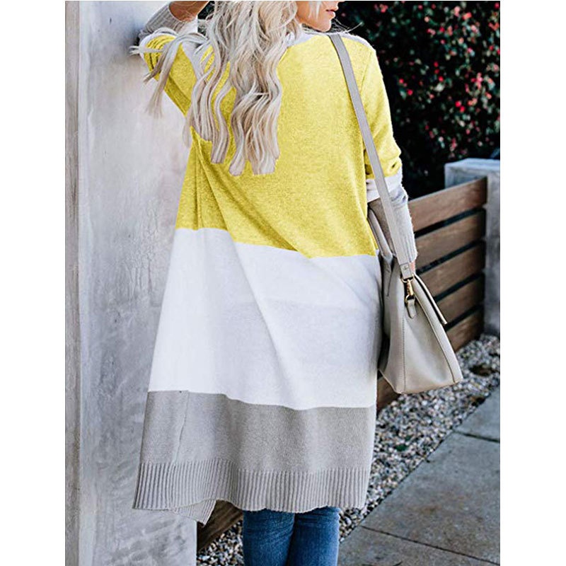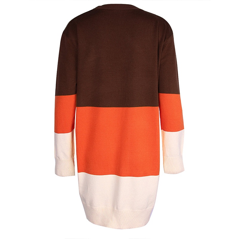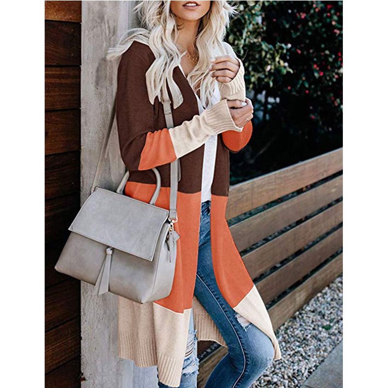 跨境新款撞色长款针织毛衣彩虹拼接条纹开衫毛衣外套女秋冬
