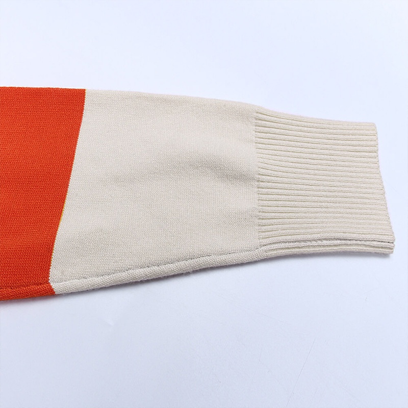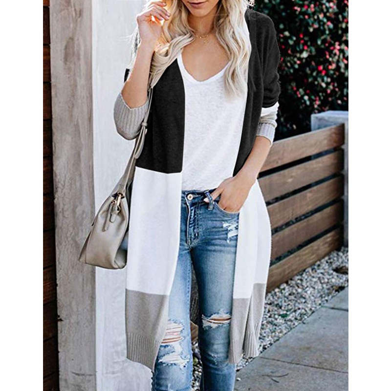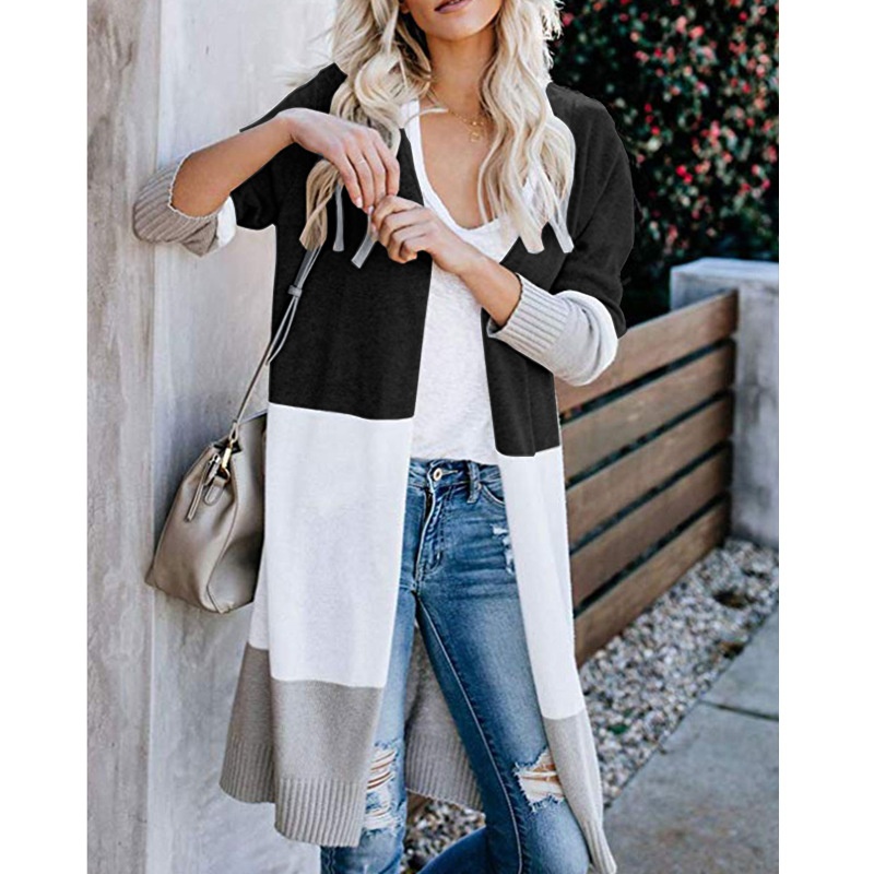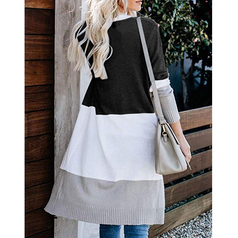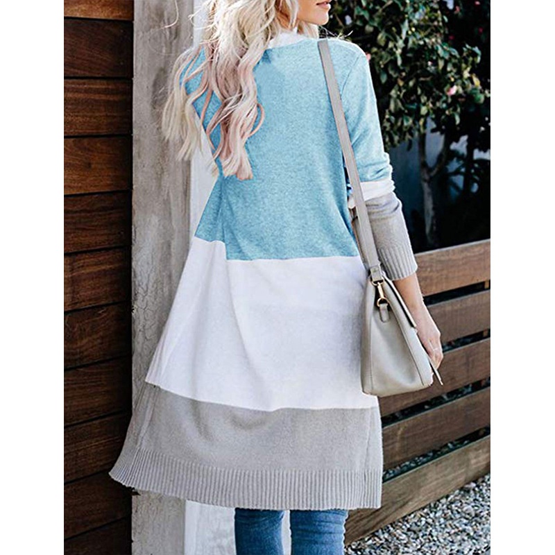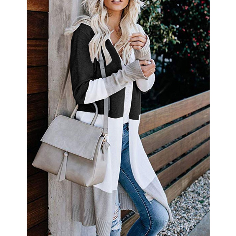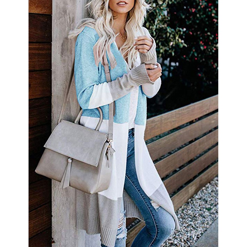 跨境新款撞色长款针织毛衣彩虹拼接条纹开衫毛衣外套女秋冬