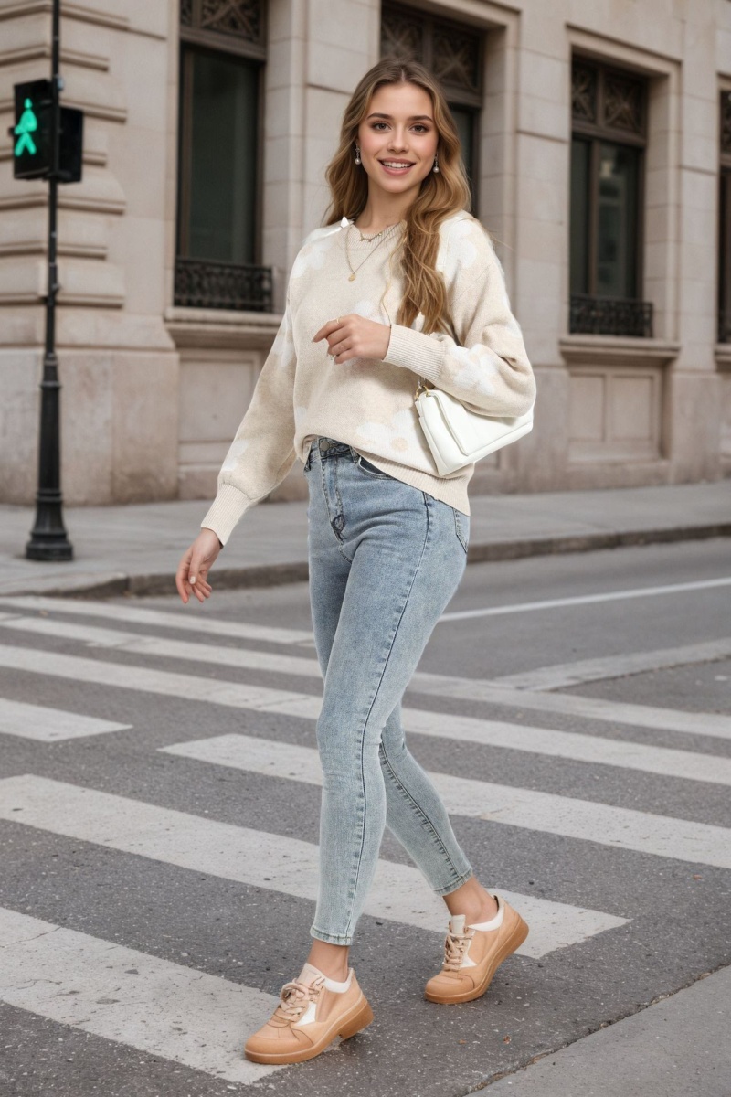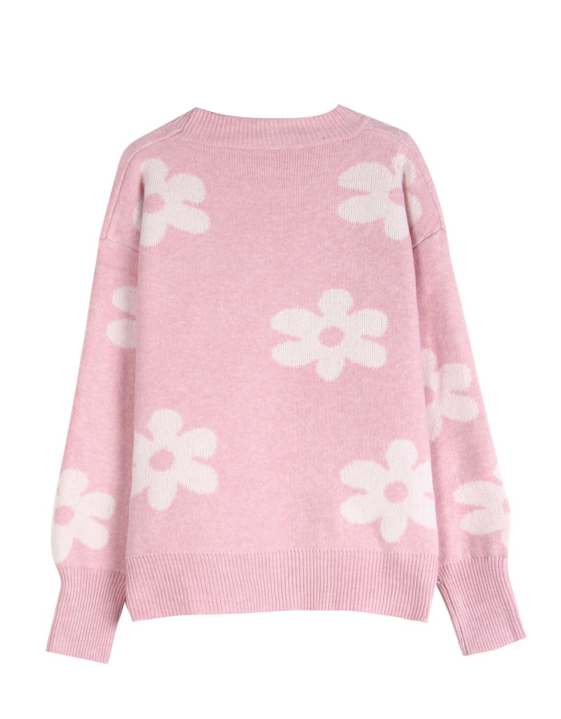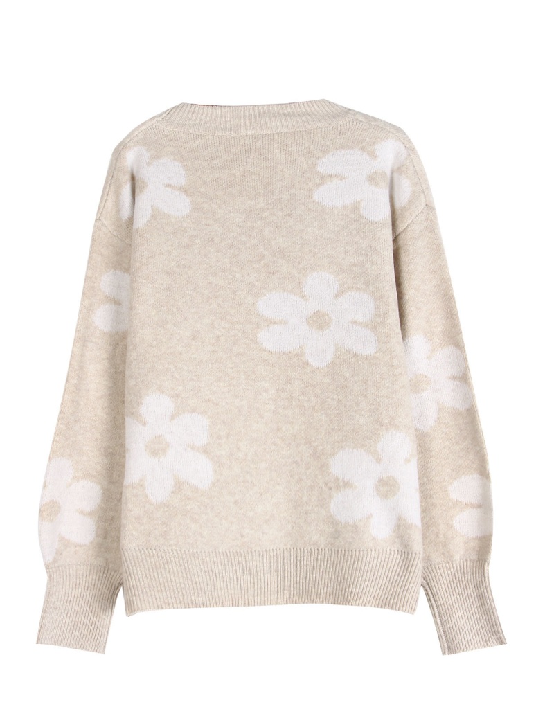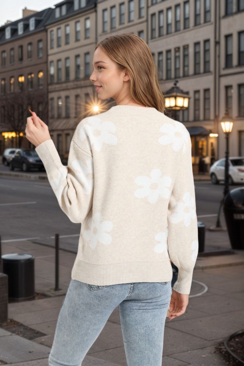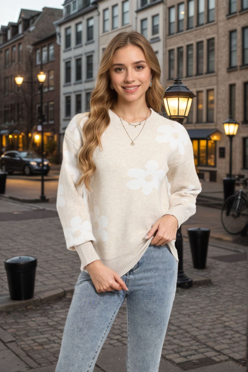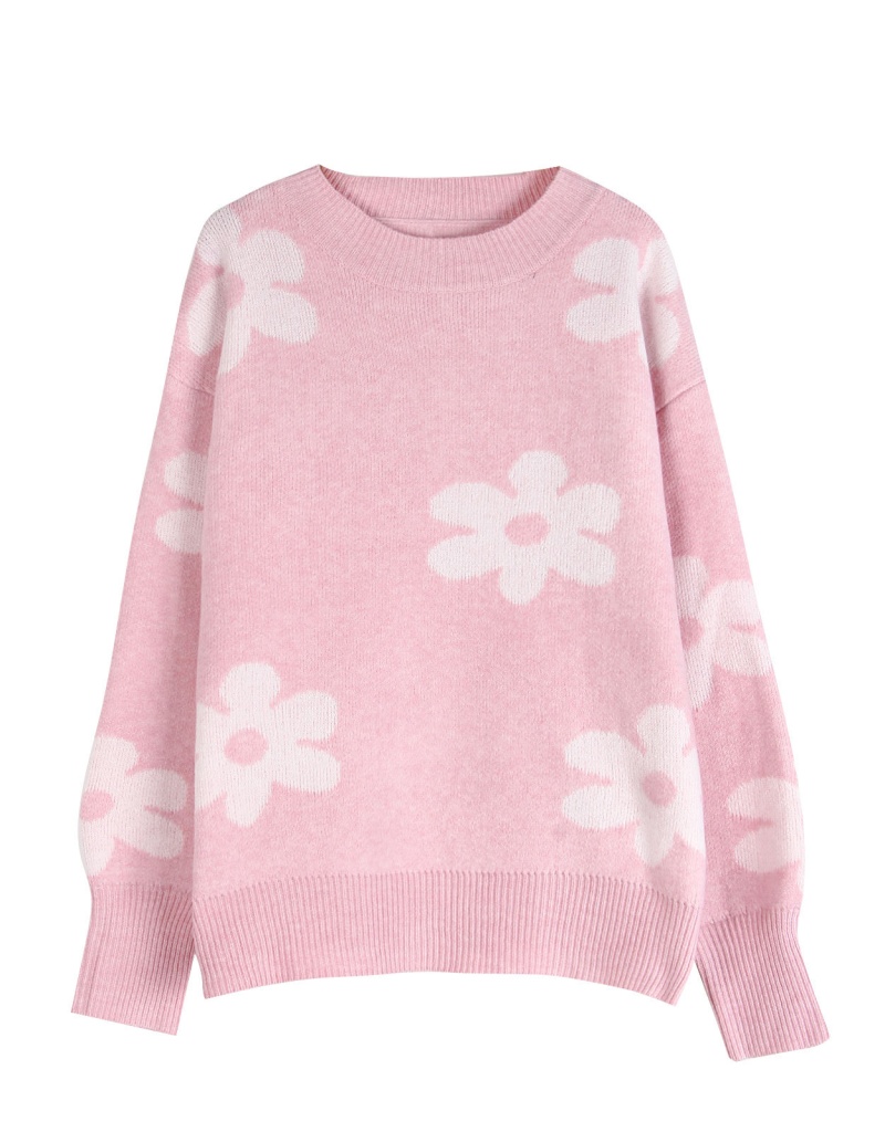 欧美秋冬新款针织衫上衣跨境宽松花朵提花圆领套头毛衣女装