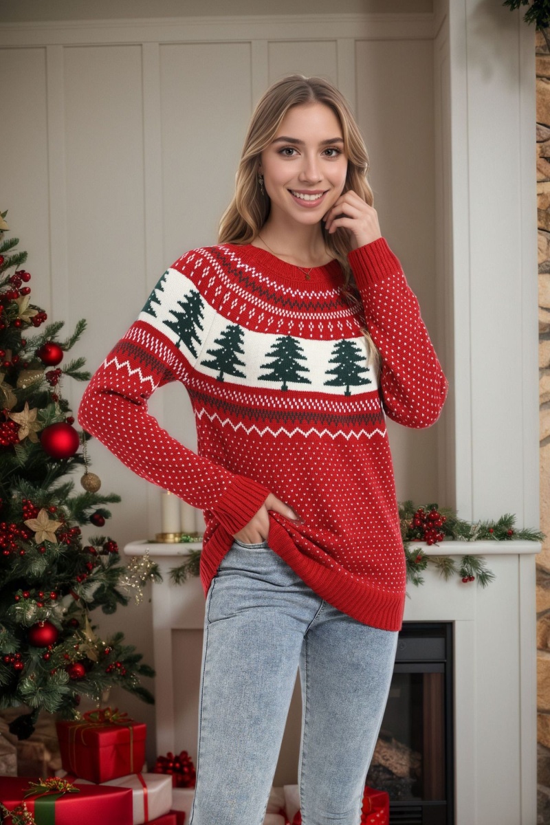 欧美秋冬新款圣诞毛衣女跨境宽松针织青松刺绣百搭套头上衣