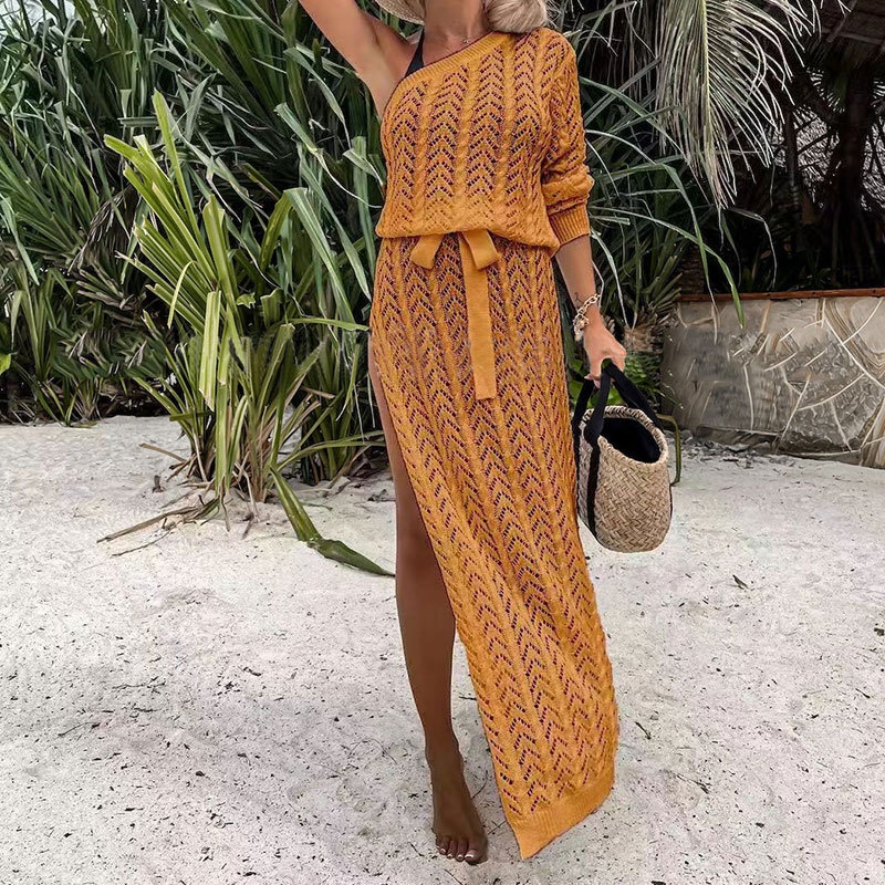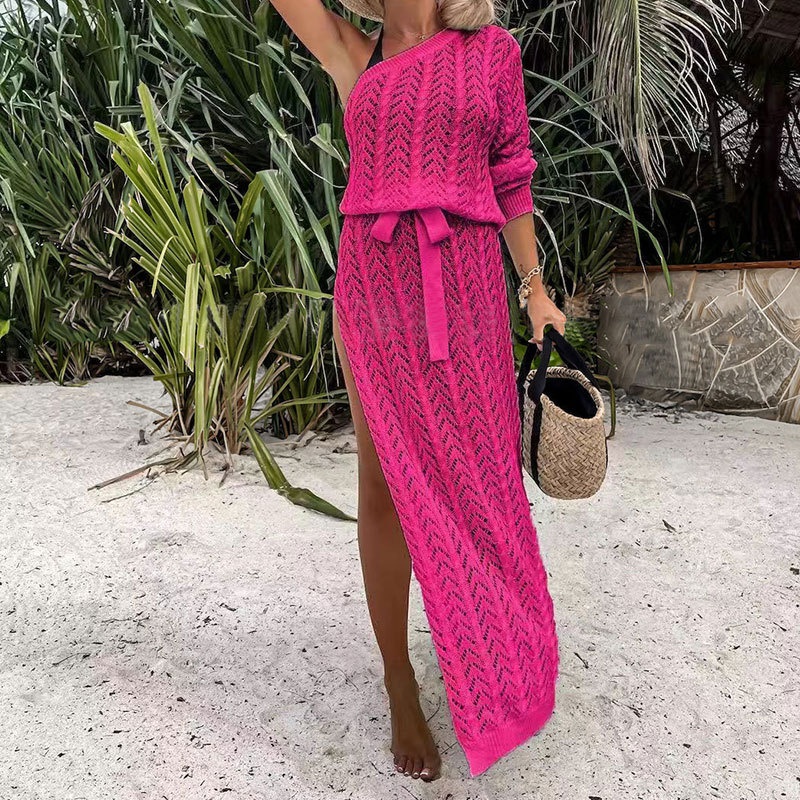 单袖连衣裙 跨境欧美镂空沙滩裙透视纯色长款连衣裙厂家