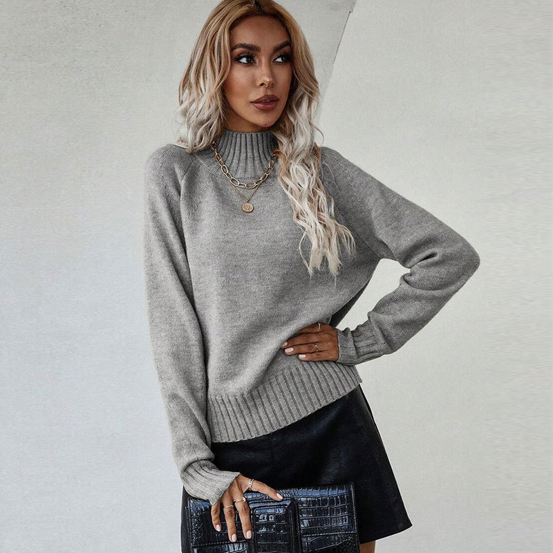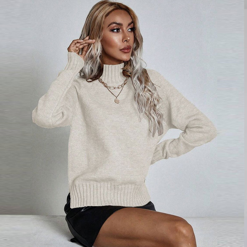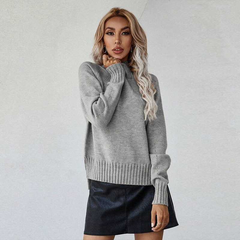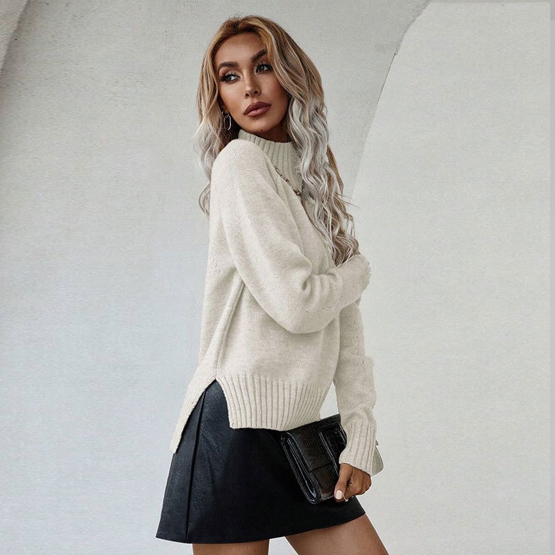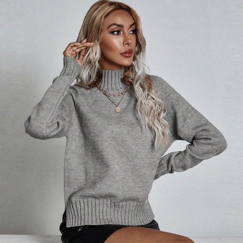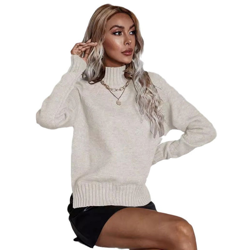 欧美女士高领套头衬衫跨境秋冬中长款坑条纹开叉修身打底衫