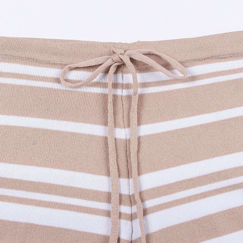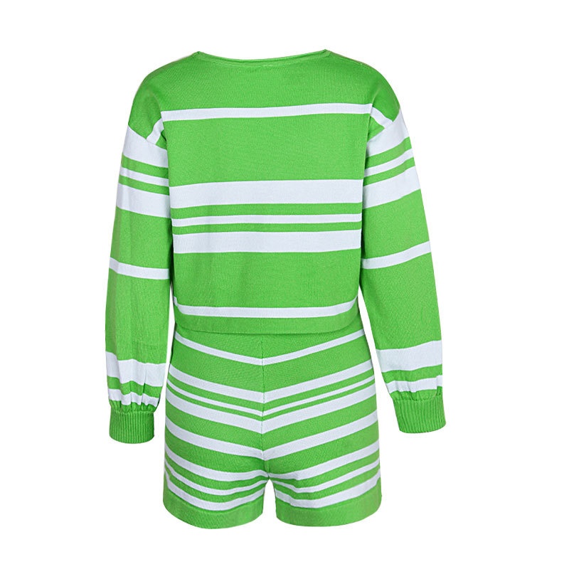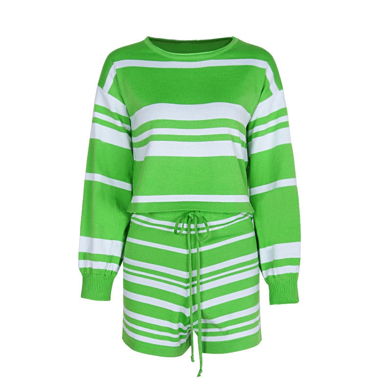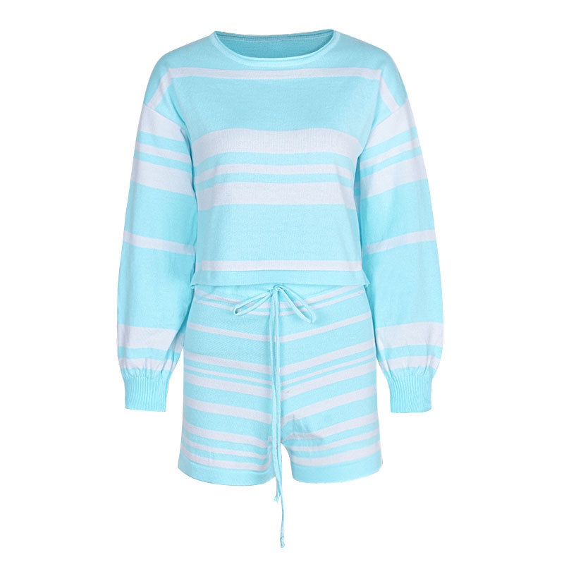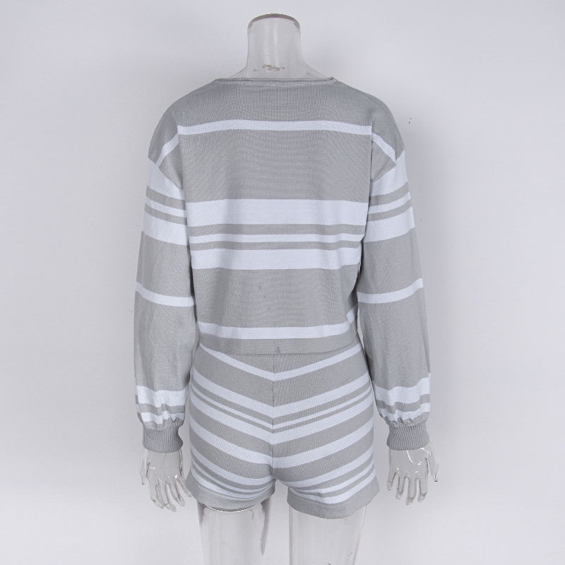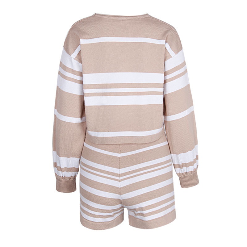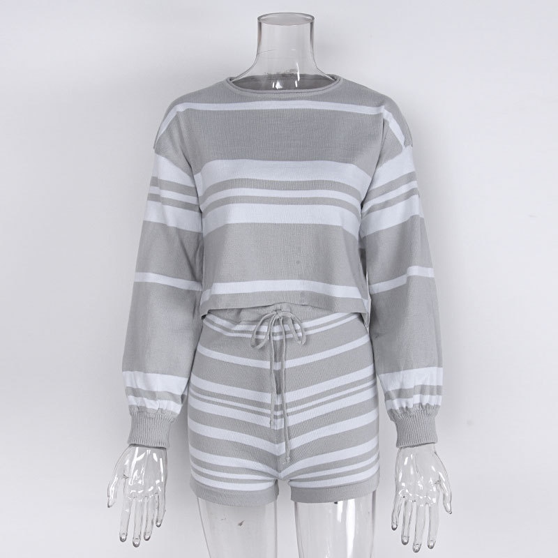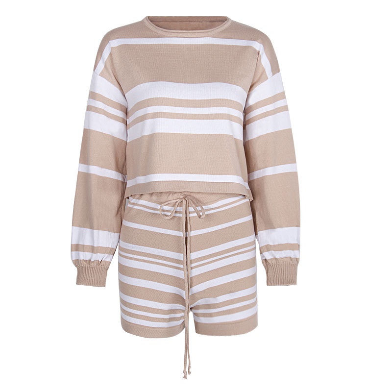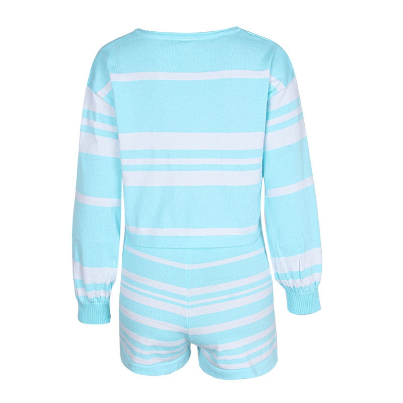 外贸休闲条纹长袖短裤两件套针织阔腿运动时尚套装夏装新款