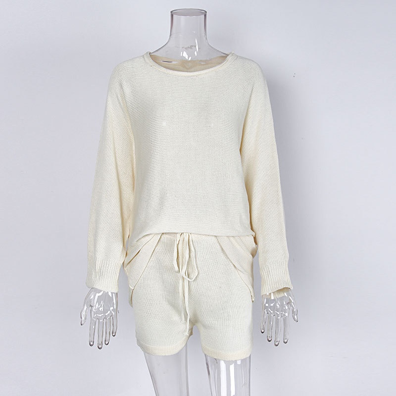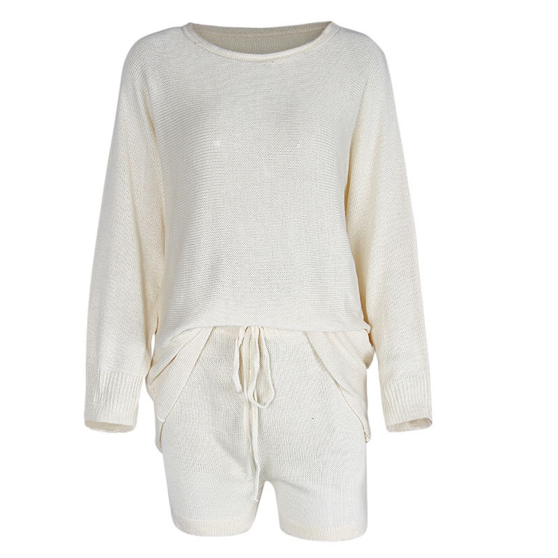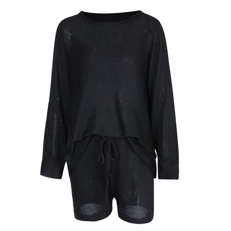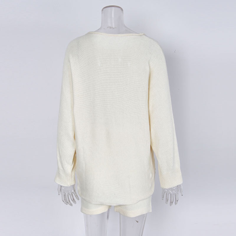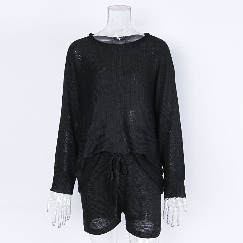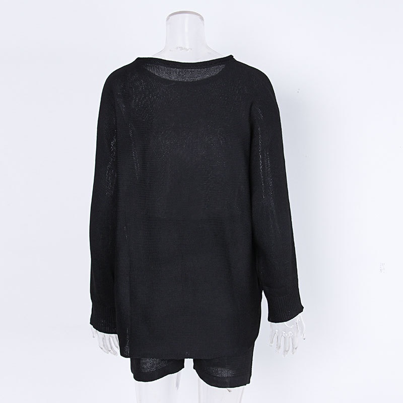 欧美秋季外贸女镂空针织纯色长袖圆领搭配短裤休闲套装女款