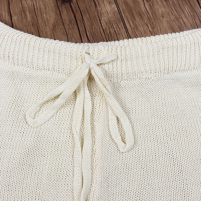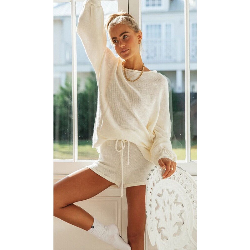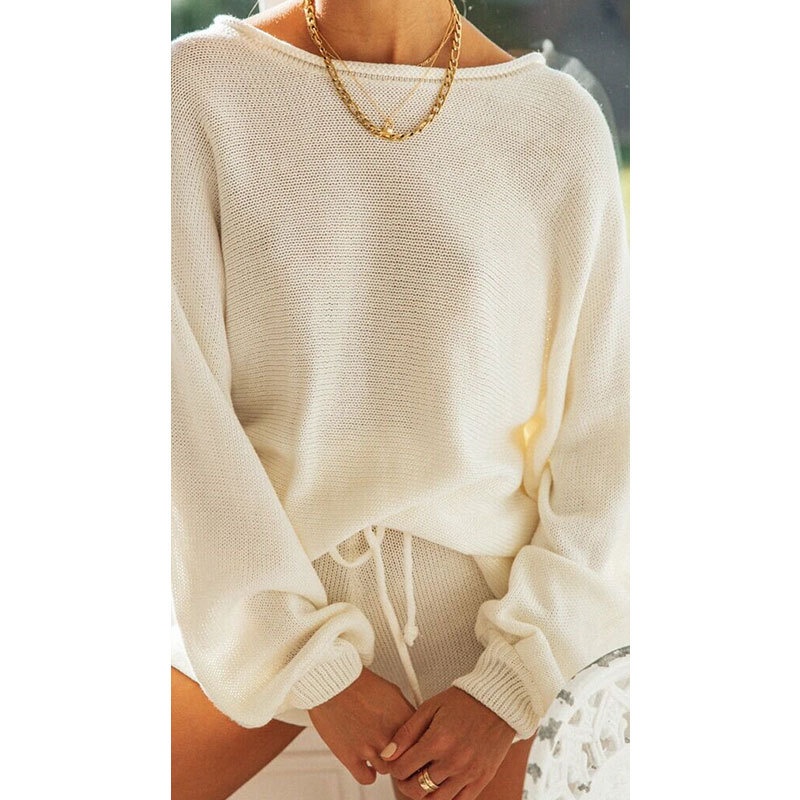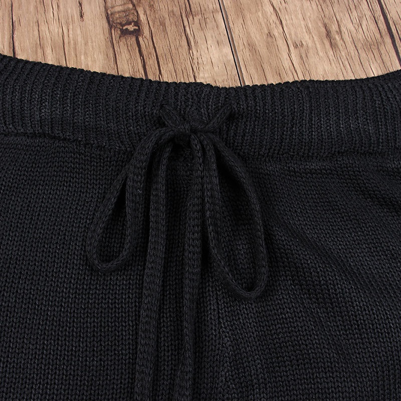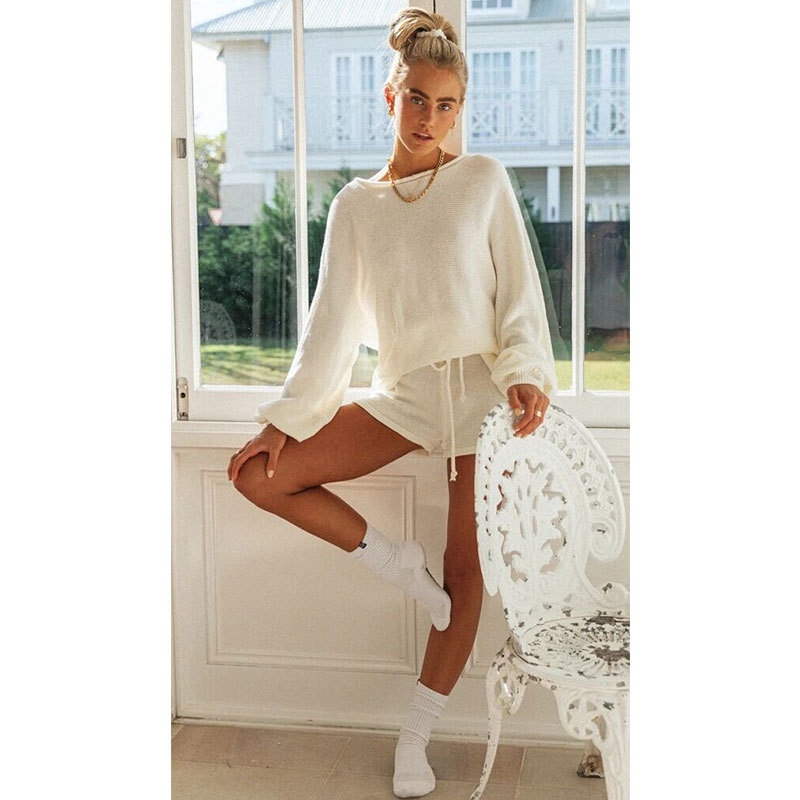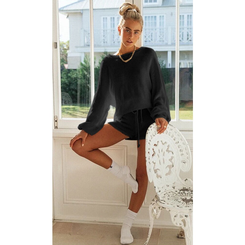 欧美秋季外贸女镂空针织纯色长袖圆领搭配短裤休闲套装女款