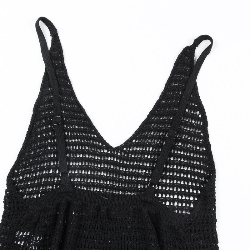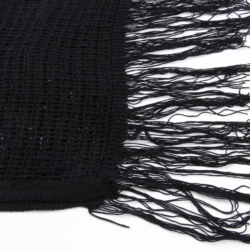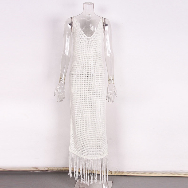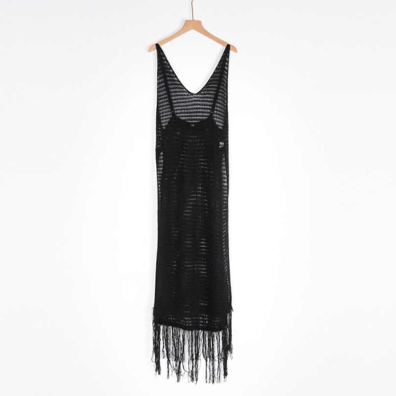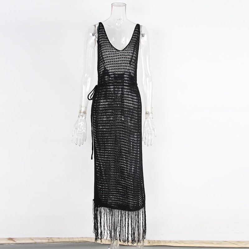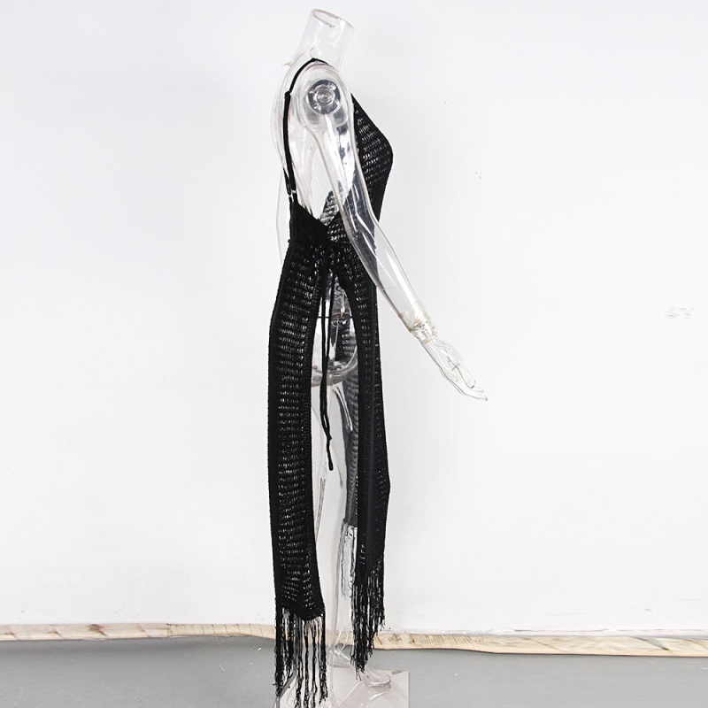 跨境新款欧美性感镂空针织开叉流苏长款沙滩裙比基尼罩衫防晒服女