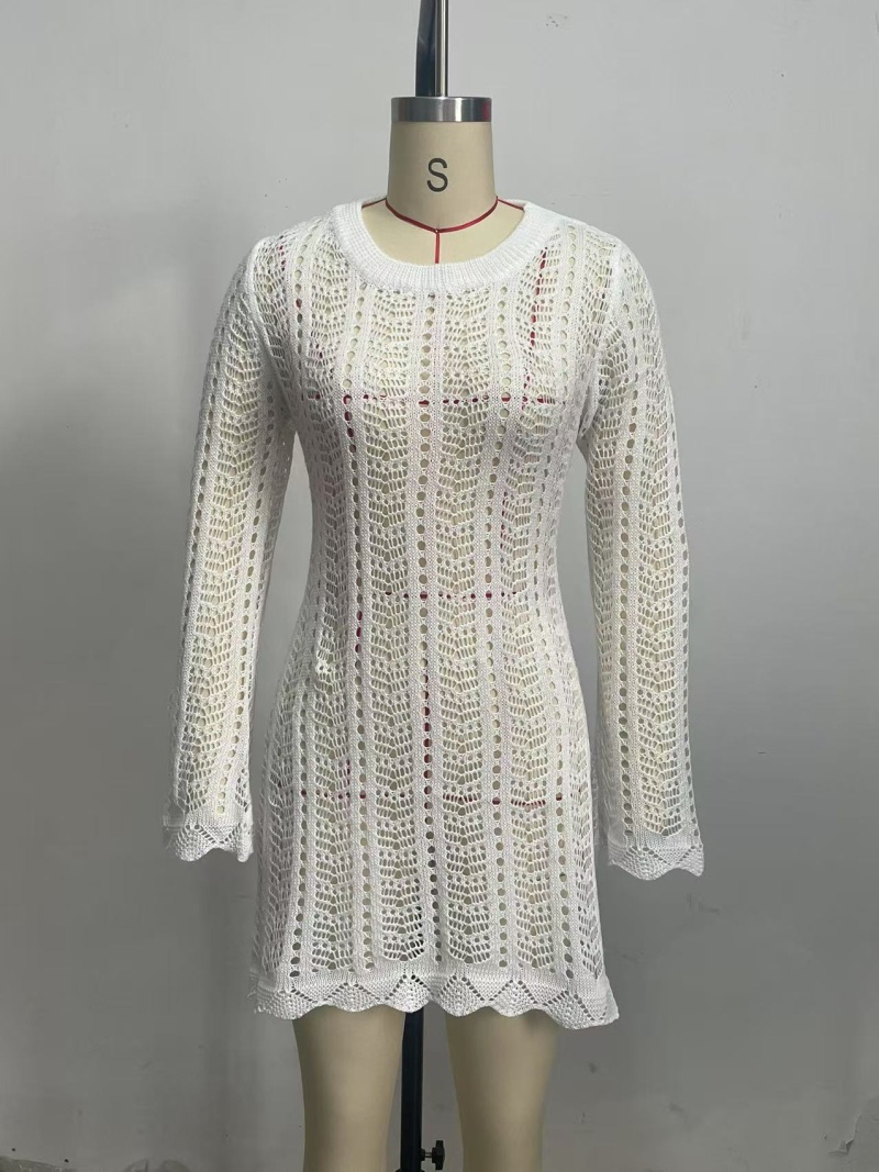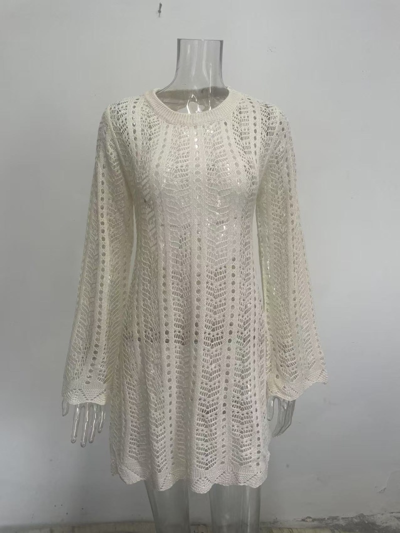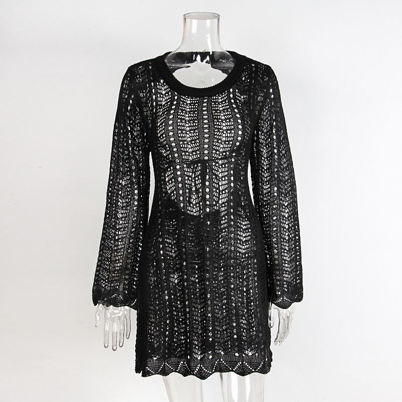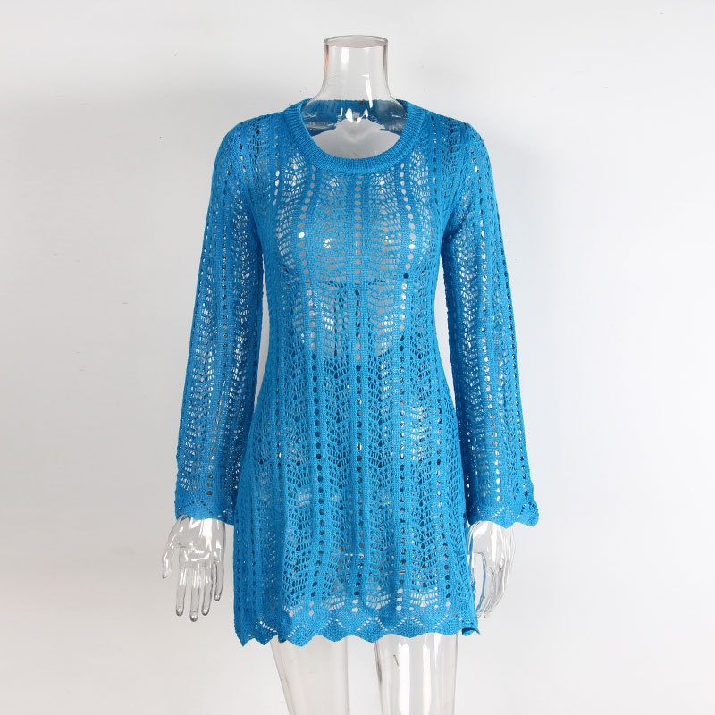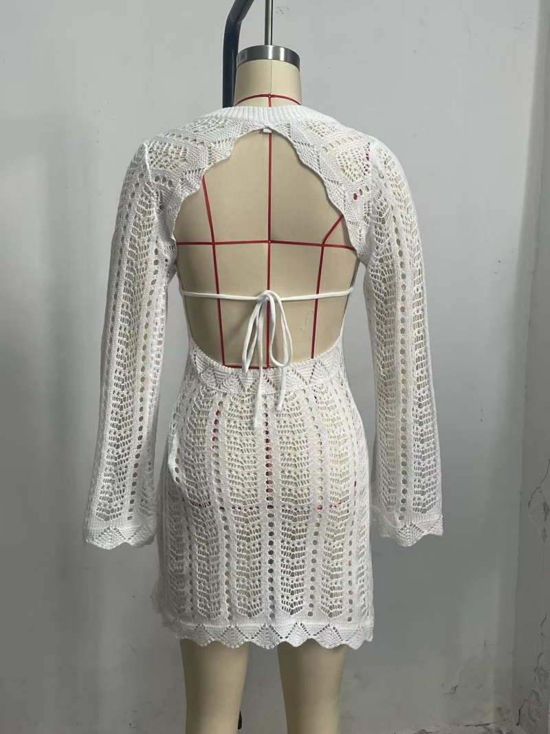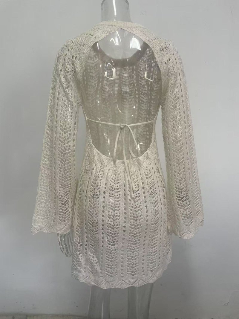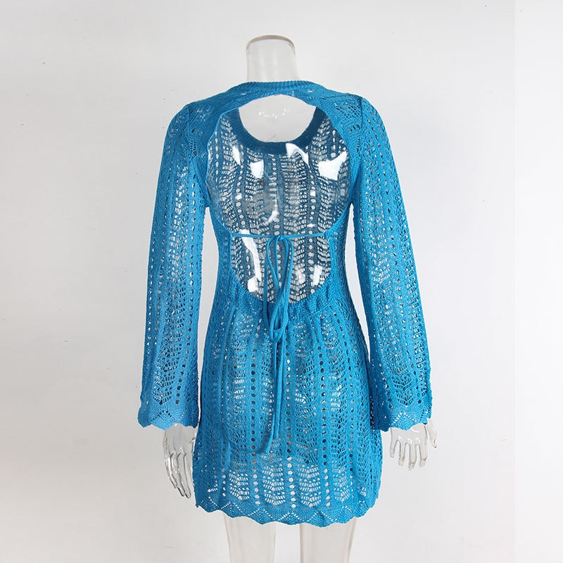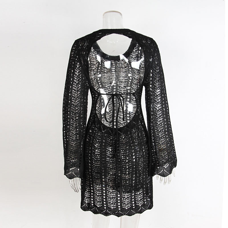 跨境欧美新款针织镂空沙滩罩衫露背绑带外搭防晒衫长袖沙滩短裙女