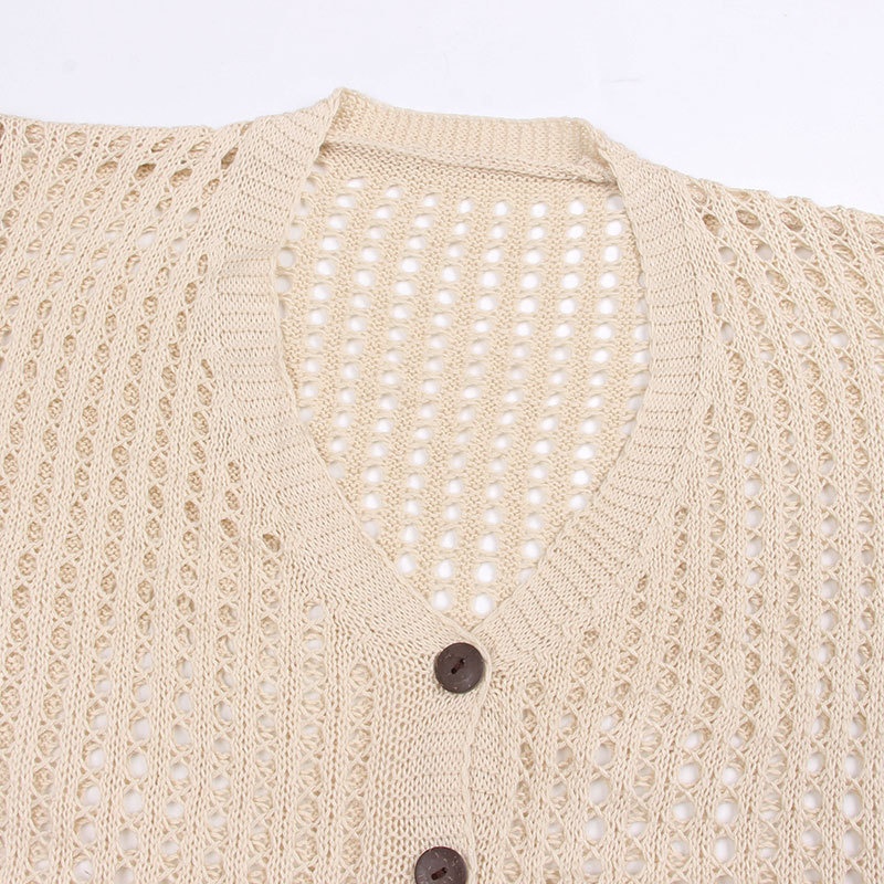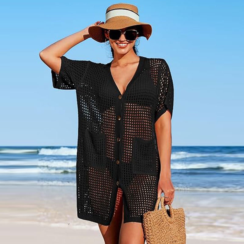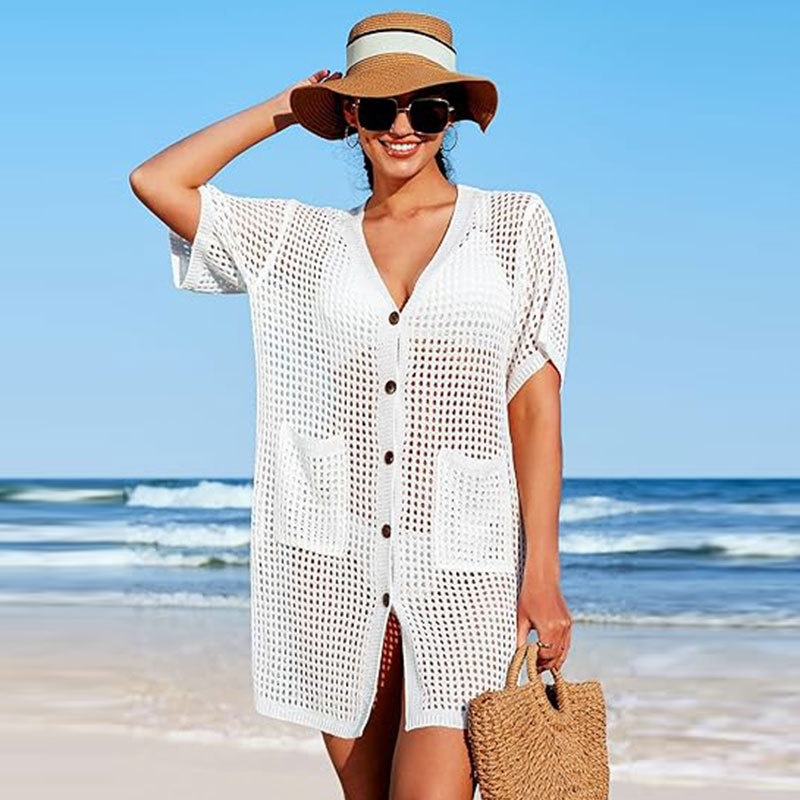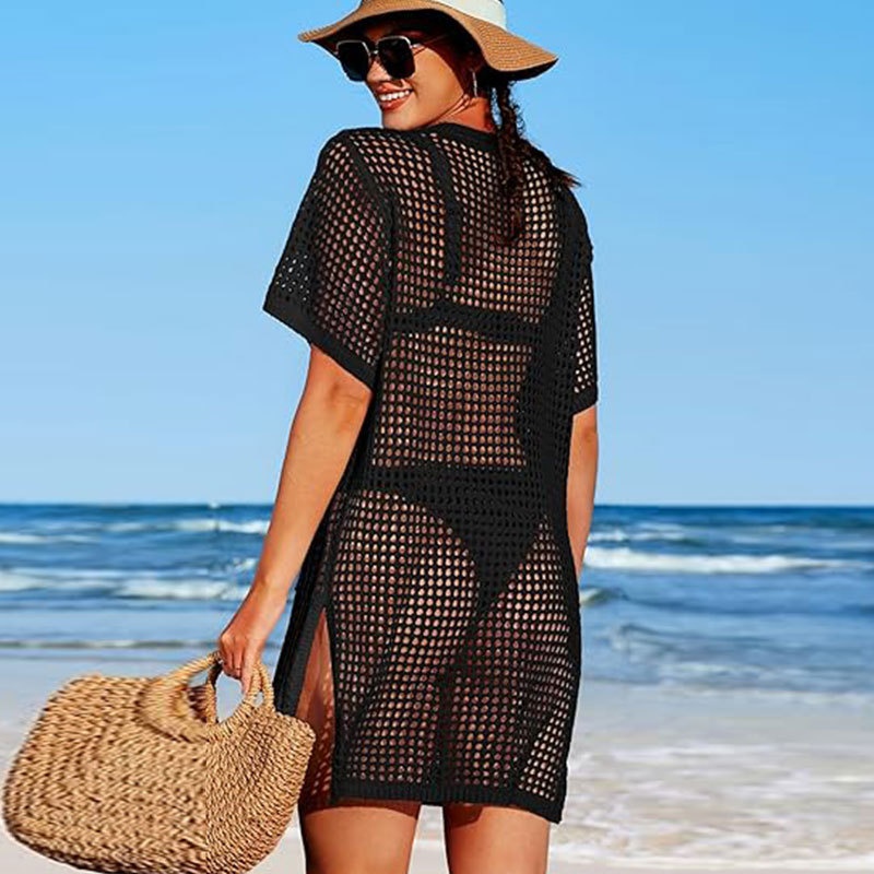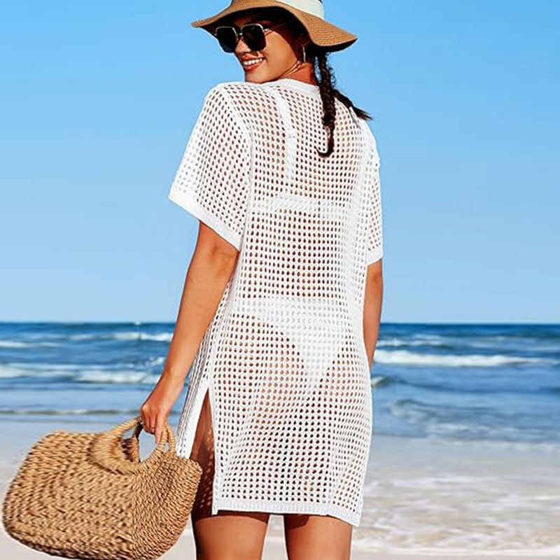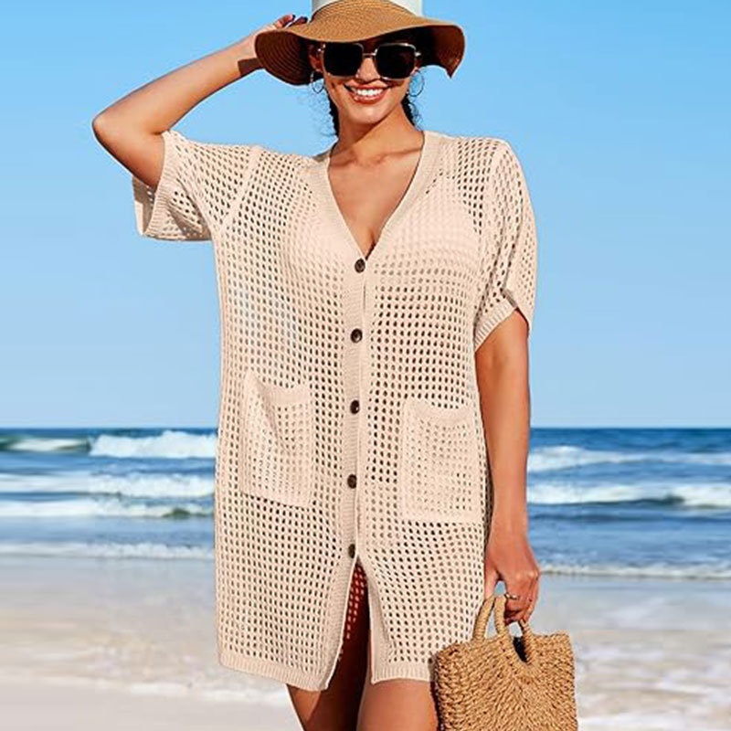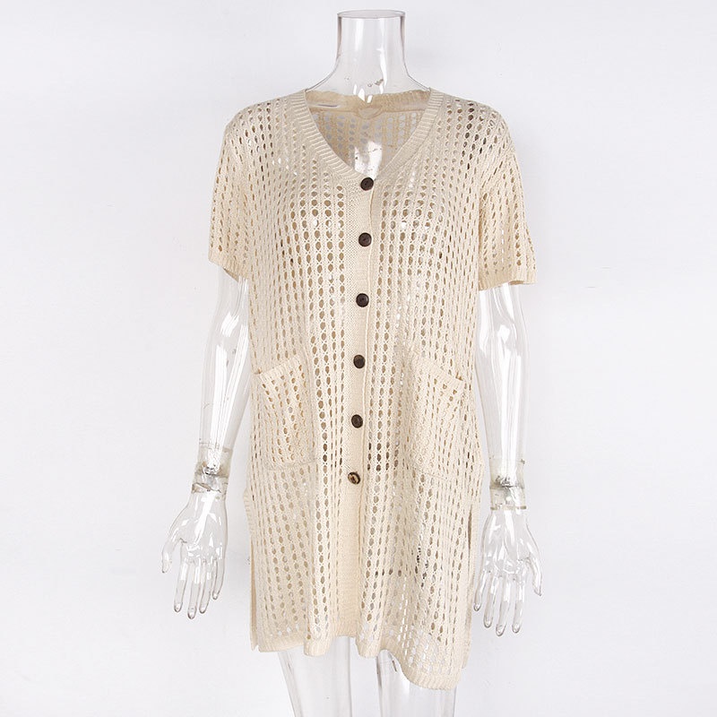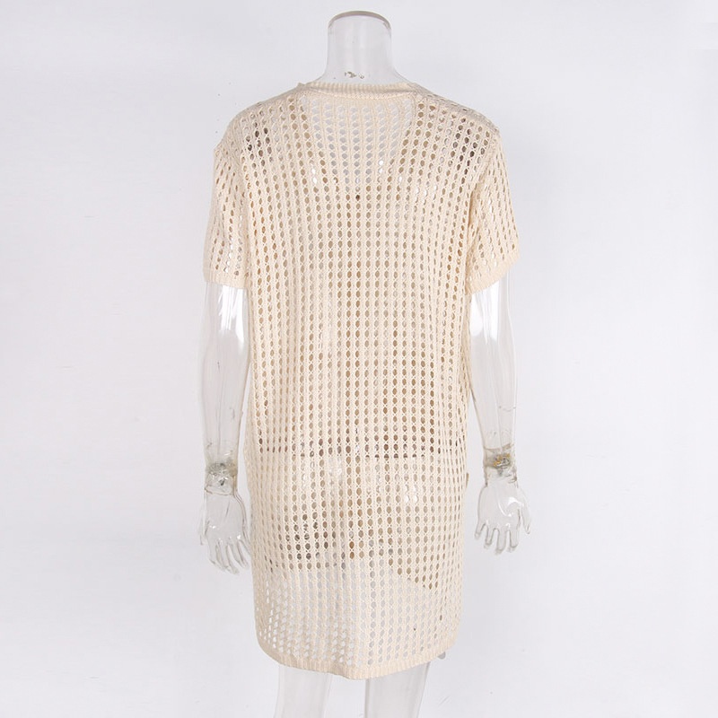 跨境欧美沙滩罩衫镂空针织短袖开衫海边度假泳衣防晒外衣女