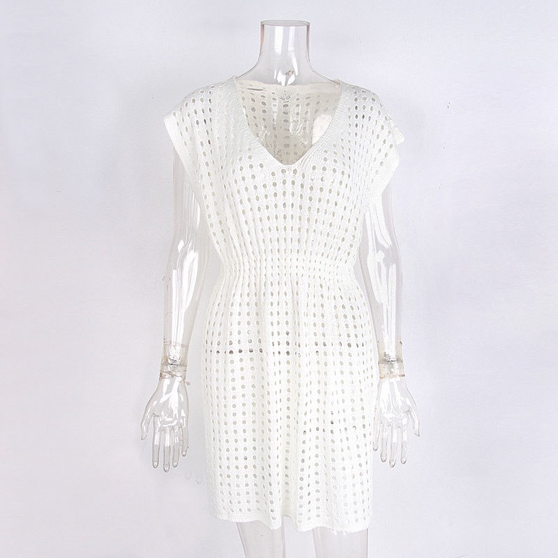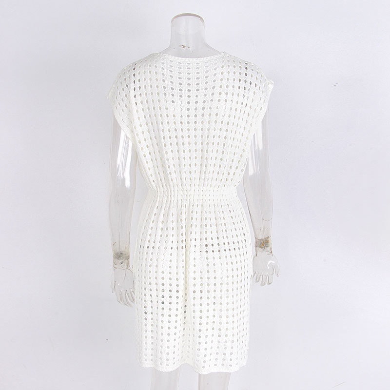 跨境欧美短袖泳衣 性感V领收腰镂空针织裙子防晒比基尼罩衫