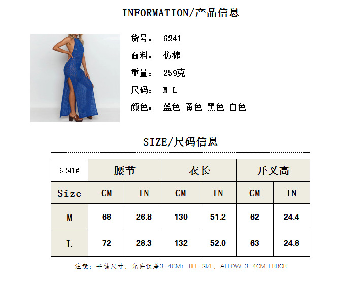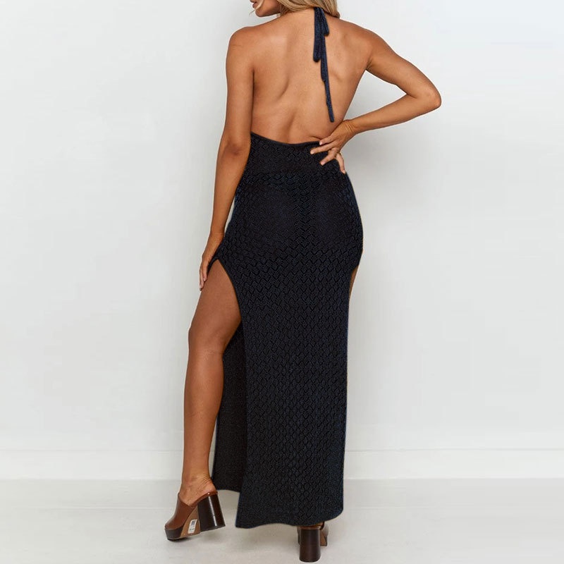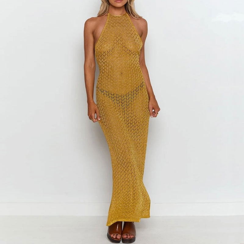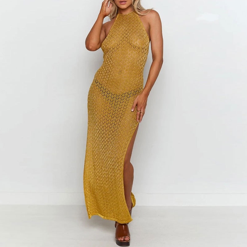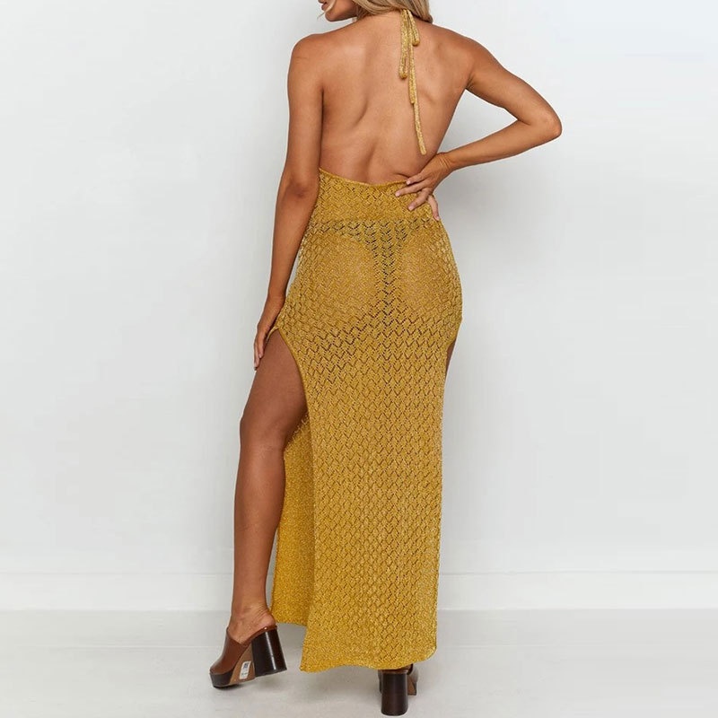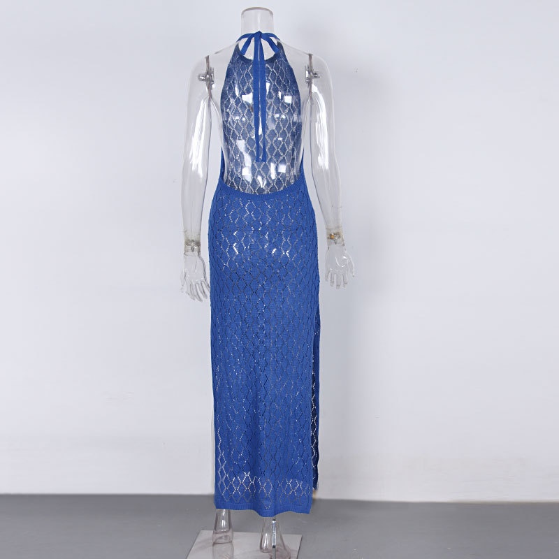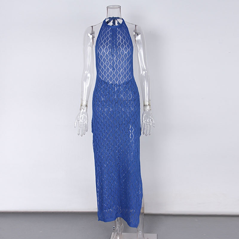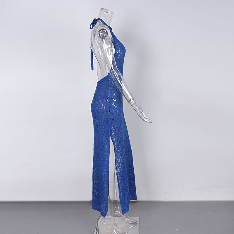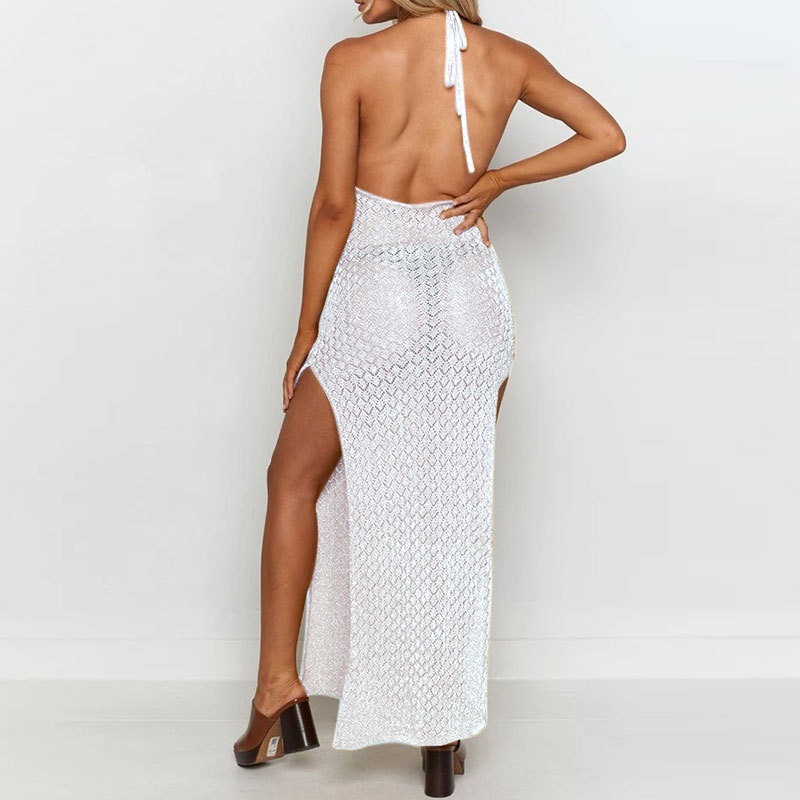 跨境新款针织镂空防晒沙滩罩衫挂脖露背开叉比基尼泳衣长裙