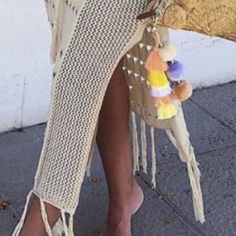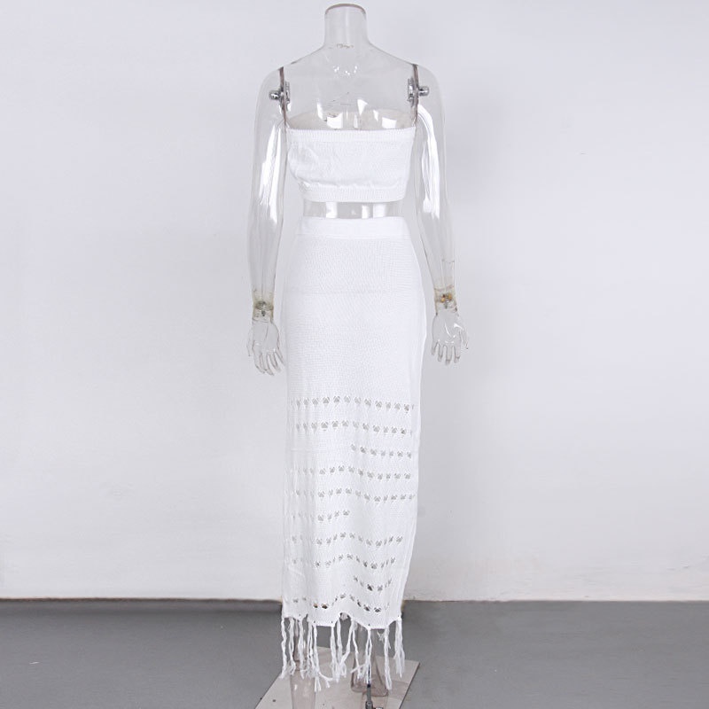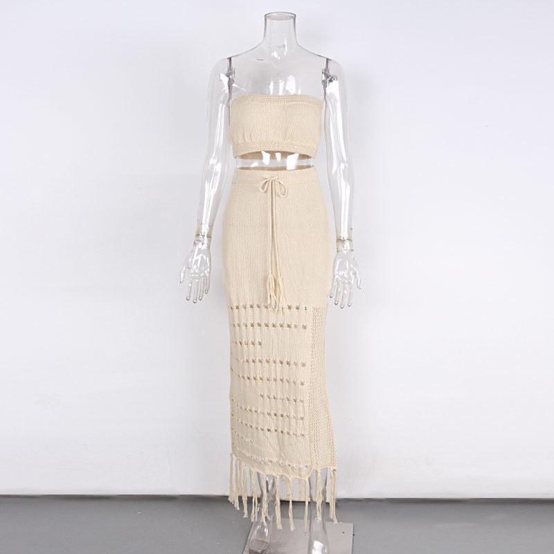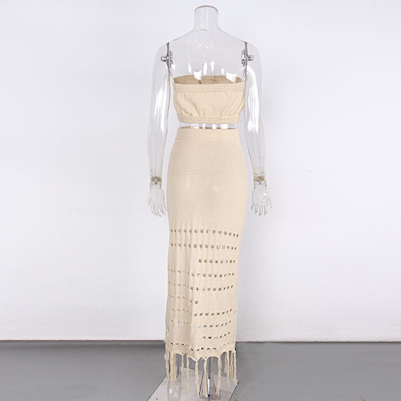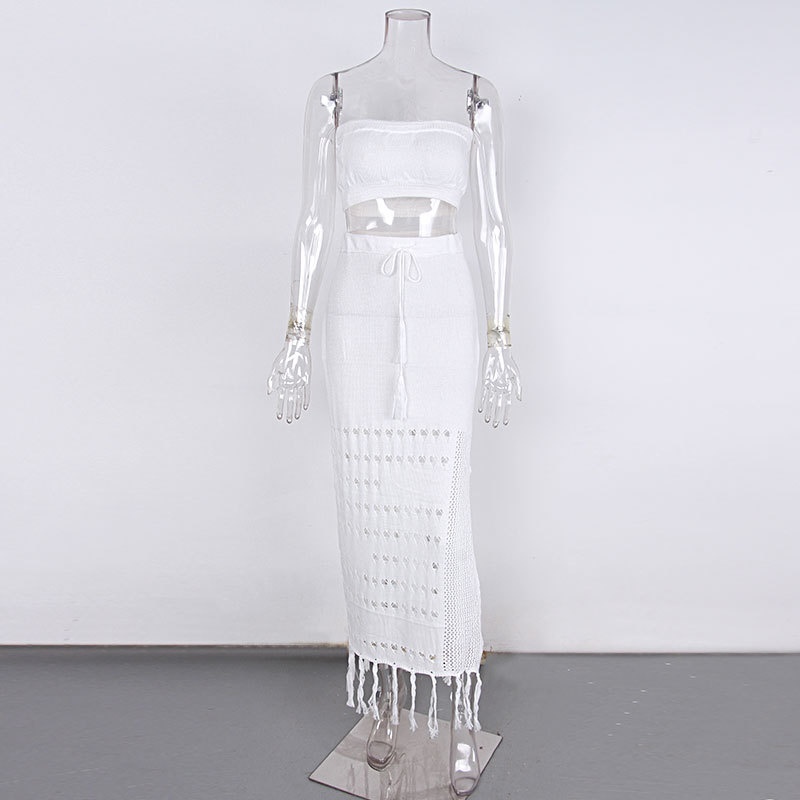 夏季新款镂空比基尼罩衫裹胸长裙两件套系带流苏沙滩防晒裙