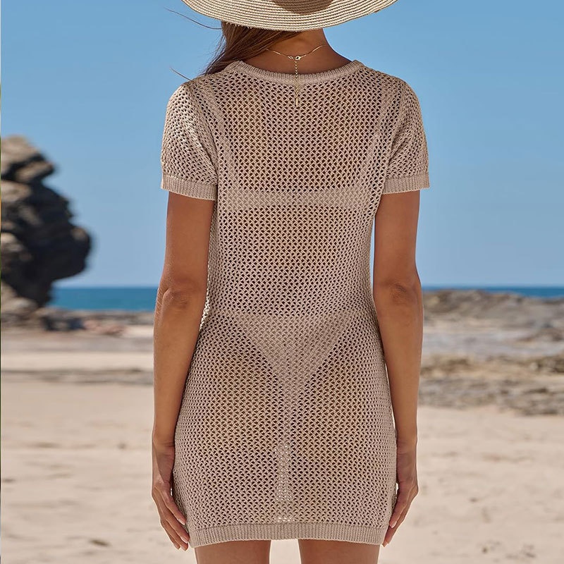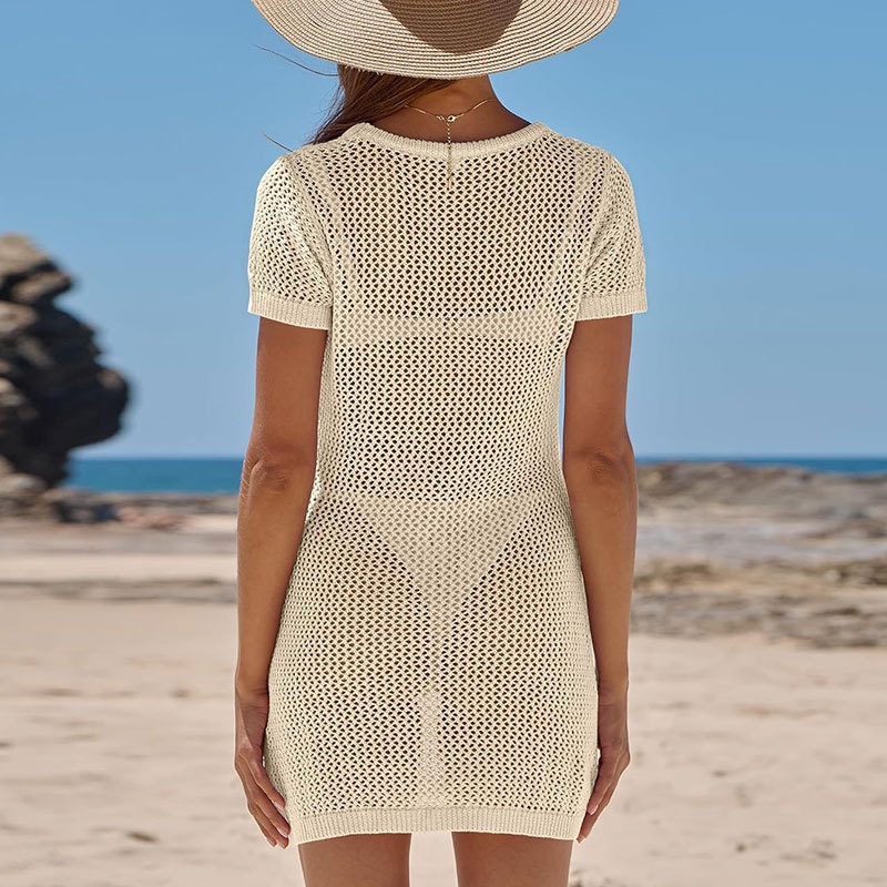 跨境欧美沙滩罩衫 性感深v领圆环镂空针织短袖度假防晒服女