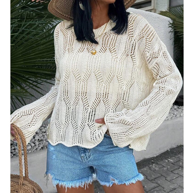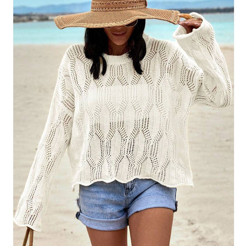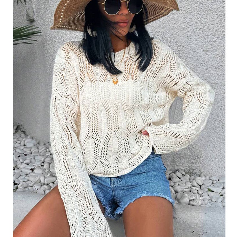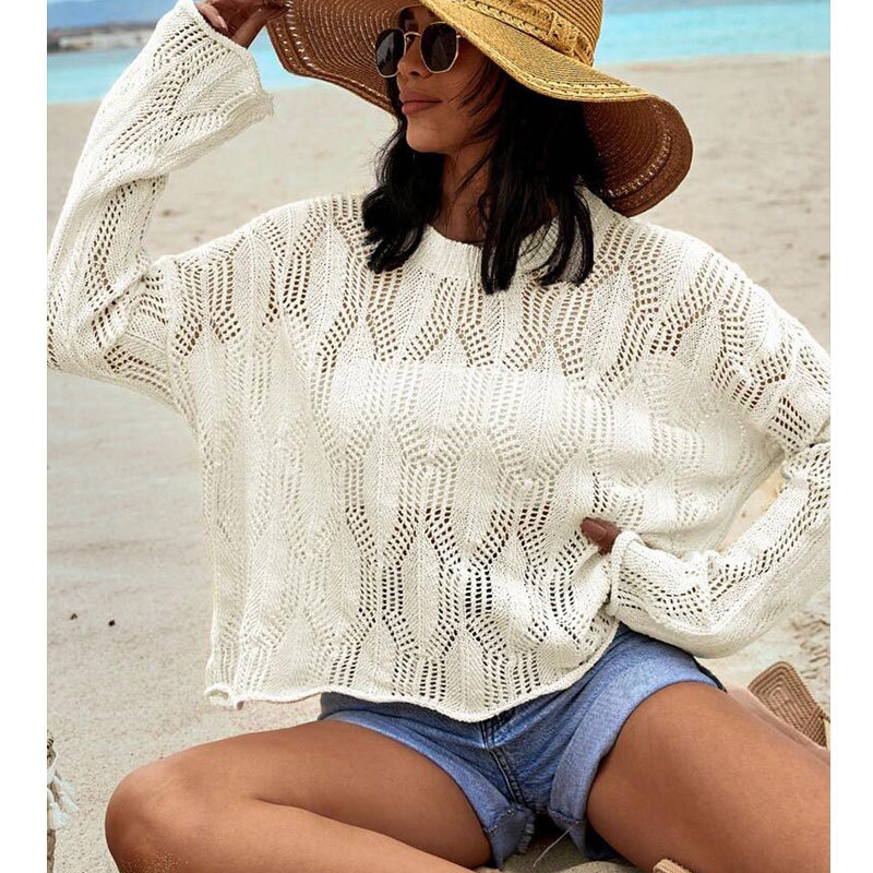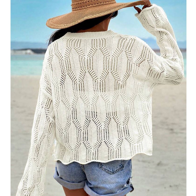 洋洋外贸新款欧美跨境沙滩罩衫纯色镂空针织勾花长袖防晒衣