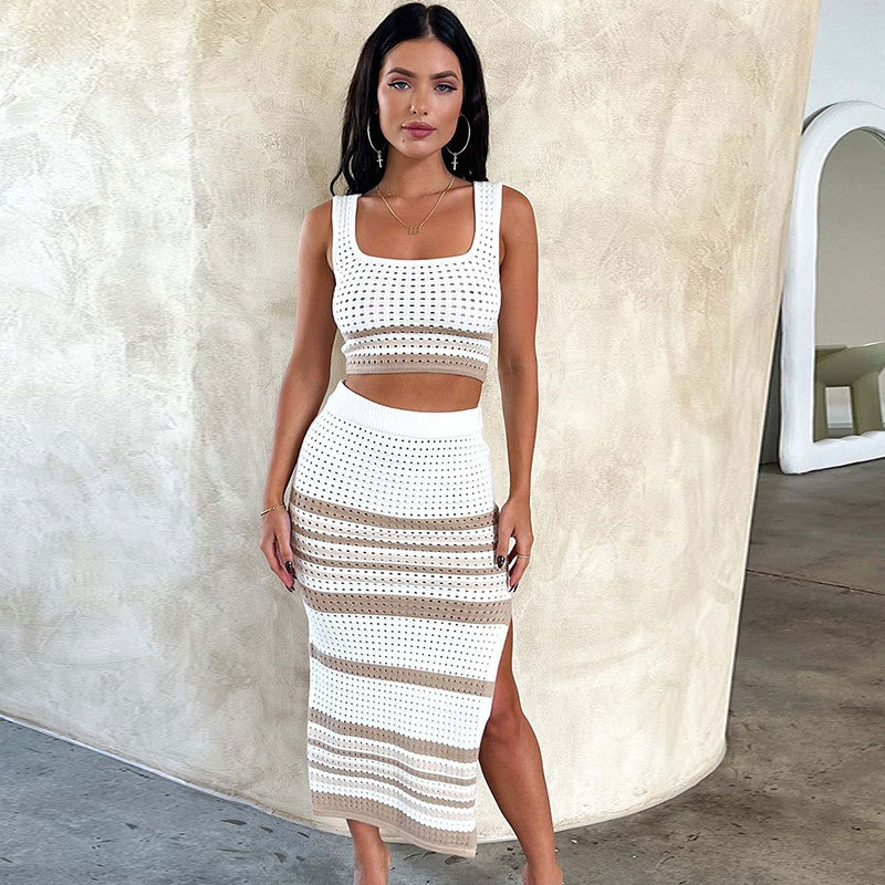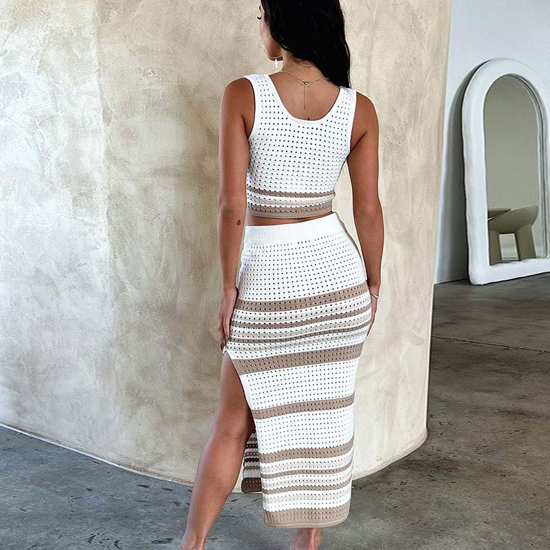 镂空比基尼罩衫条纹短款上衣分叉包臀半身裙两件套连衣裙女