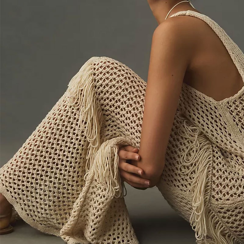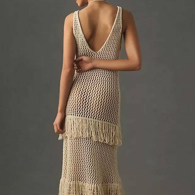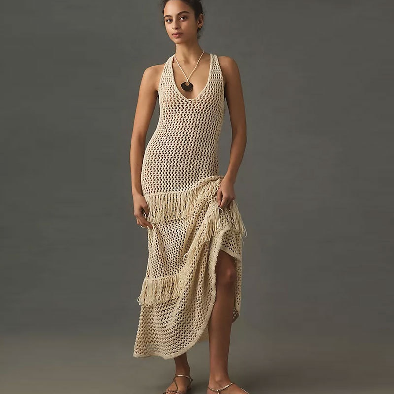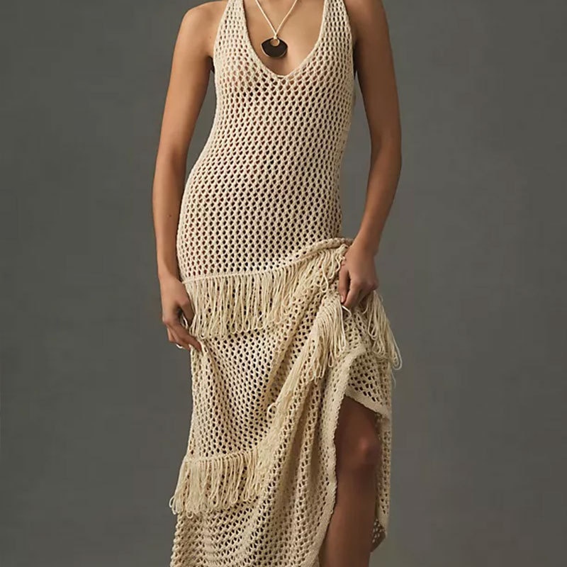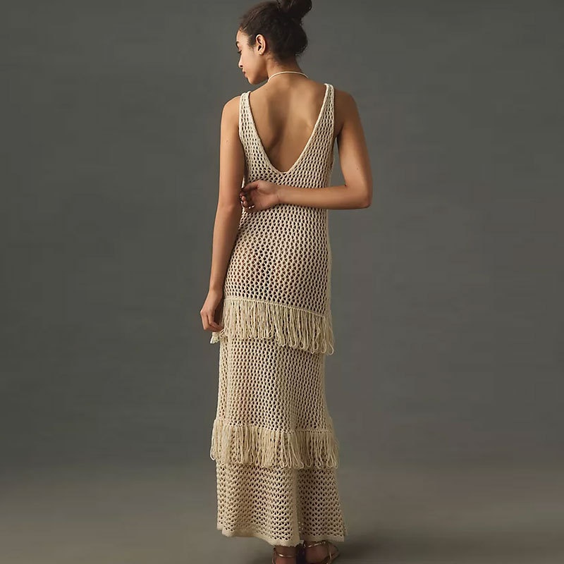 跨境欧美沙滩衣长款绑带流苏沙滩长裙女性感露背比基尼罩衫
