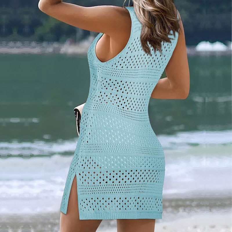 欧美针织罩衫 跨境外贸镂空背心罩衫外搭短裙无袖镂空针织沙滩裙
