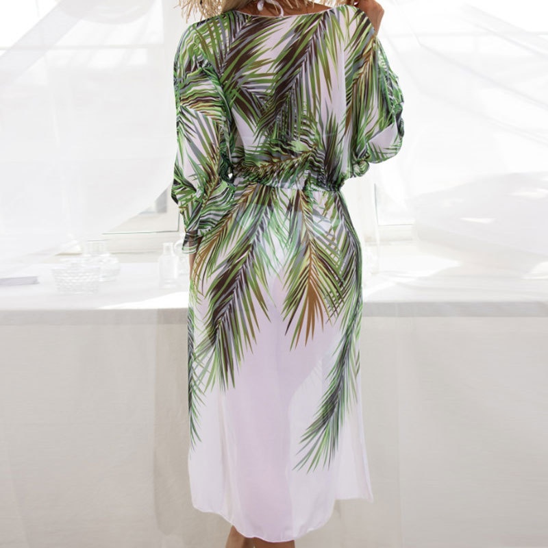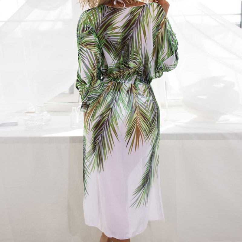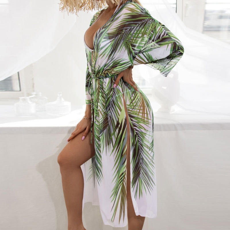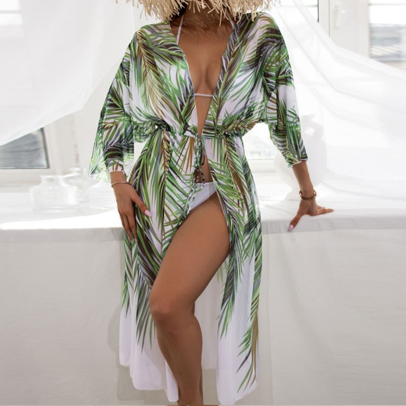 新款泳衣雪纺度假防晒衣绿叶图案印花防晒开衫比基尼外罩衫