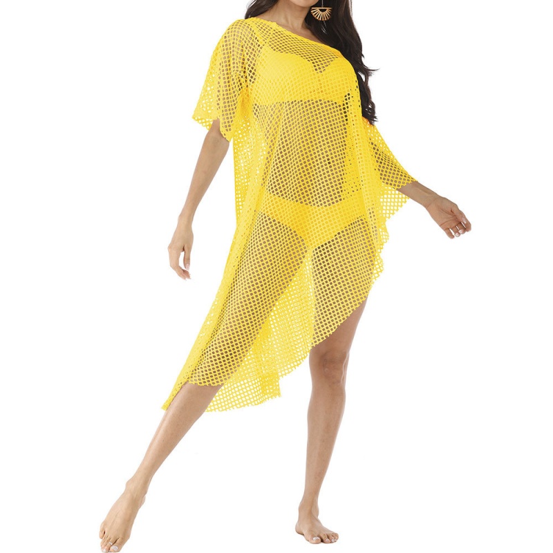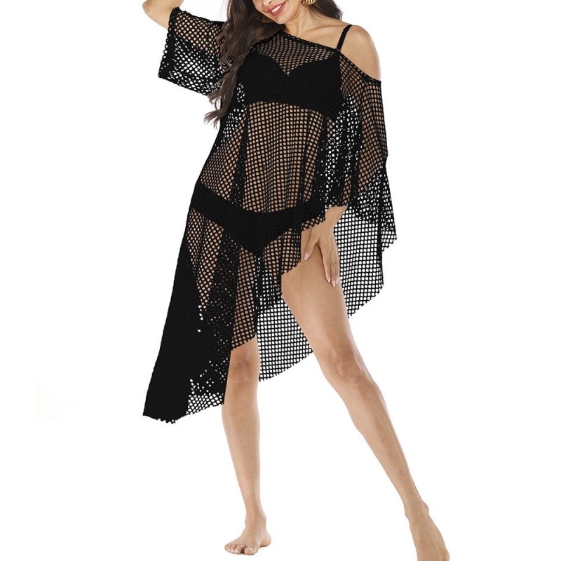 新款沙滩罩衫套头中袖短款沙滩防晒海边度假大码宽松镂空针织罩衫