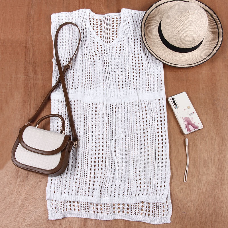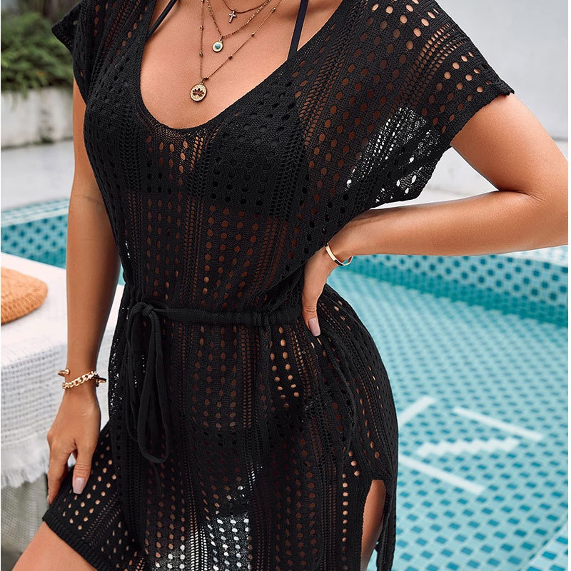 欧美跨境新款镂空沙滩防晒罩衫绑带V领透视泳衣比基尼外搭