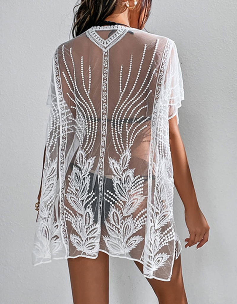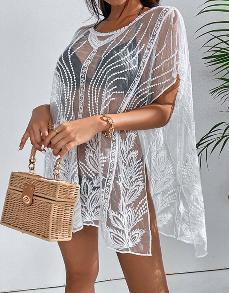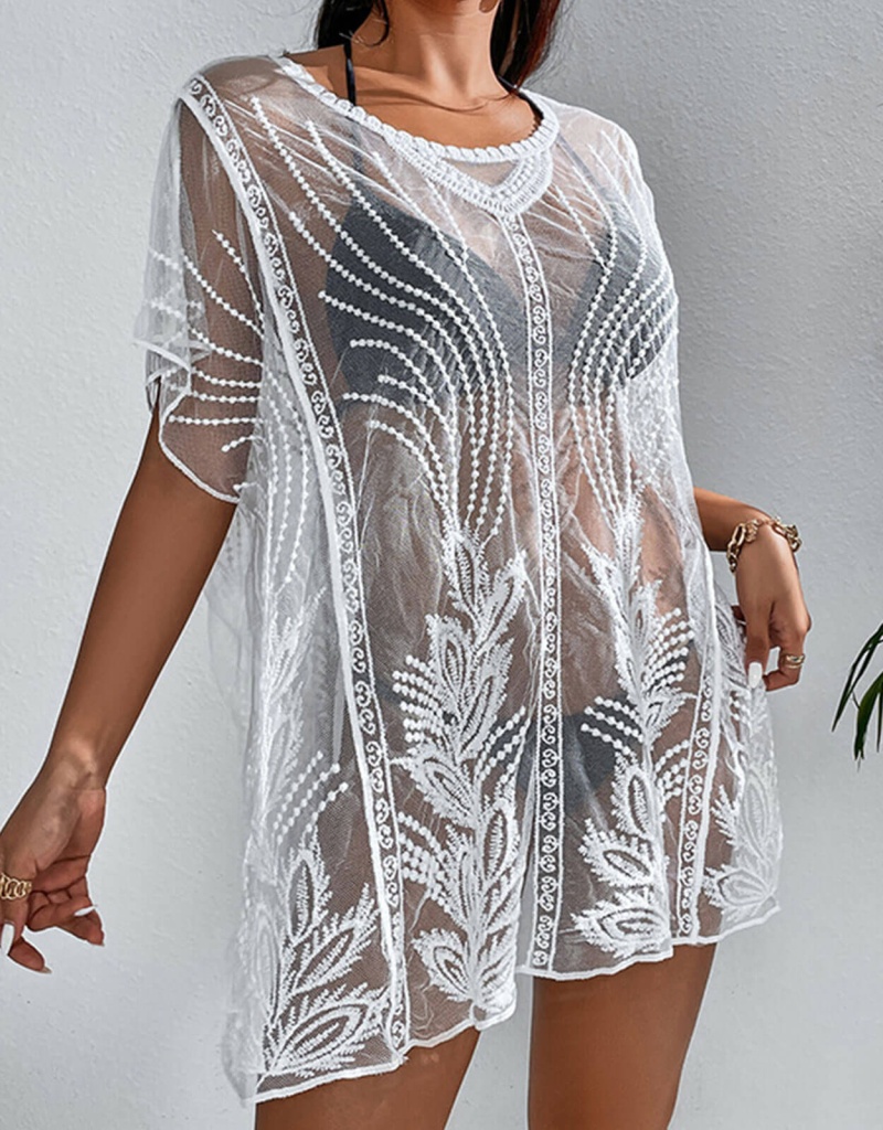 跨境欧美沙滩防晒网纱透视蕾丝宽松套头比基尼泳衣外搭短袖罩衫女