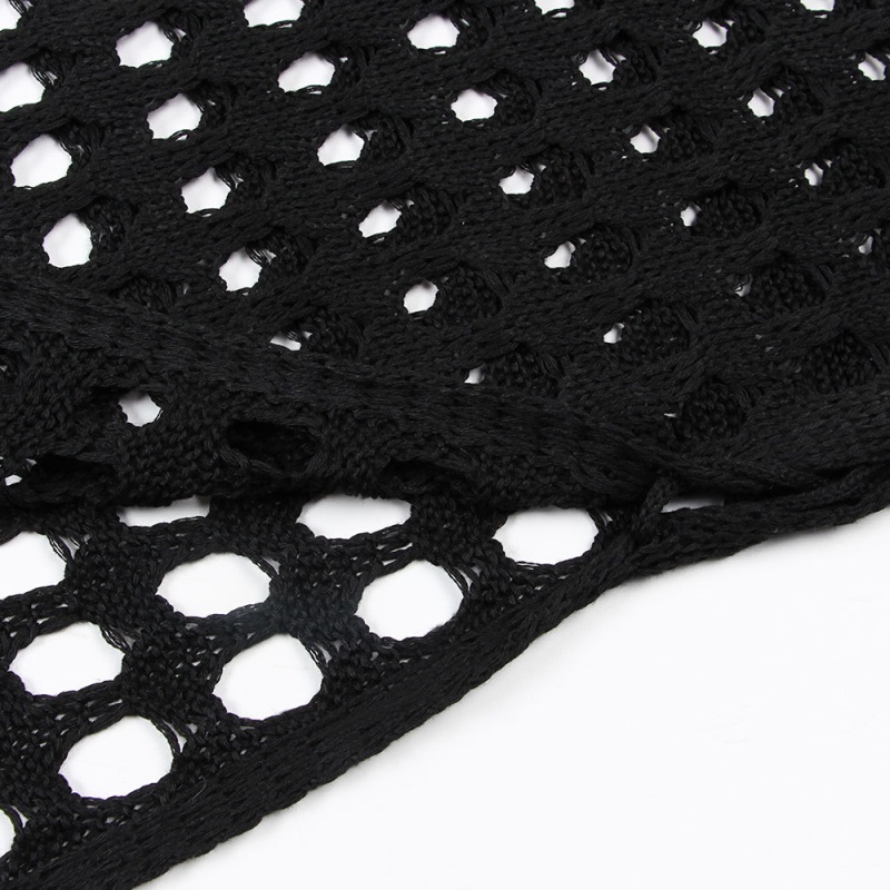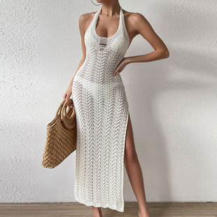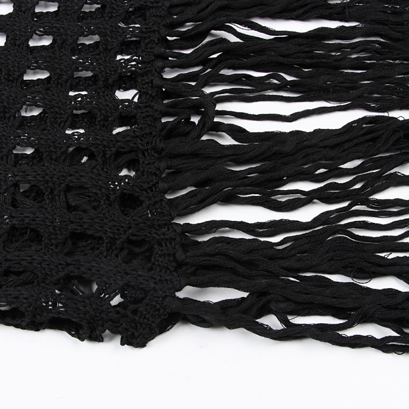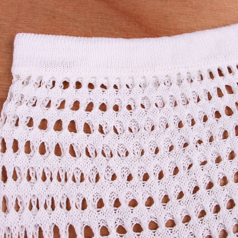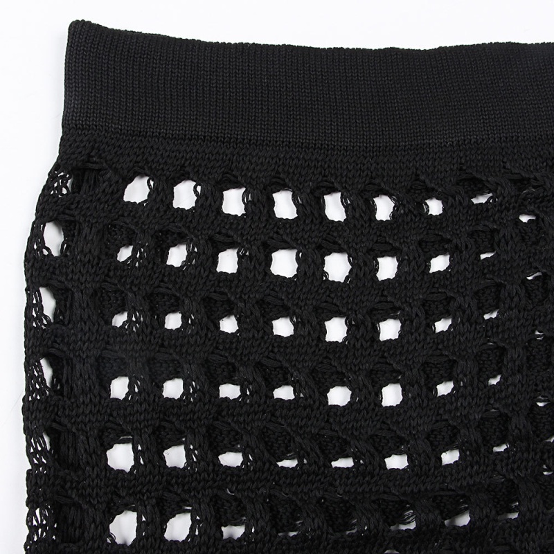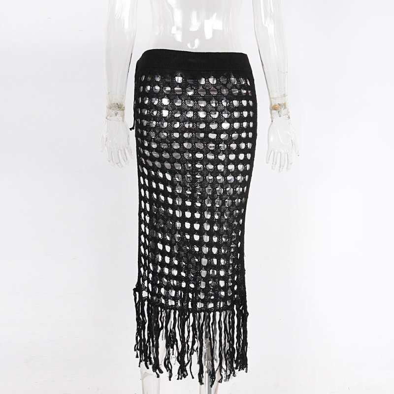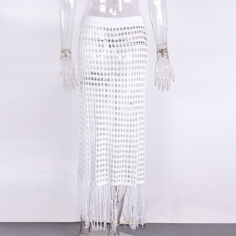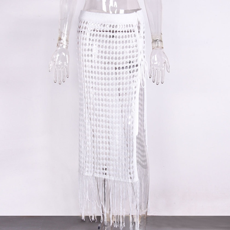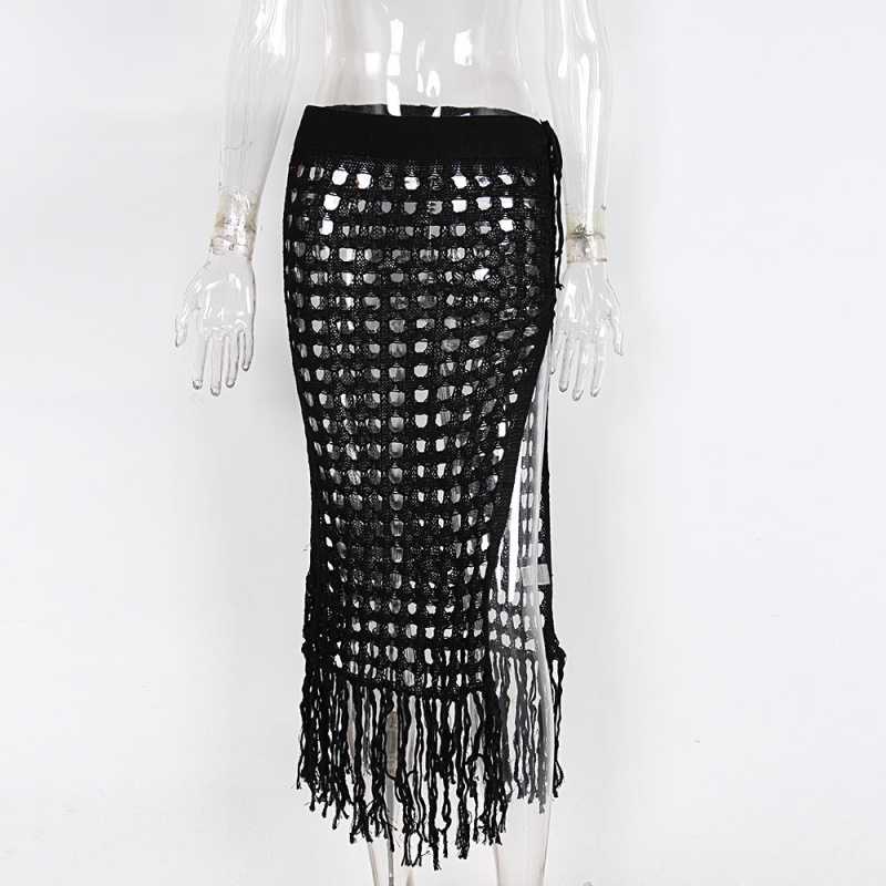 欧美跨境新款夏季沙滩防晒裙性感开叉透视网格镂空流苏针织半身裙