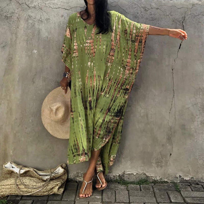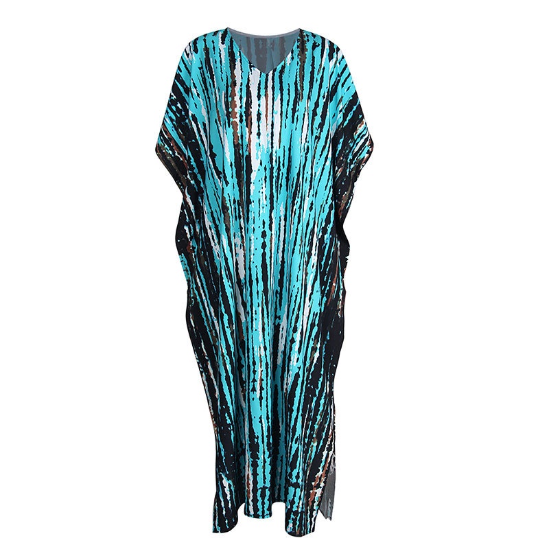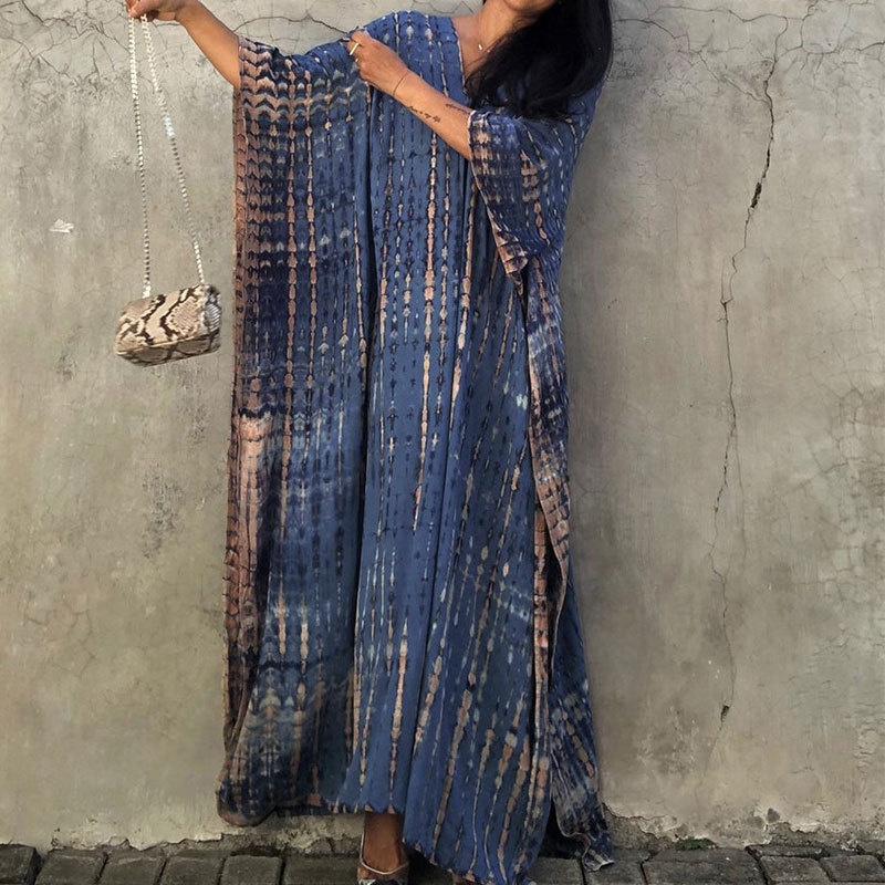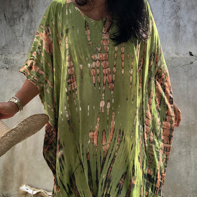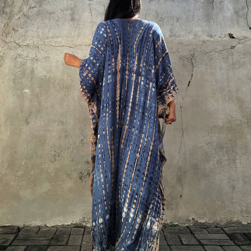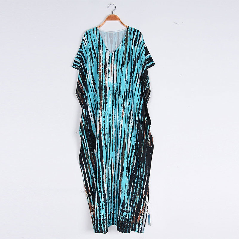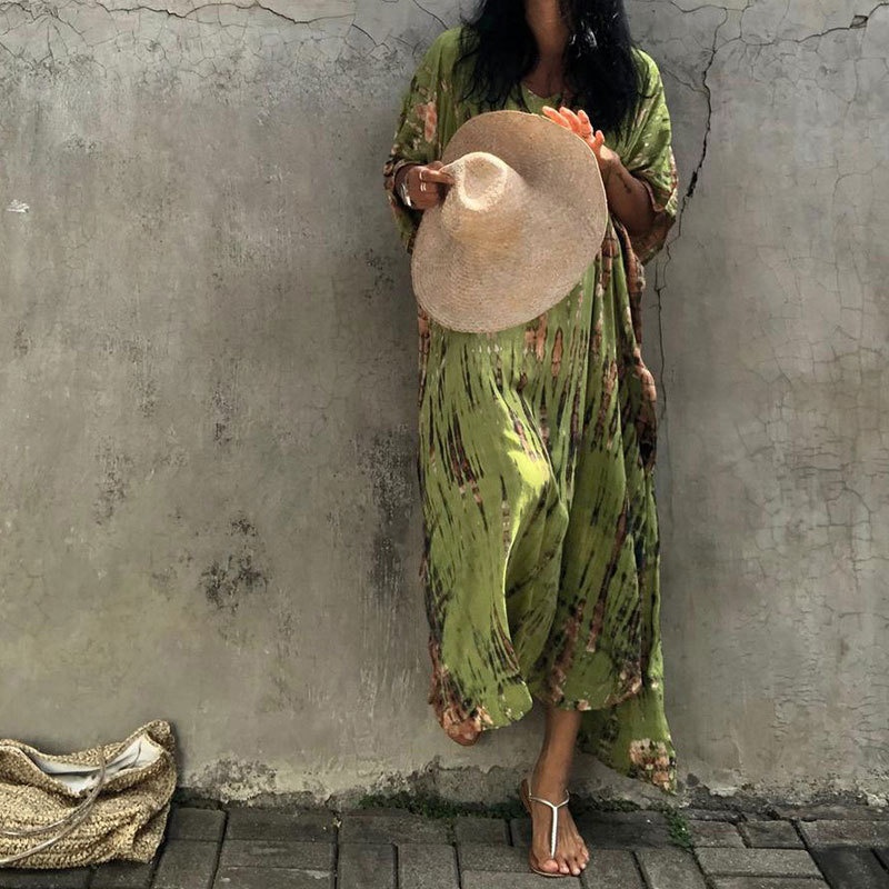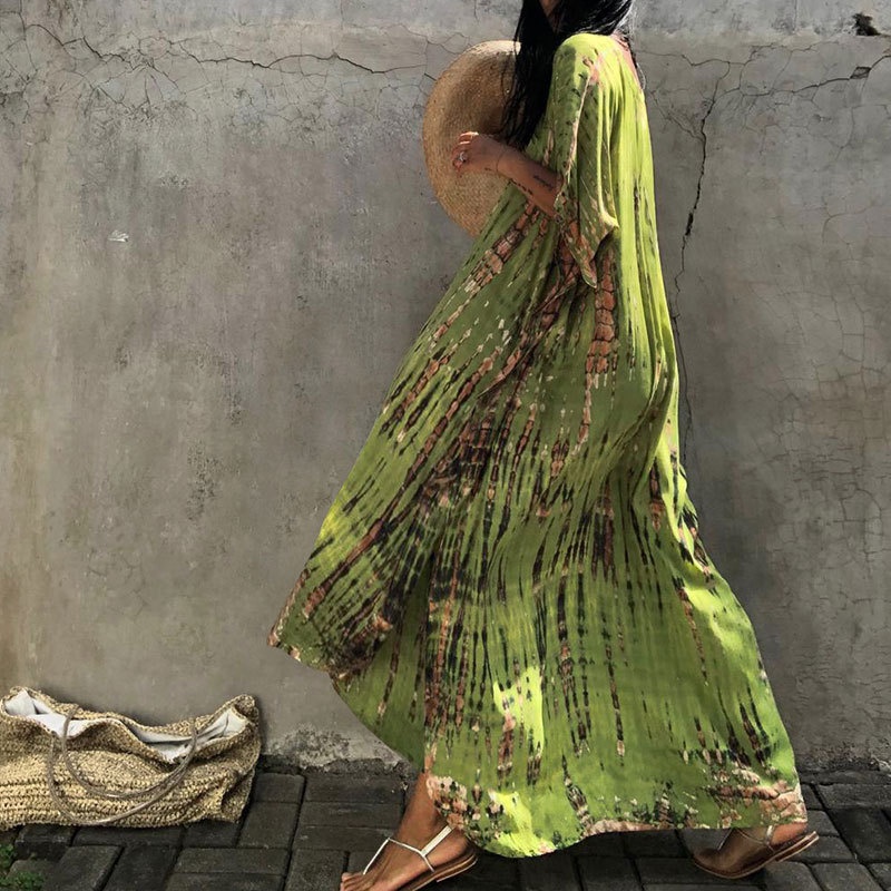 夏季新款欧美沙滩度假防晒衣人棉晕染花度假长袍连衣裙罩衫