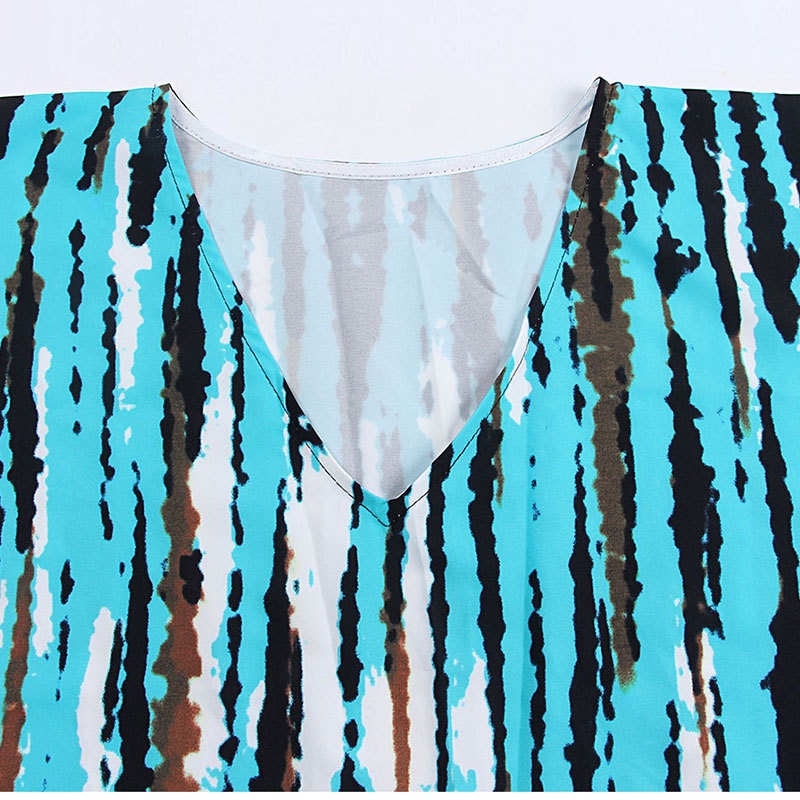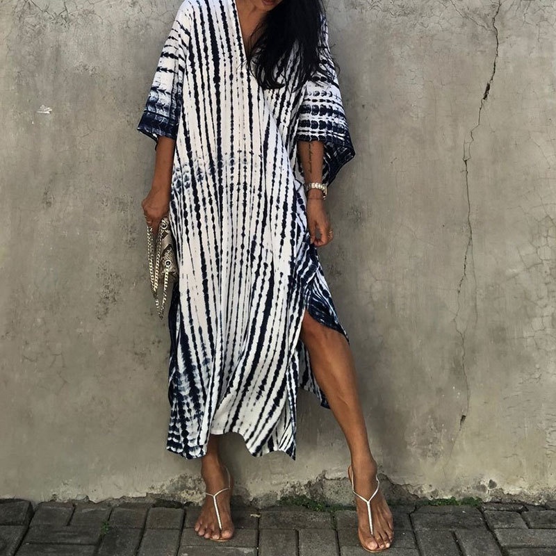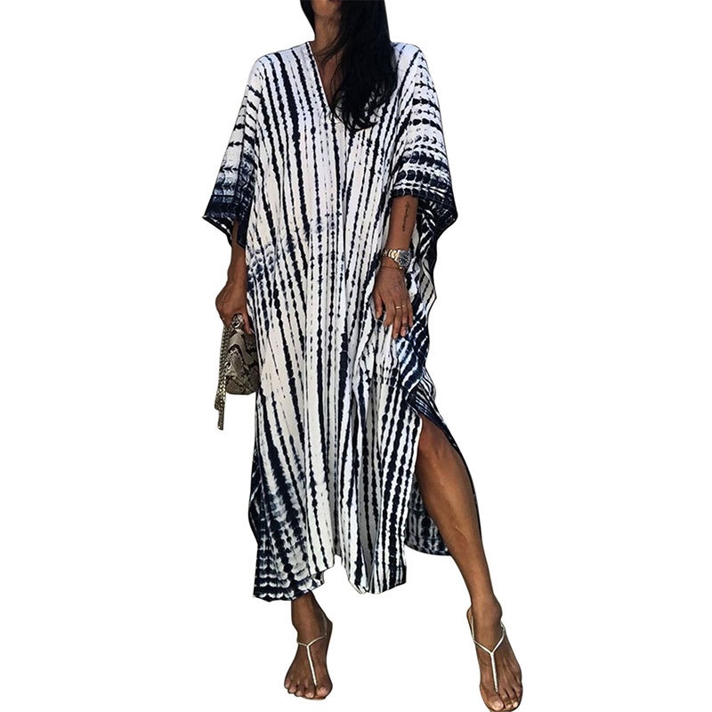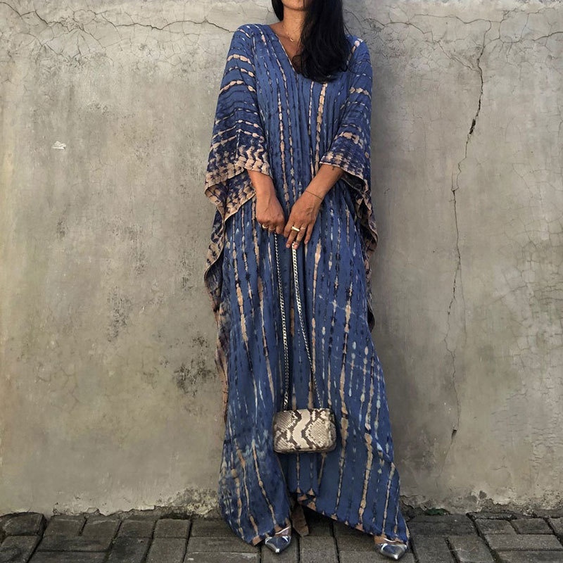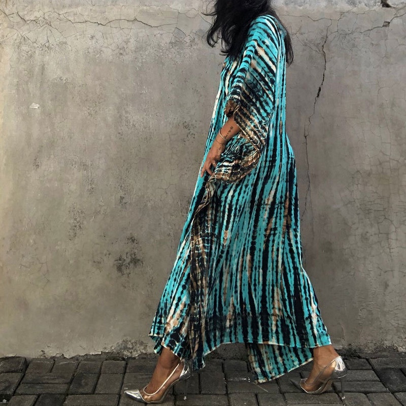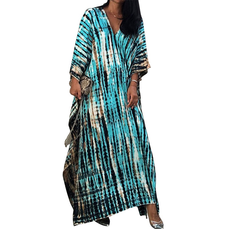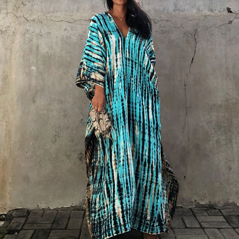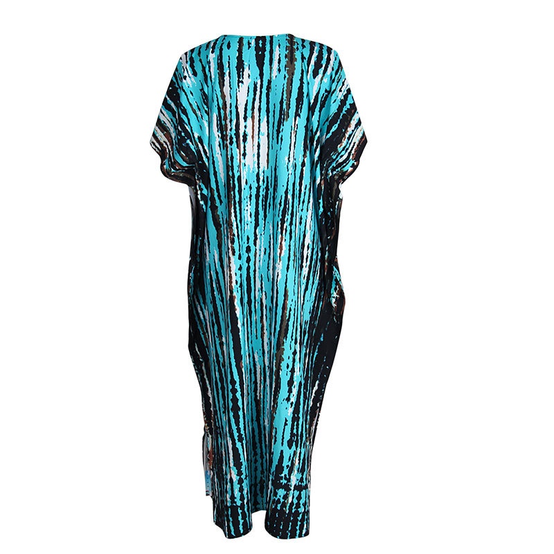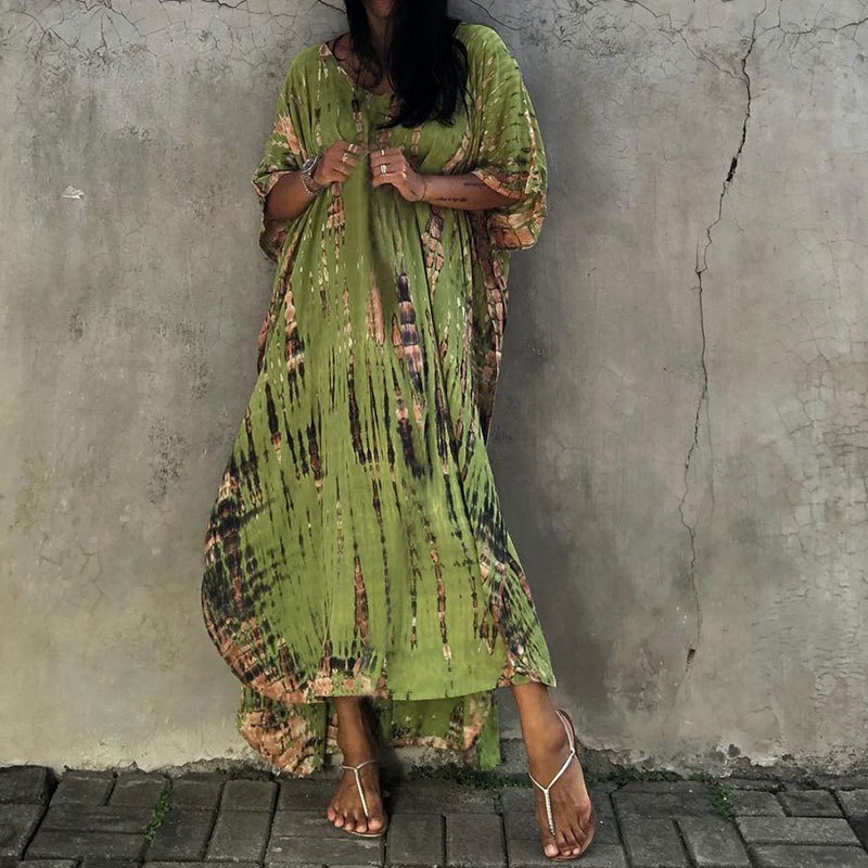 夏季新款欧美沙滩度假防晒衣人棉晕染花度假长袍连衣裙罩衫
