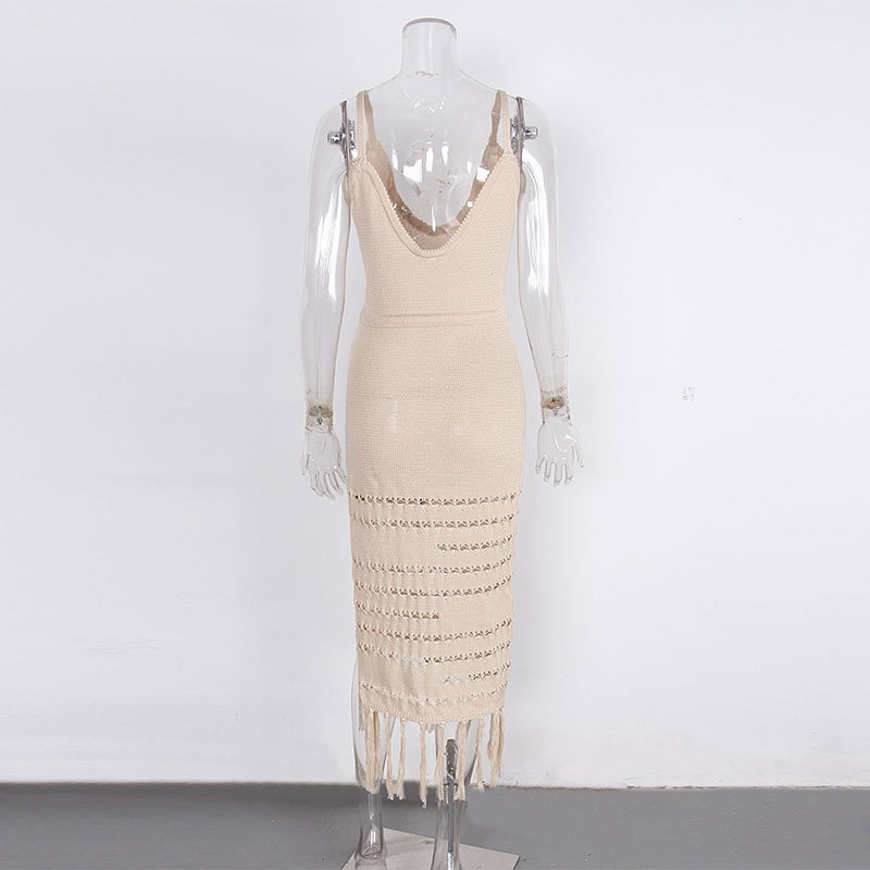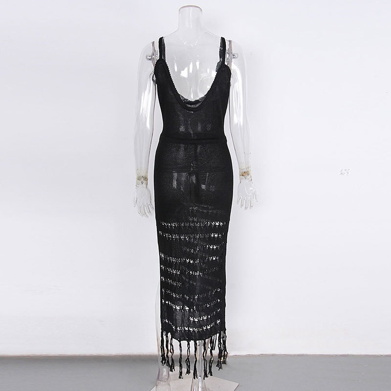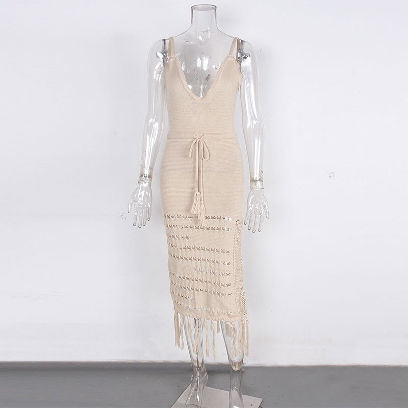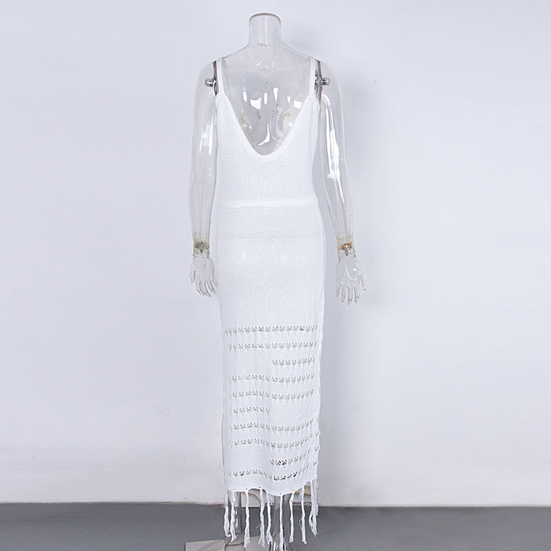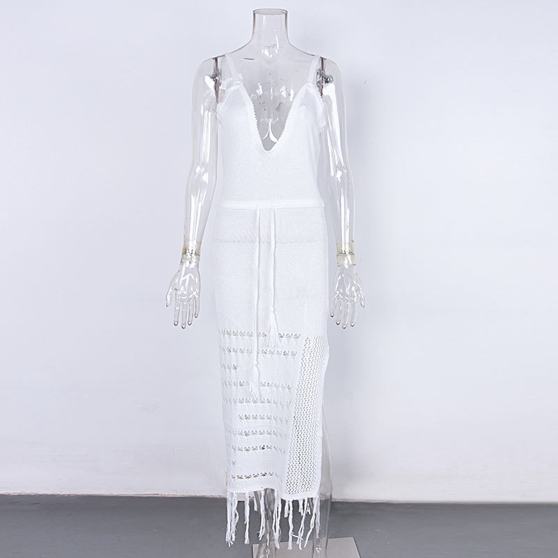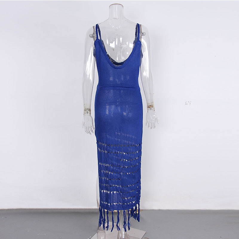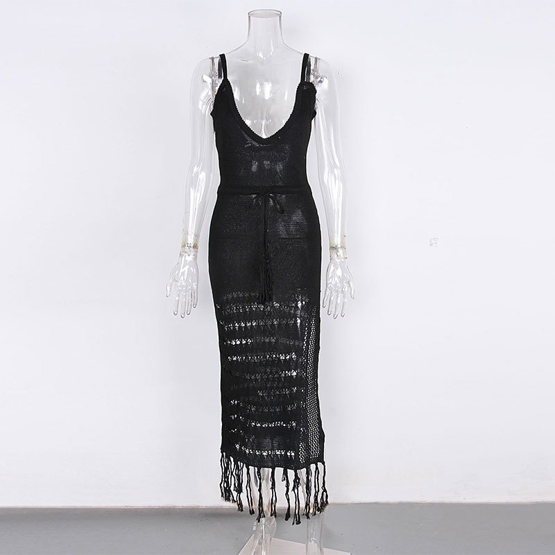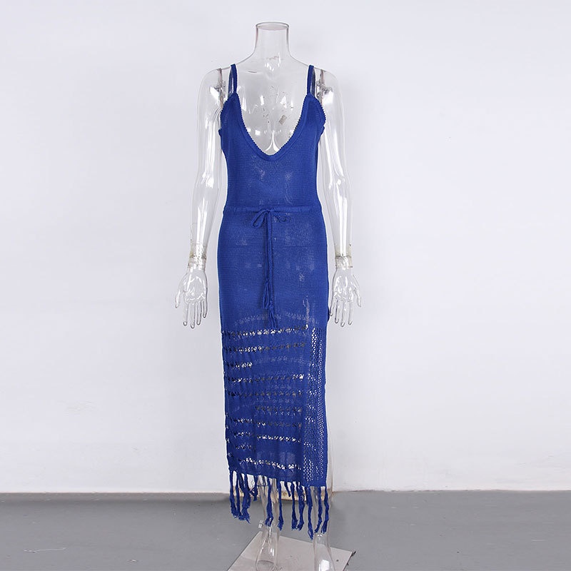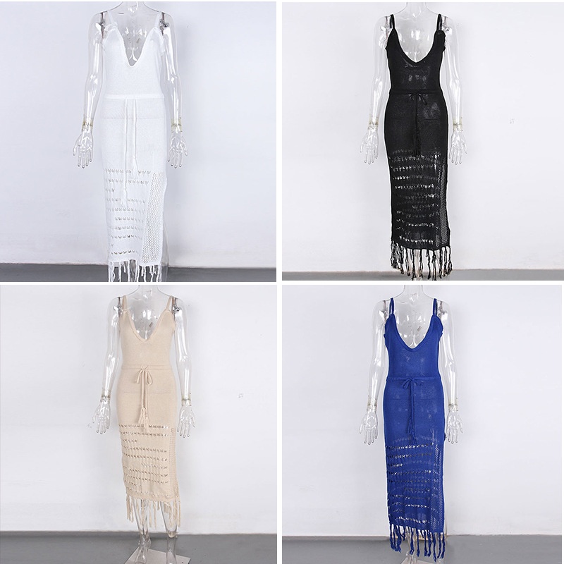 跨境新款沙滩罩衫长款镂空系带流苏女装长裙比基尼泳衣外套