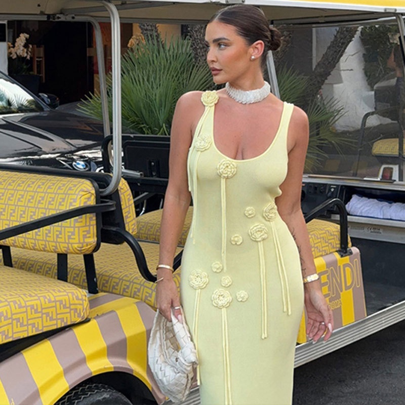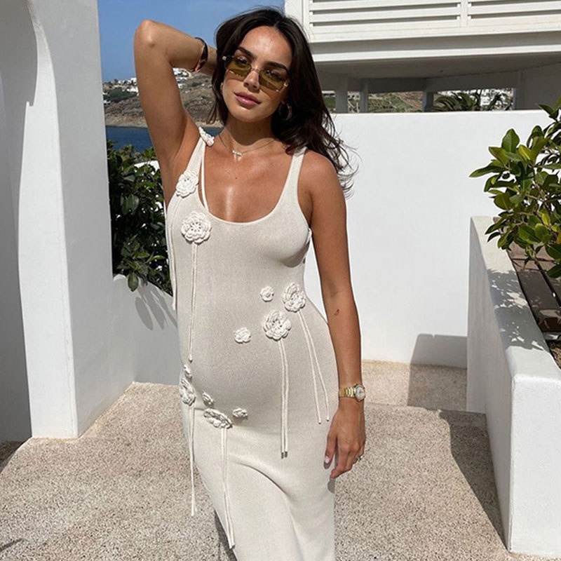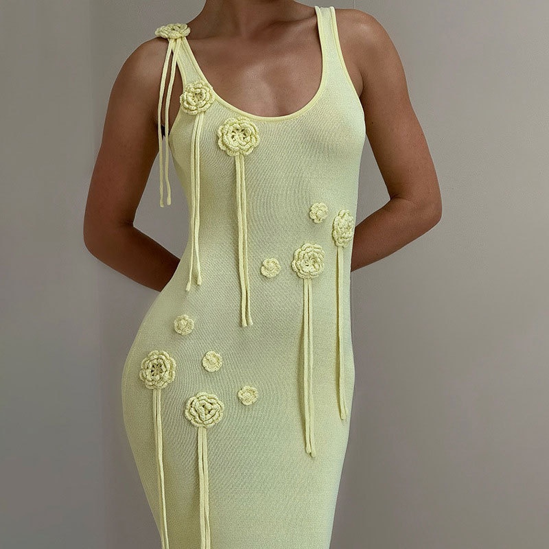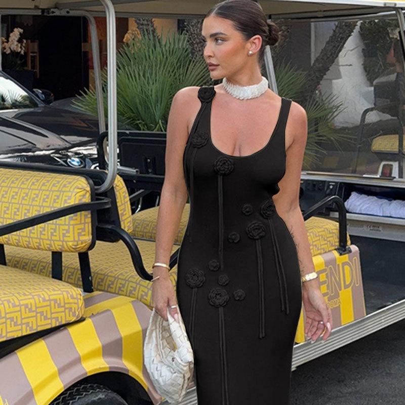 跨境新款 度假连衣裙立体花性感修身U领透气时尚吊带后开叉沙滩裙