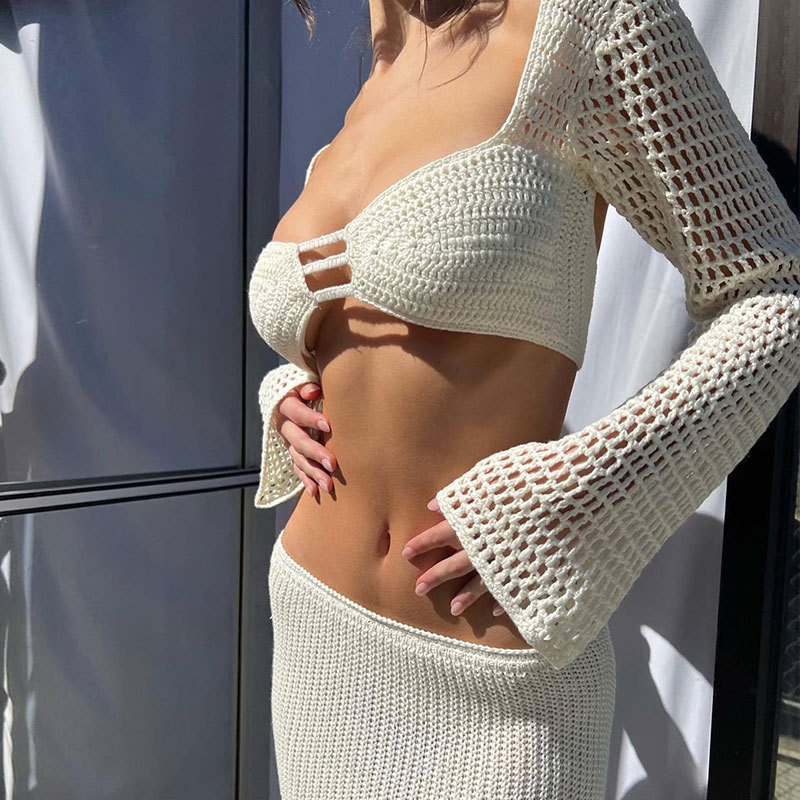 洋洋欧美新款跨境系绳长袖包臀休闲针织长裙套装沙滩罩衫女