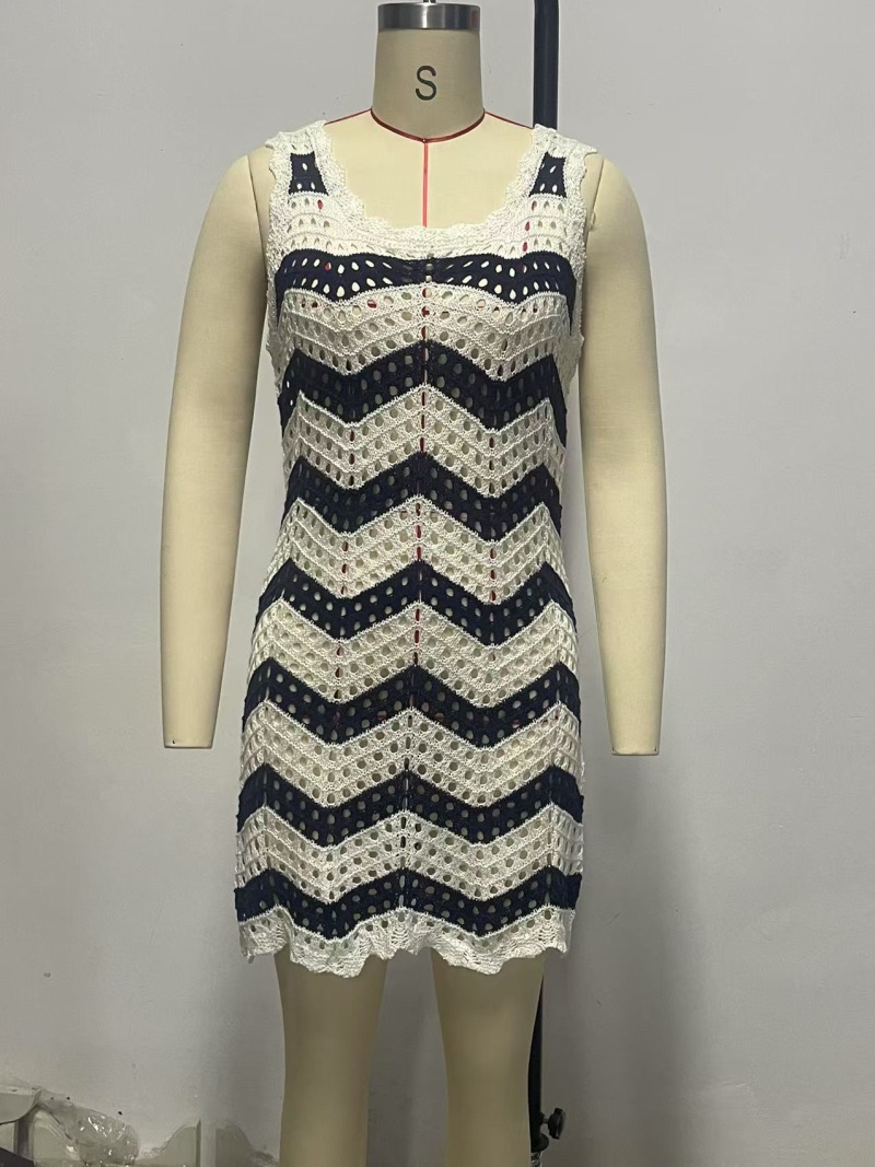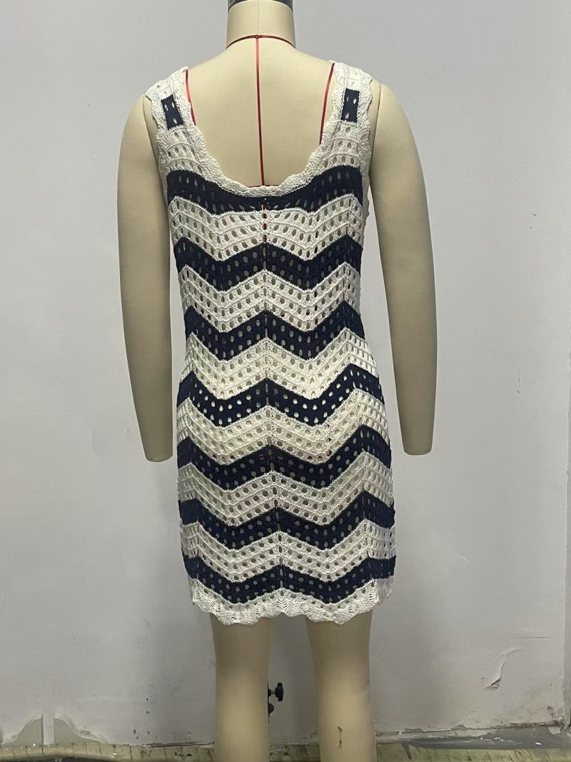 洋洋夏季新款欧美沙滩罩衫跨境针织镂空波浪提花条纹防晒裙