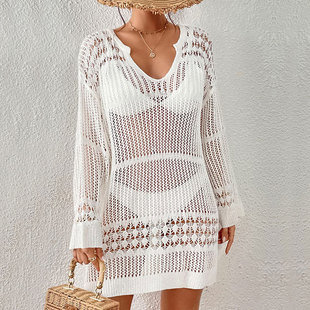 欧美 跨境沙滩罩衫性感弹力收腰波纹镂空度假防晒罩衫泳衣