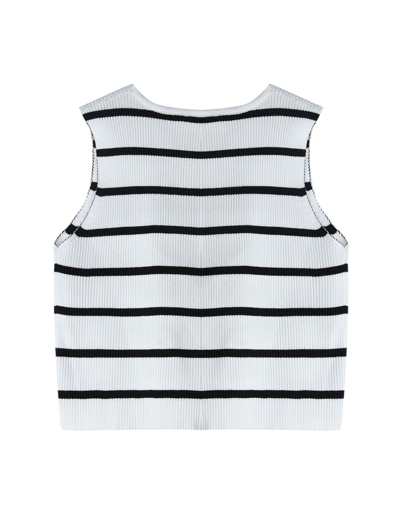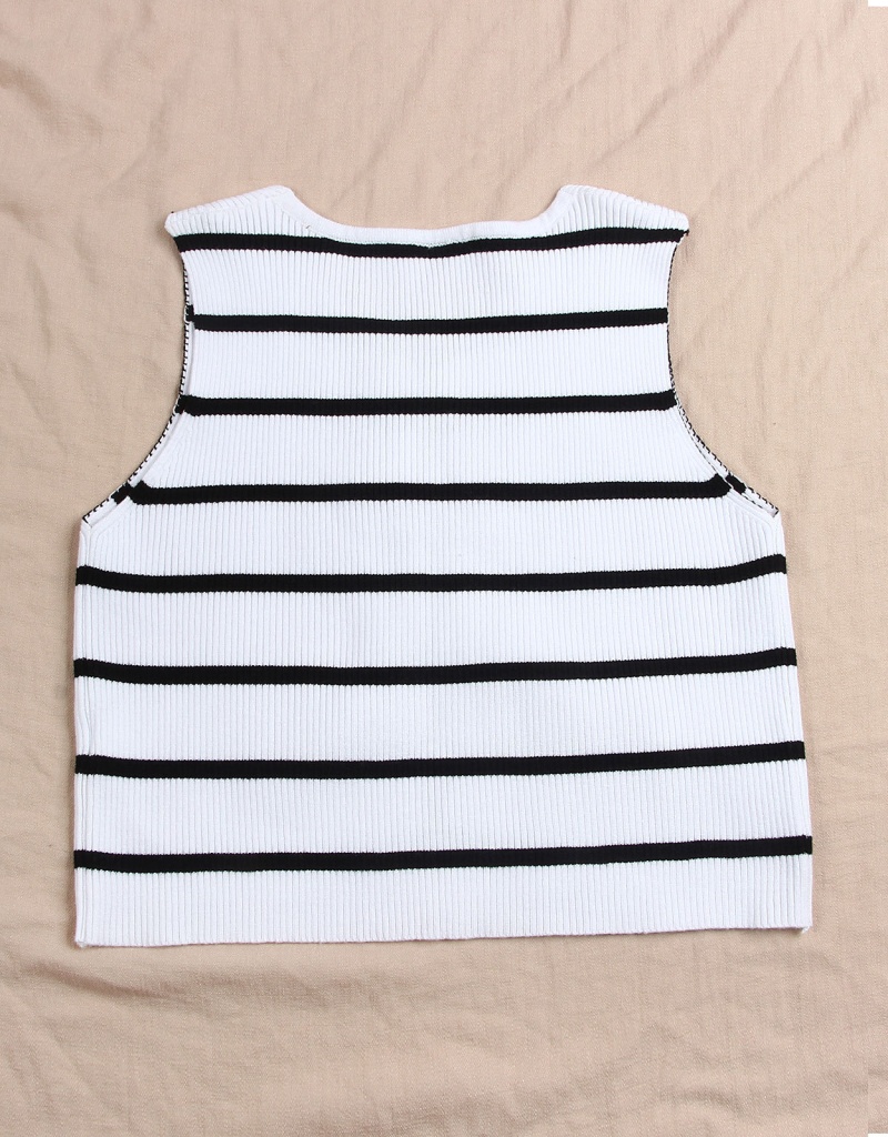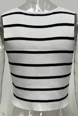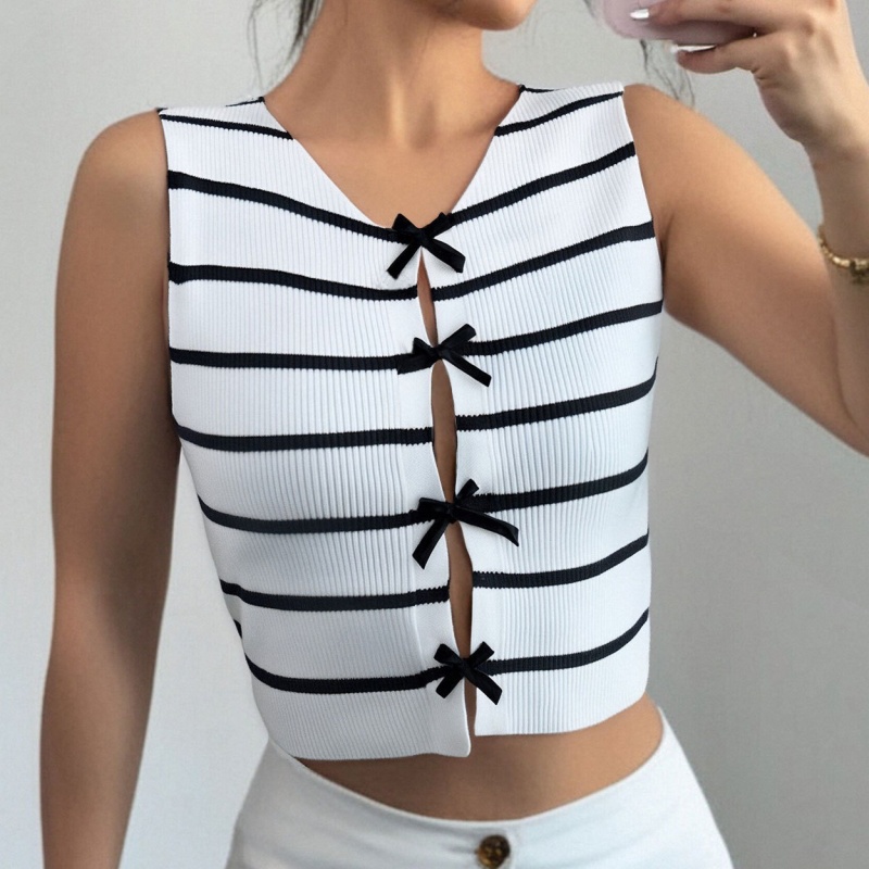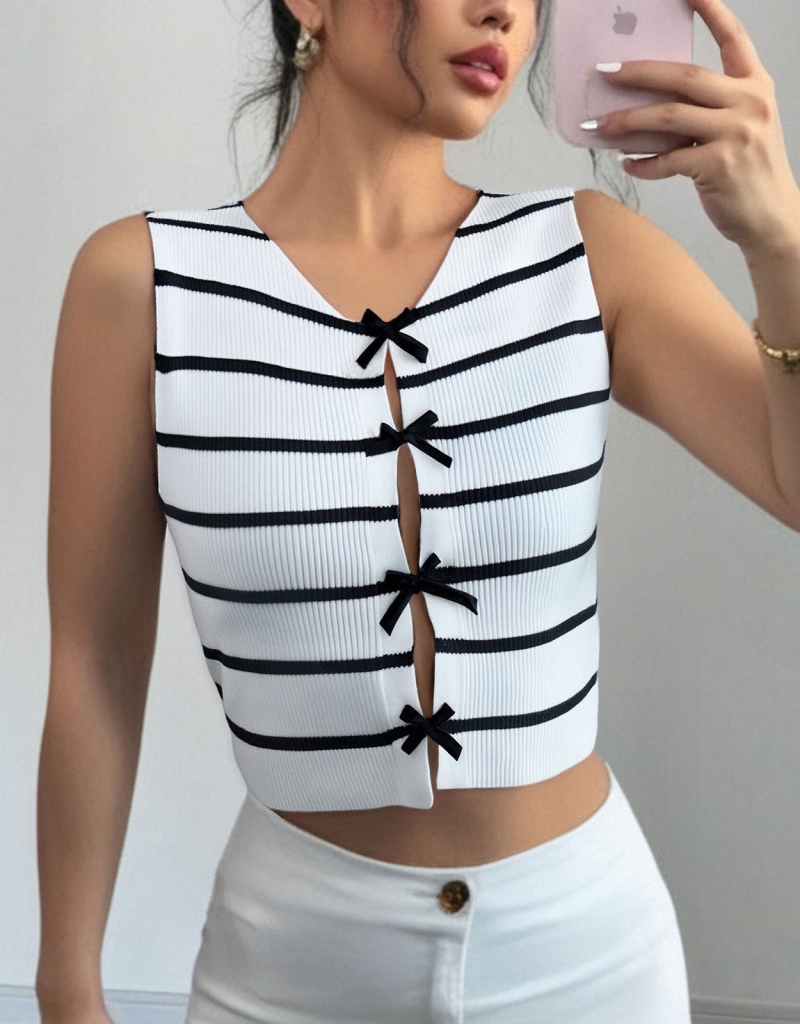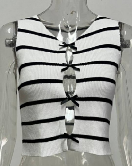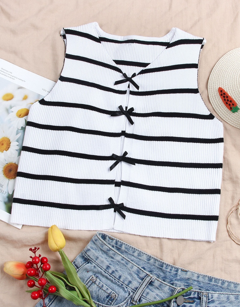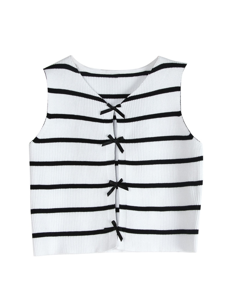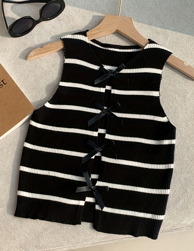 洋洋跨境新款针织衫马甲显瘦条纹撞色蝴蝶结无袖背心上衣女