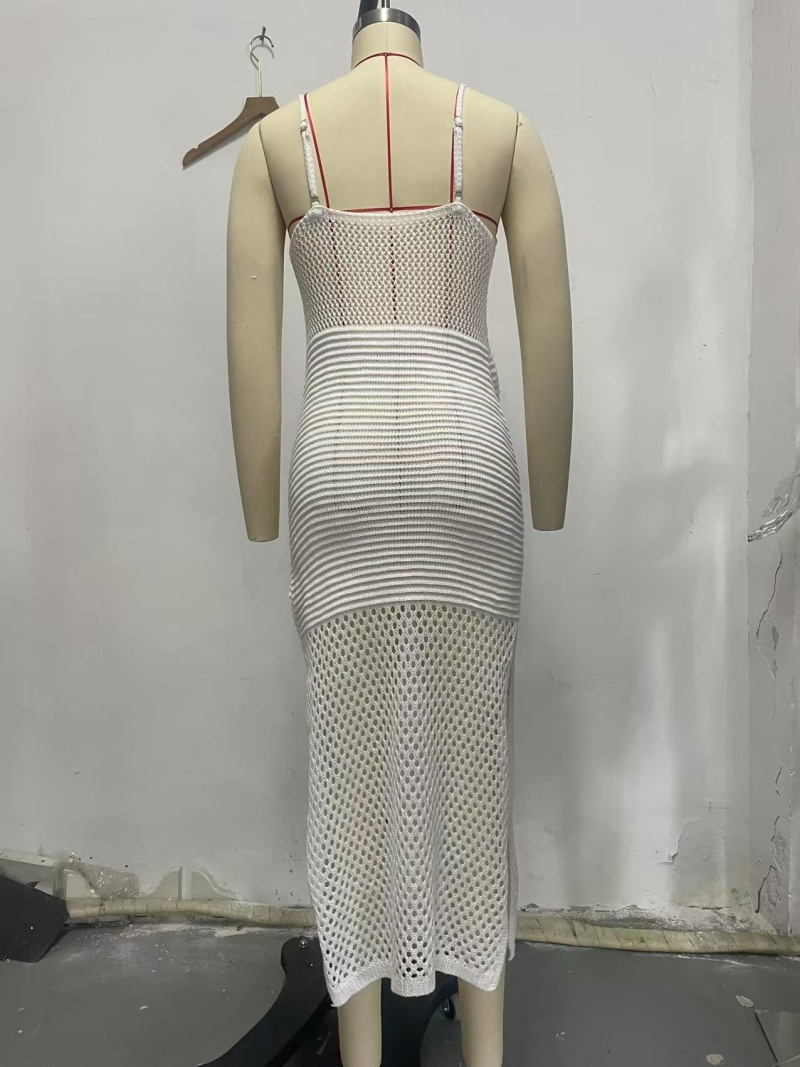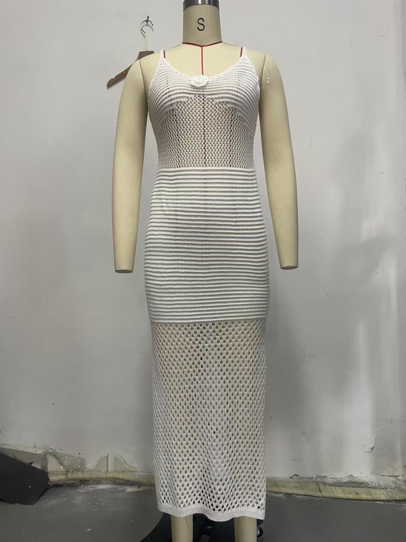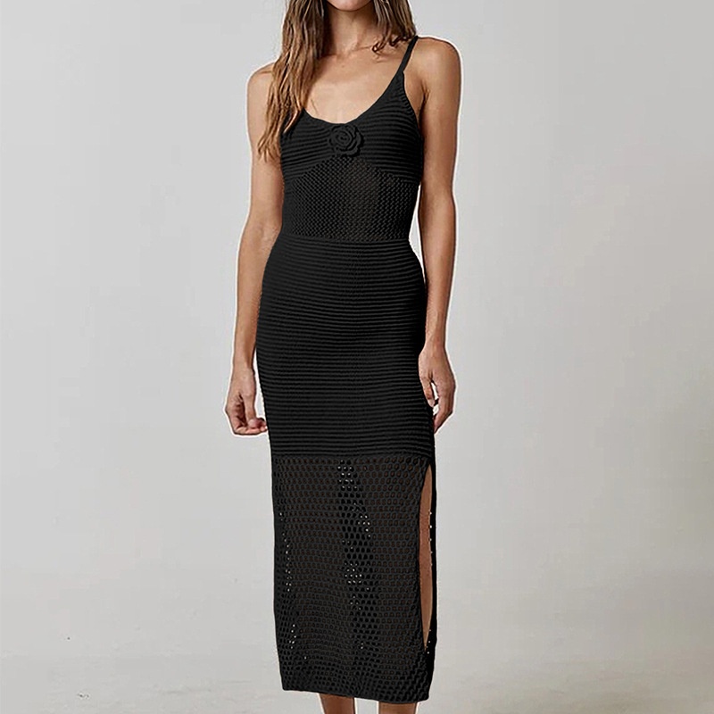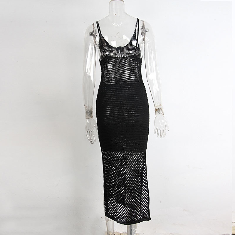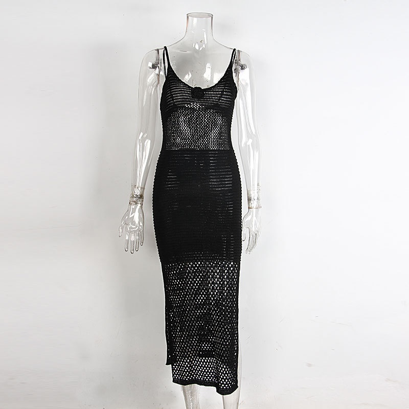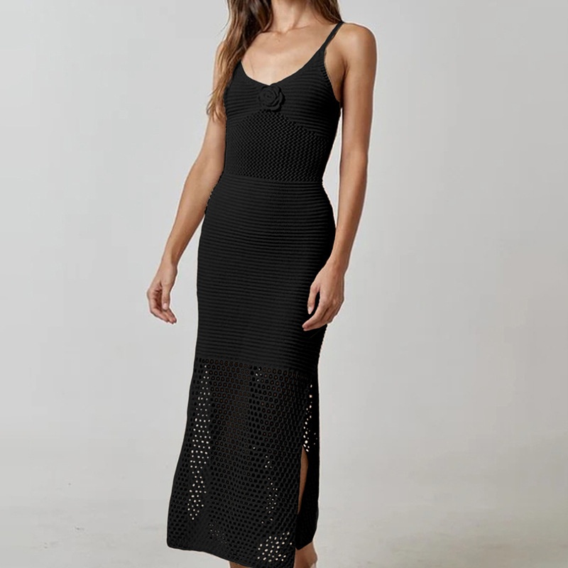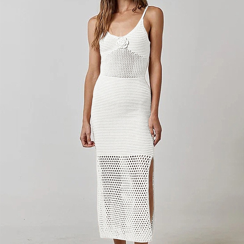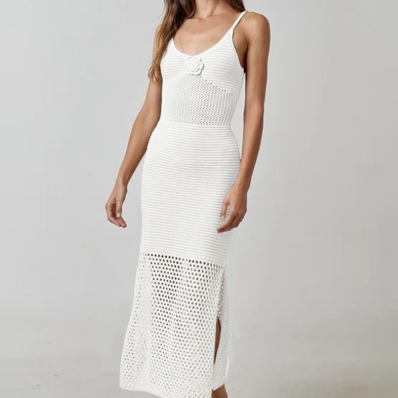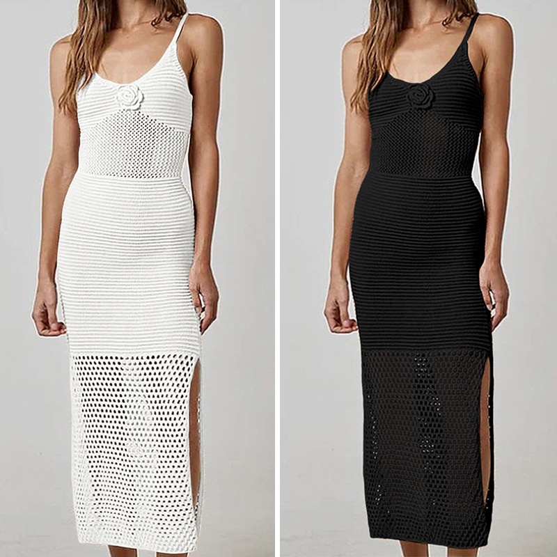 洋洋欧美跨境新款度假钩花侧高开叉可调节吊带镂空沙滩罩衫长裙女
