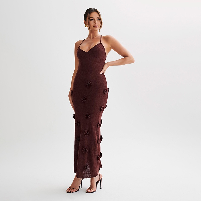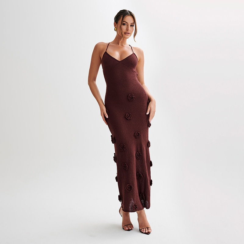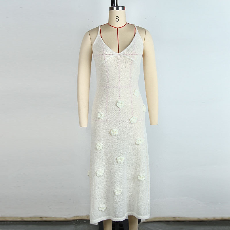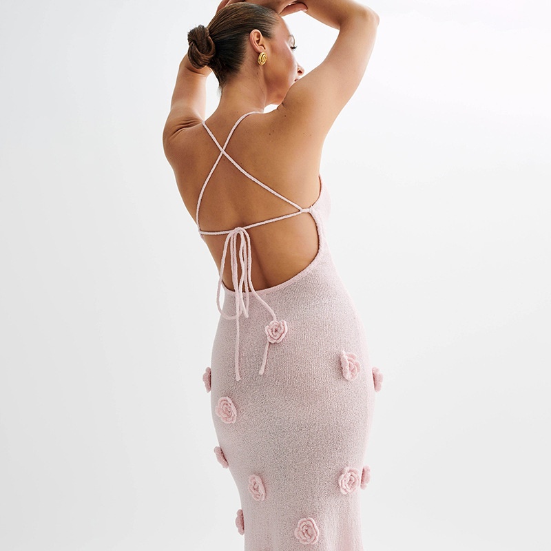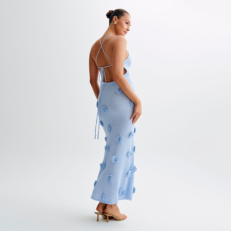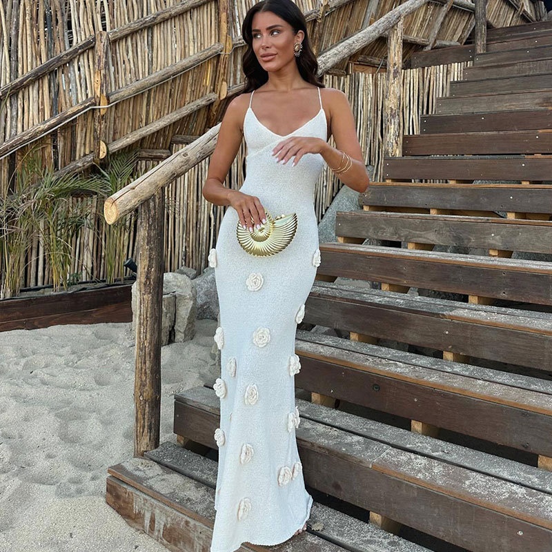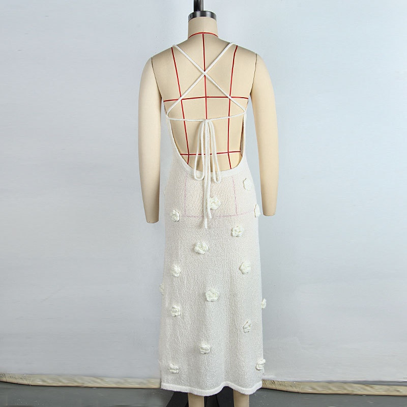 洋洋跨境欧美沙滩罩衫镂空针织绣花吊带裙性感露背系带包臀长裙女