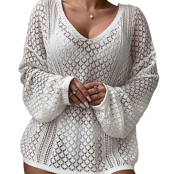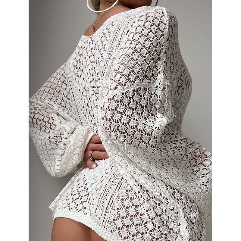 洋洋新款欧美沙滩罩衫跨境镂空针织宽松大码长袖泳衣防晒衣