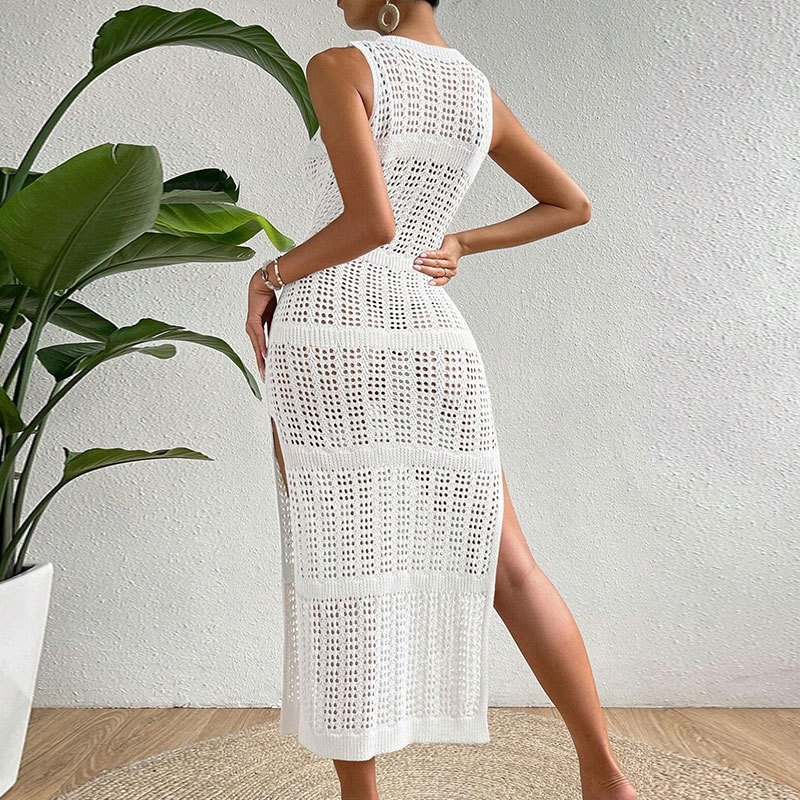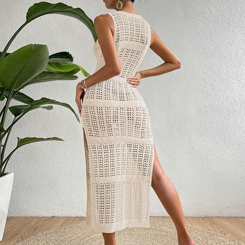 洋洋跨境欧美新款性感针织镂空沙滩罩衫比基尼泳衣女度假罩衫长裙